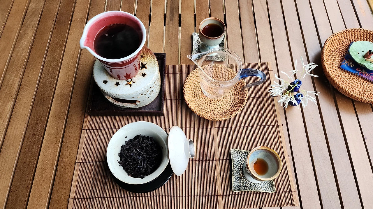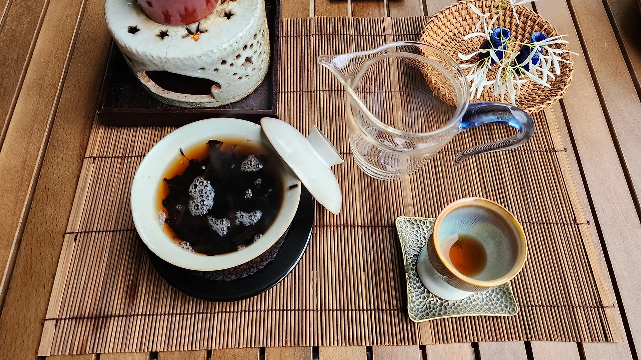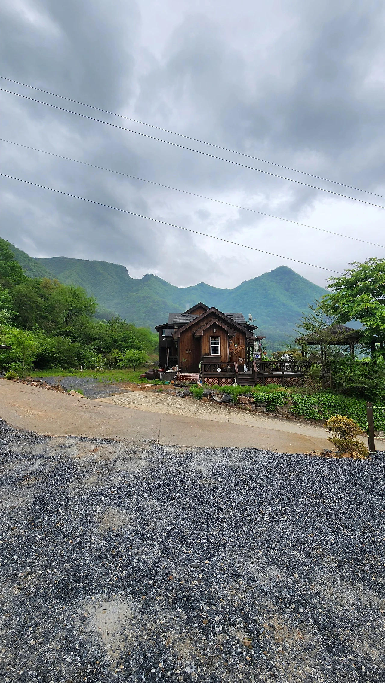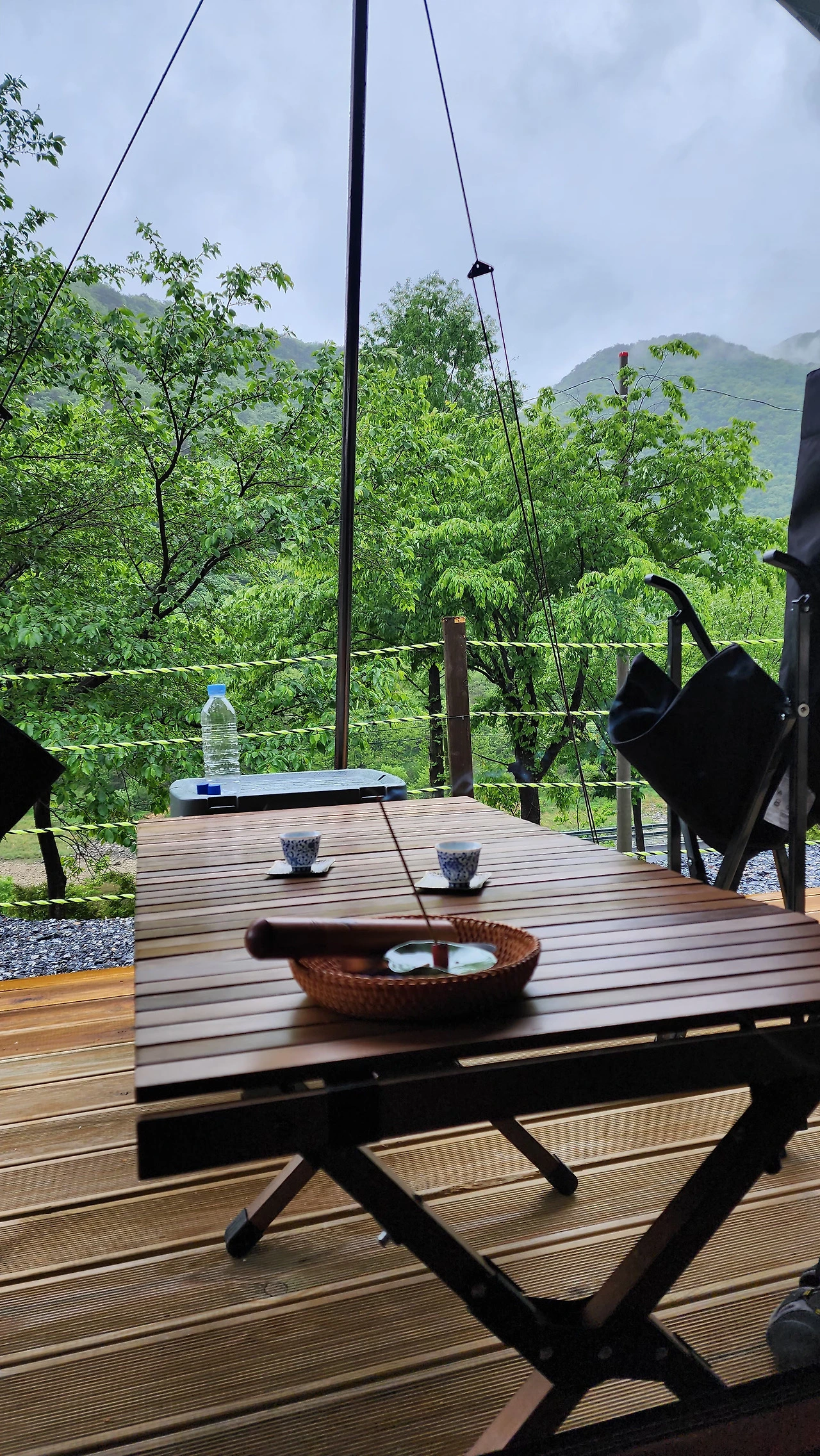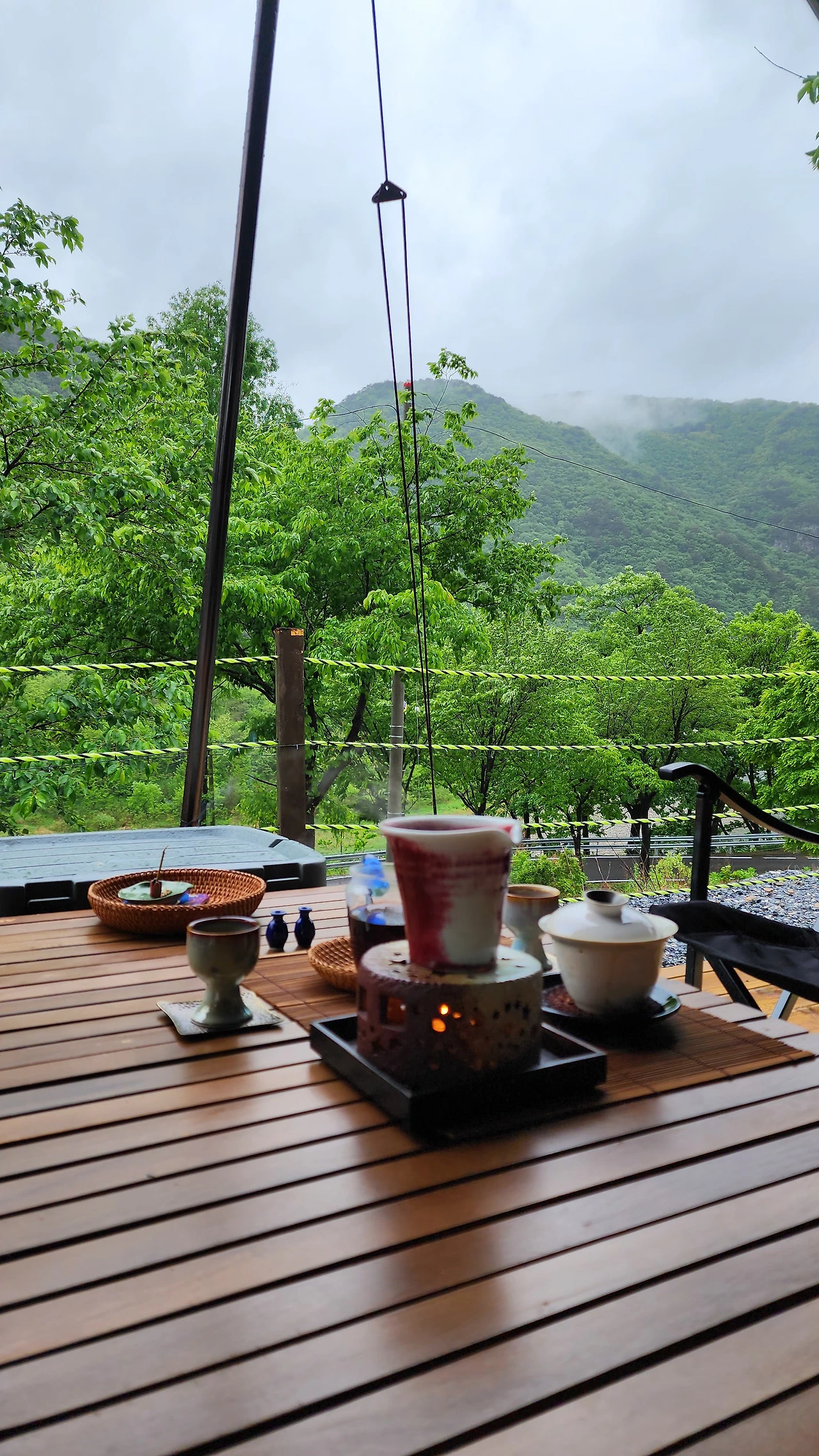 우중에 부는 바람은 찻물을 금방 식힌다. 데크에서는 뜨겁게 우린 차한잔 마시려면 애씀이 있어야 한다. 이것저것 하다 보니 뜨거운 차를 석 잔 정도 마셨다. 뜨거운 차가 몸 안에서 퍼진다. 이렇게 비 오는 가운데 야외에서 비를 감상할 수 있는 캠핑에 대해서 생각하다가 빙긋 웃음이 나온다. 옆의 차박 텐트 위로 빗방울이 궁근다. 그 모습이 한가롭다. 차탁 펼치랴 음악 들으랴 사진 찍으랴 차 우리랴 차 마시랴 글 올리랴, 이러니 한 시간이 금방 지났다. 오후가 한참 지나고 있다. 산마루 능선을 타고 구름이 지난다. 시선이 삼각 모양의 봉우리와 만난다. 마주 보며 한가로운 차 마셔야지 한다.