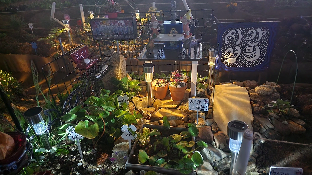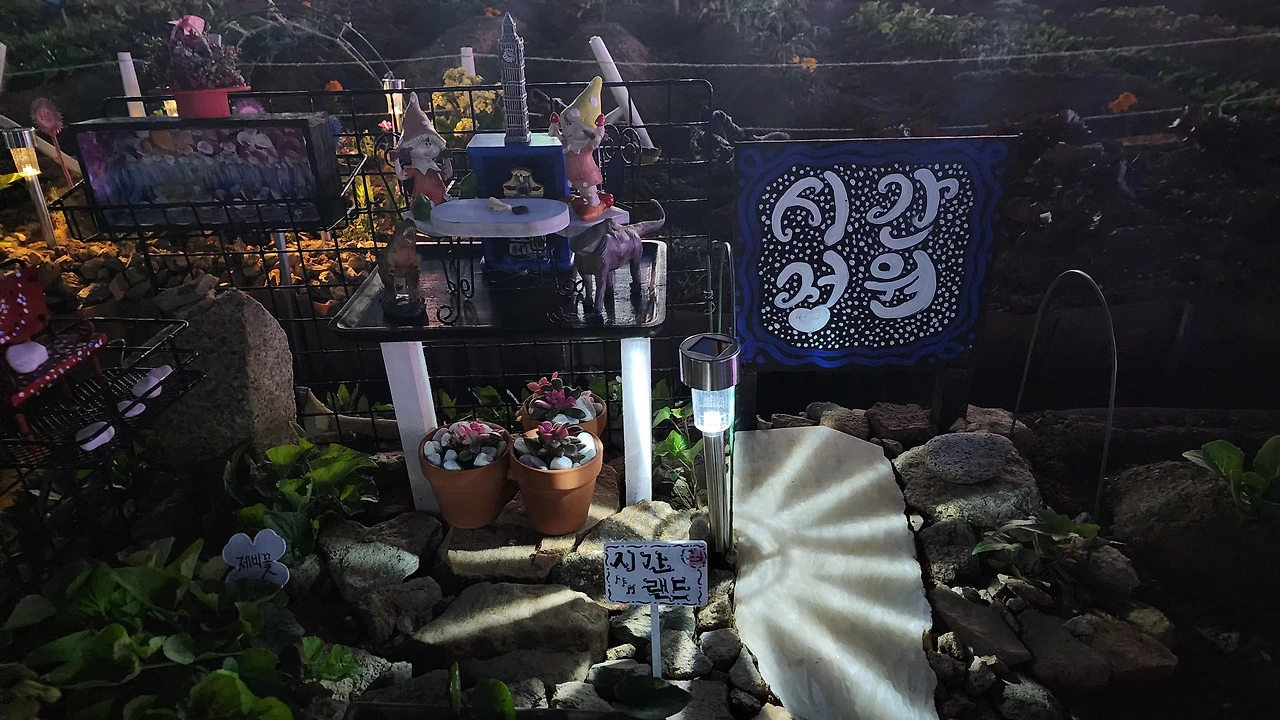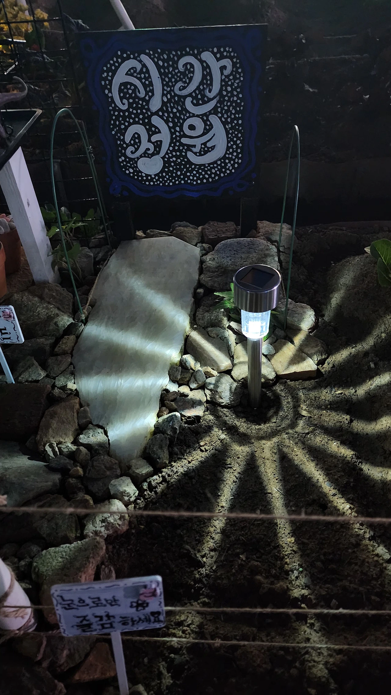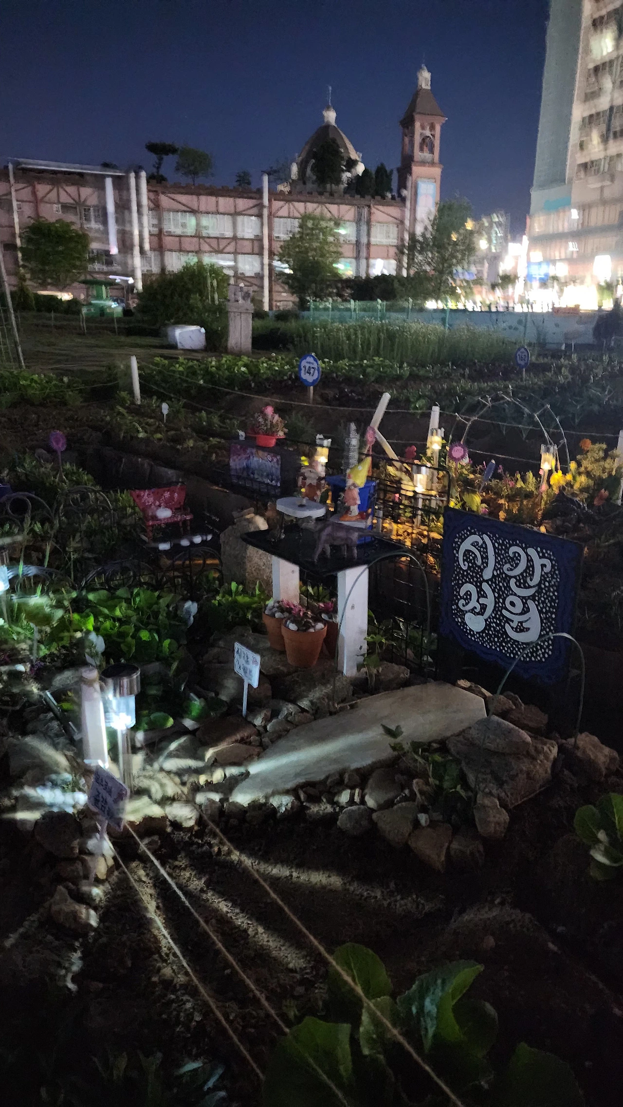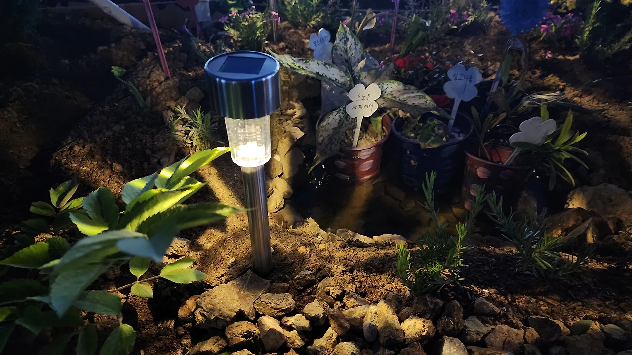 밤 산책을 하자. 비가 온 저녁에도 조명에 불이 들어왔다. 태양열 조명기구 성능이 좋았다. 아주 은은한 불빛이 텃밭 안에 퍼진다. 텃밭에 문명이 발을 들인 순간이다. 자연스러운 그대로의 상태에 대한 짧은 망설임은 있었으나 이웃텃밭들의 은은한 조명이 앙증맞게 귀여웠다. 그렇게 조명기구를 시간정원에 들였다.