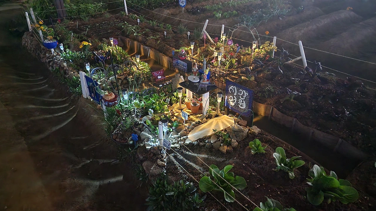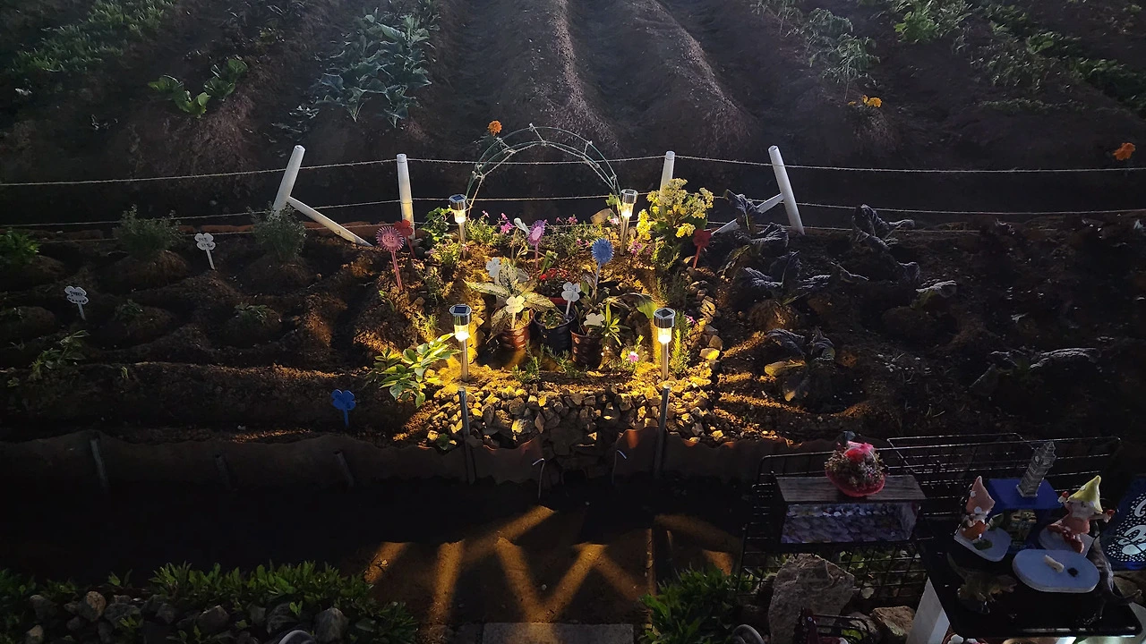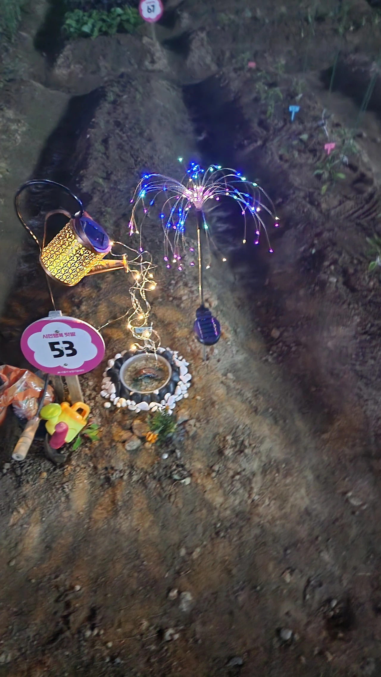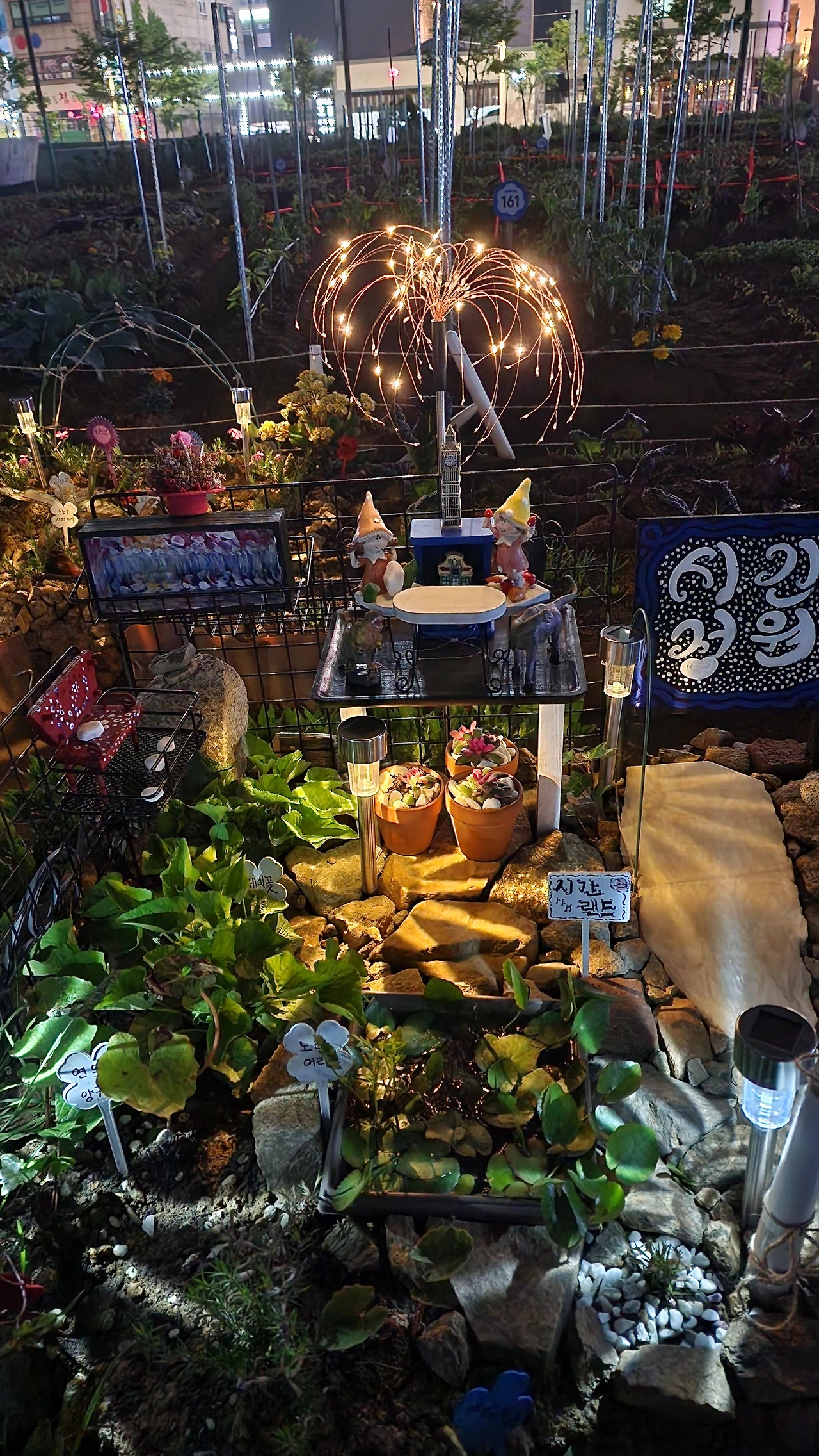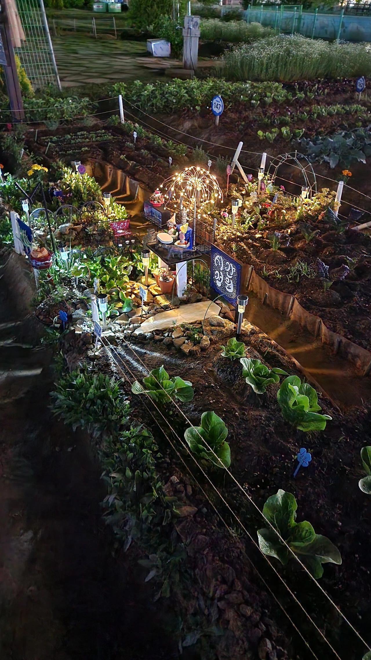 밤 산책을 하자. 비가 온 저녁에도 조명에 불이 들어왔다. 태양열 조명기구 성능이 좋았다. 아주 은은한 불빛이 텃밭 안에 퍼진다. 텃밭에 문명이 발을 들인 순간이다. 자연스러운 그대로의 상태에 대한 짧은 망설임은 있었으나 이웃텃밭들의 은은한 조명이 앙증맞게 귀여웠다. 그렇게 조명기구를 시간정원에 들였다.