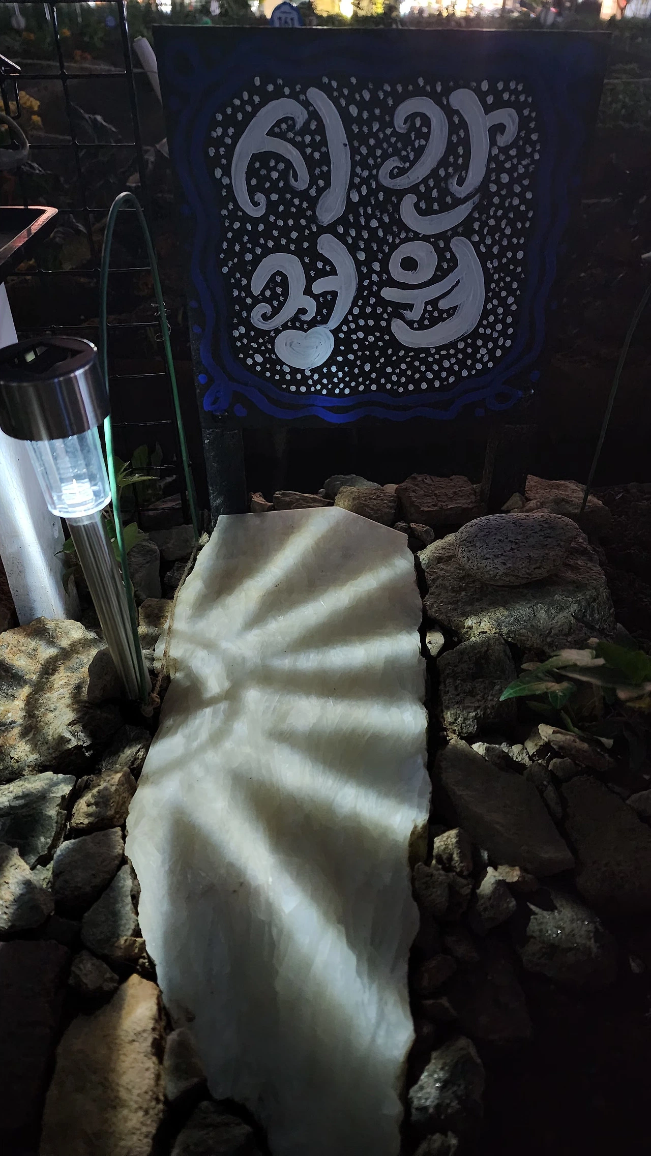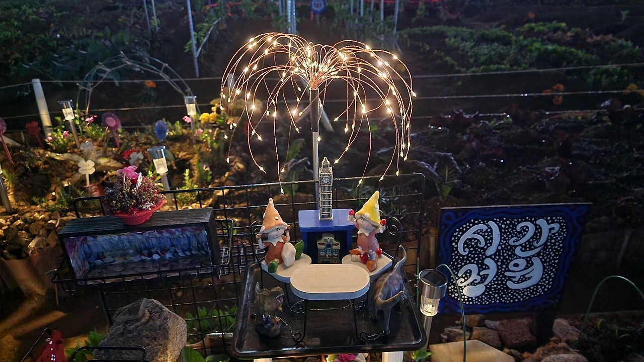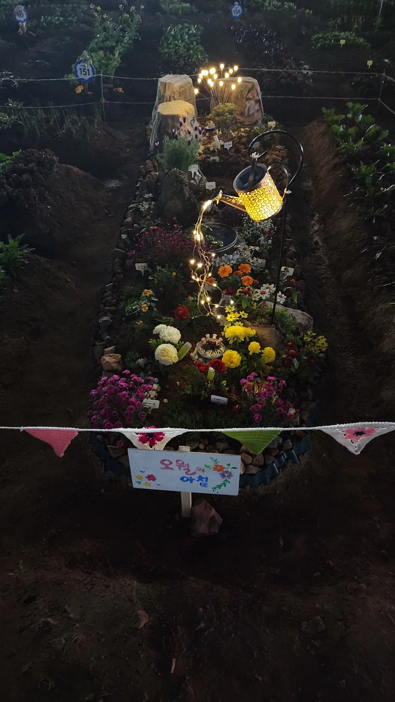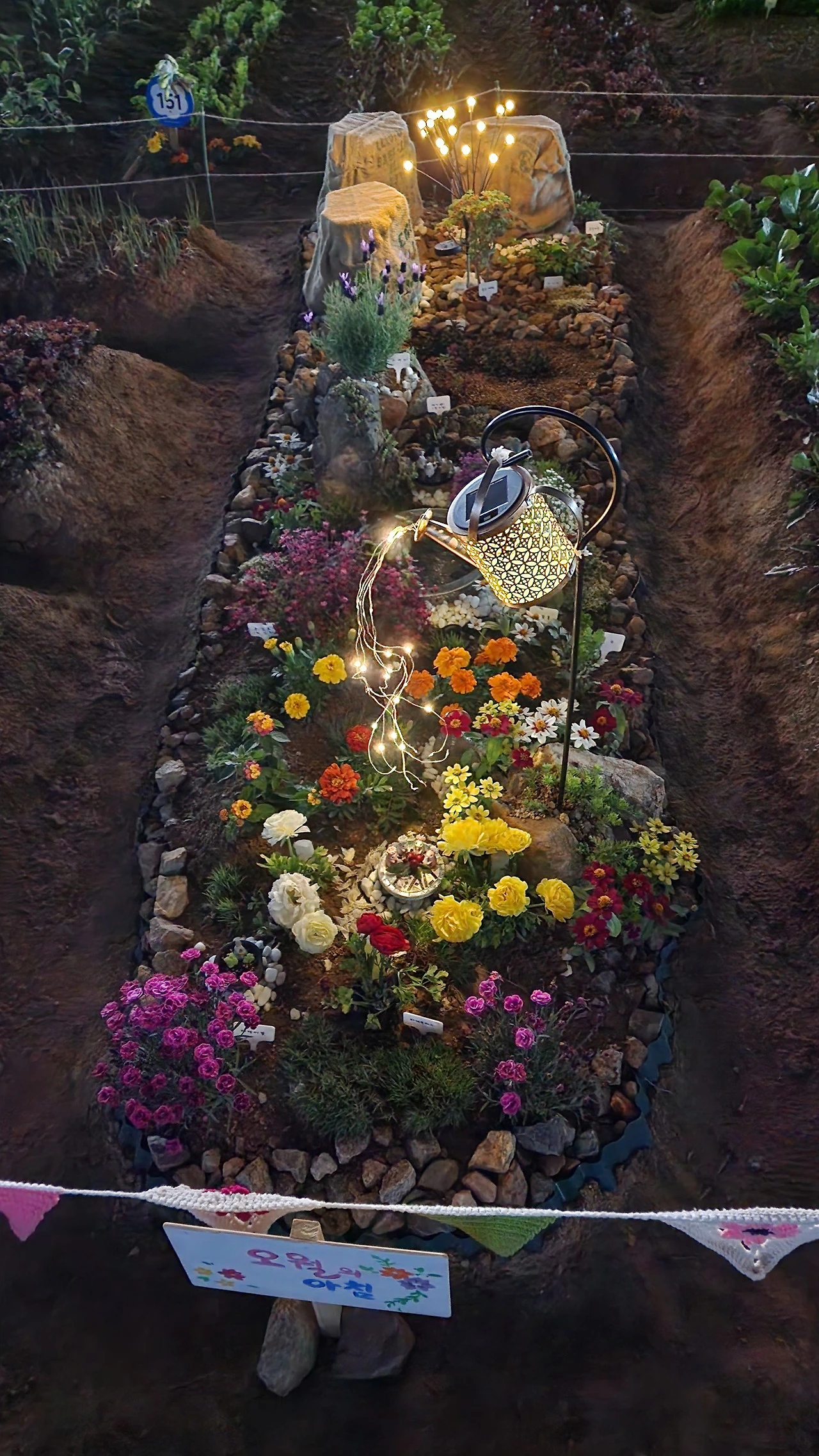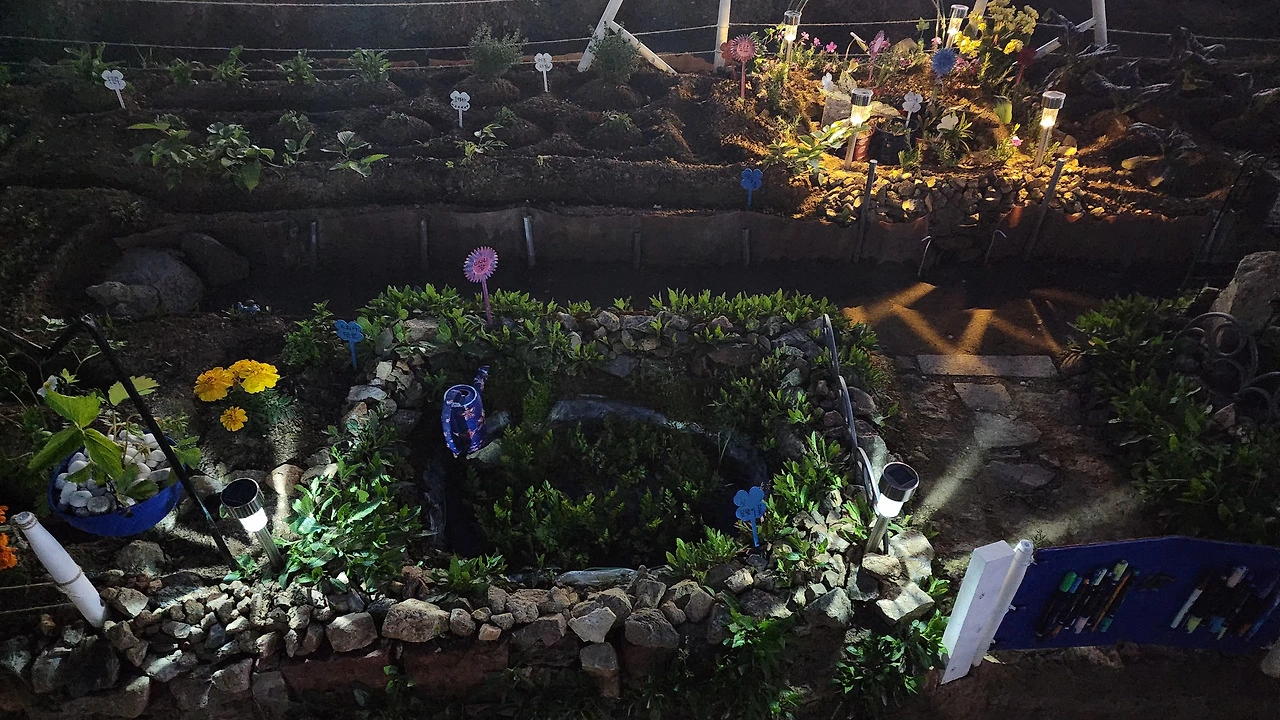밤 산책을 하자. 비가 온 저녁에도 조명에 불이 들어왔다. 태양열 조명기구 성능이 좋았다. 아주 은은한 불빛이 텃밭 안에 퍼진다. 텃밭에 문명이 발을 들인 순간이다. 자연스러운 그대로의 상태에 대한 짧은 망설임은 있었으나 이웃텃밭들의 은은한 조명이 앙증맞게 귀여웠다. 그렇게 조명기구를 시간정원에 들였다.