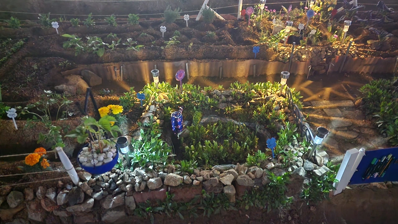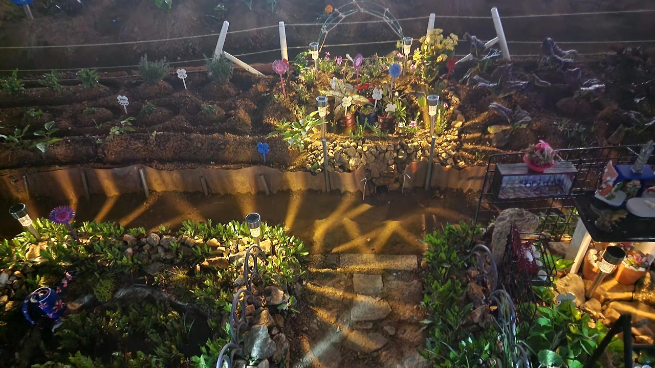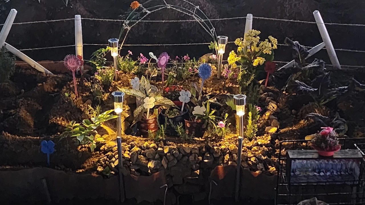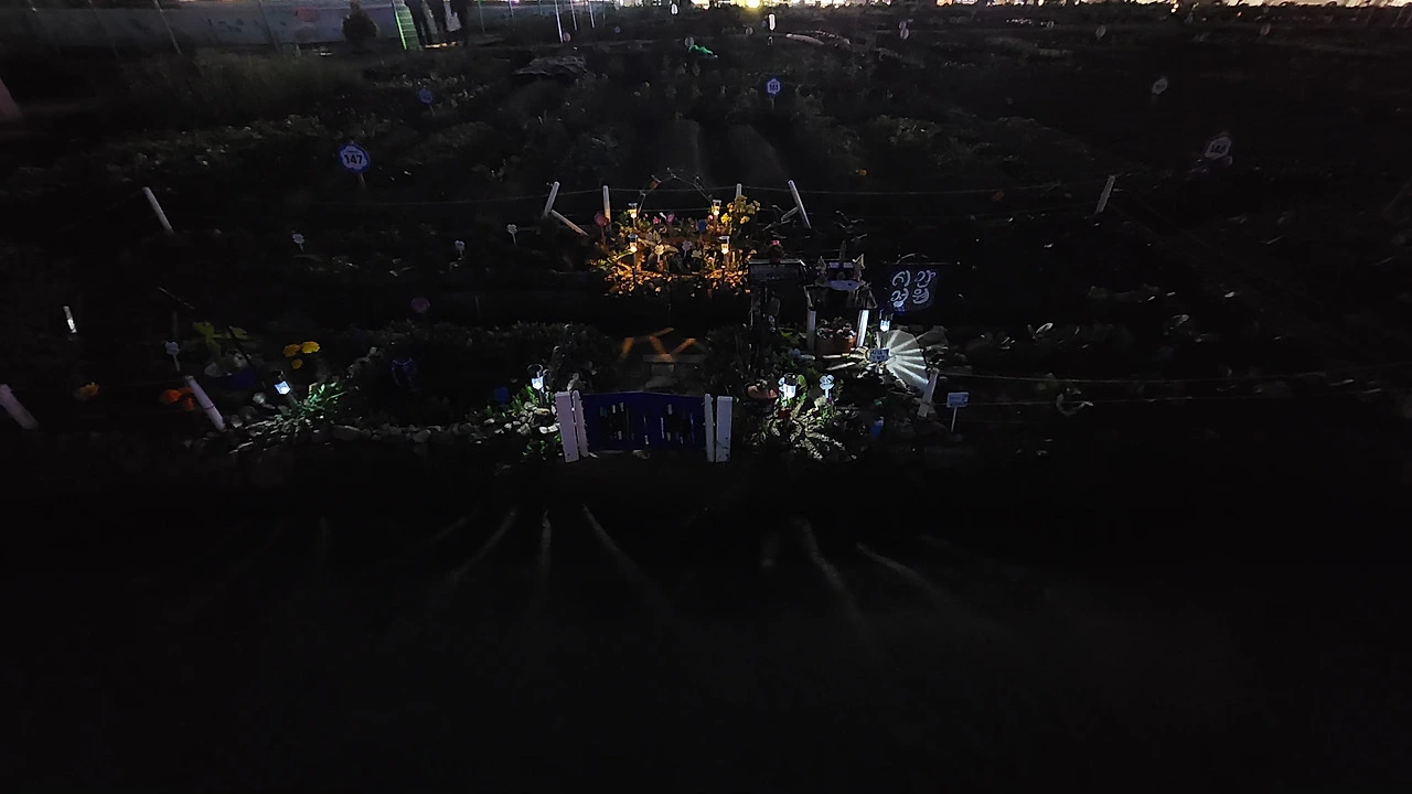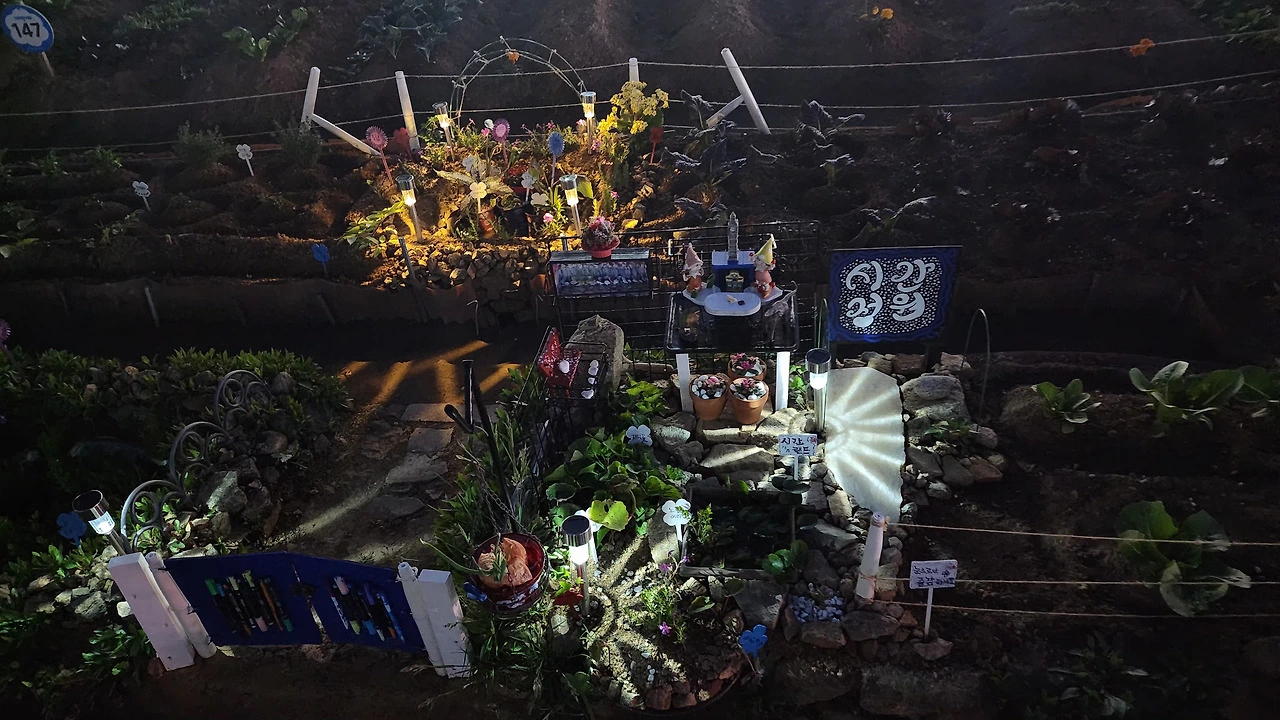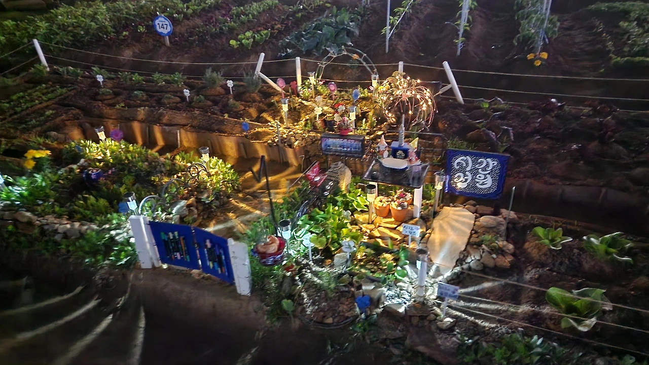 밤 산책을 하자. 비가 온 저녁에도 조명에 불이 들어왔다. 태양열 조명기구 성능이 좋았다. 아주 은은한 불빛이 텃밭 안에 퍼진다. 텃밭에 문명이 발을 들인 순간이다. 자연스러운 그대로의 상태에 대한 짧은 망설임은 있었으나 이웃텃밭들의 은은한 조명이 앙증맞게 귀여웠다. 그렇게 조명기구를 시간정원에 들였다.