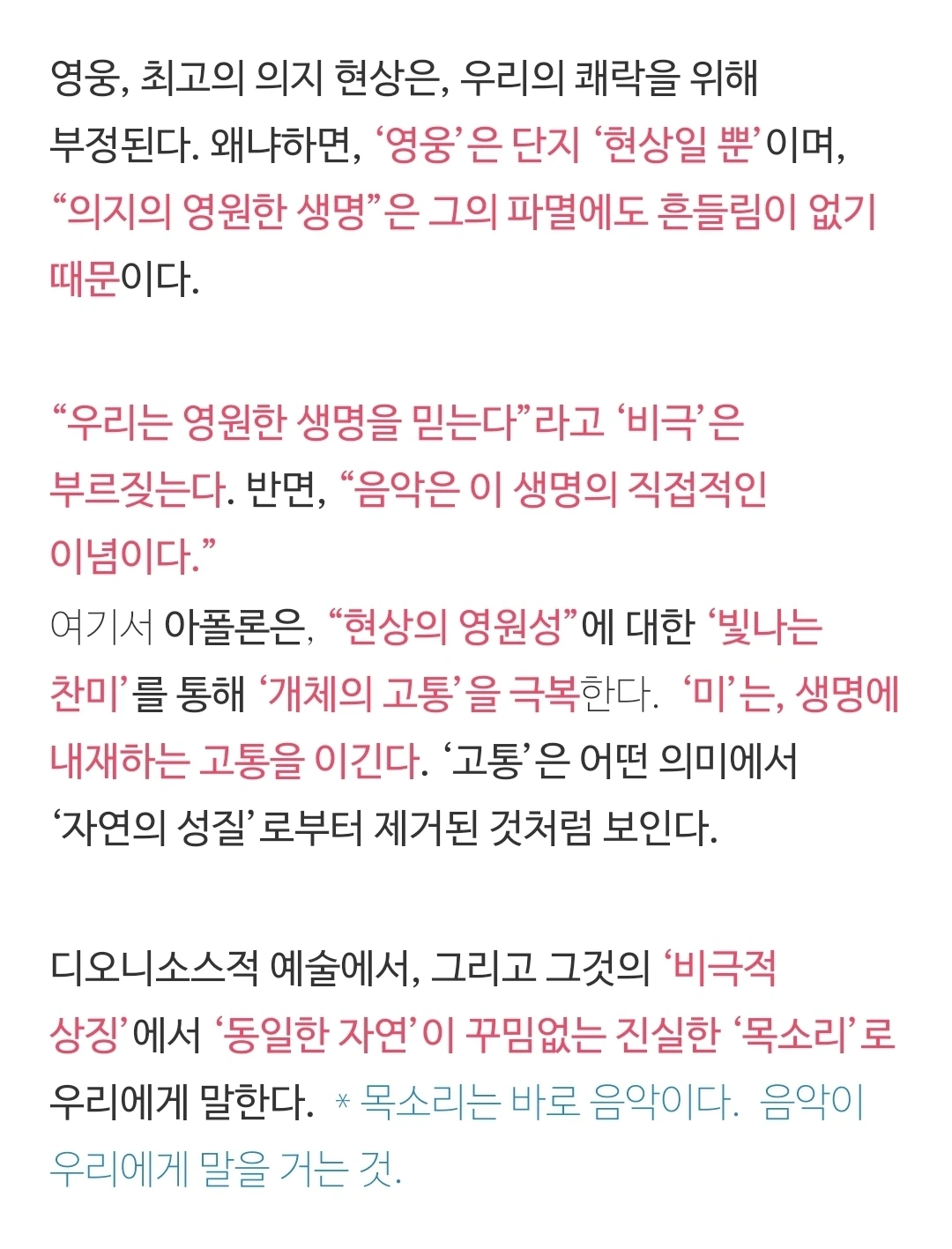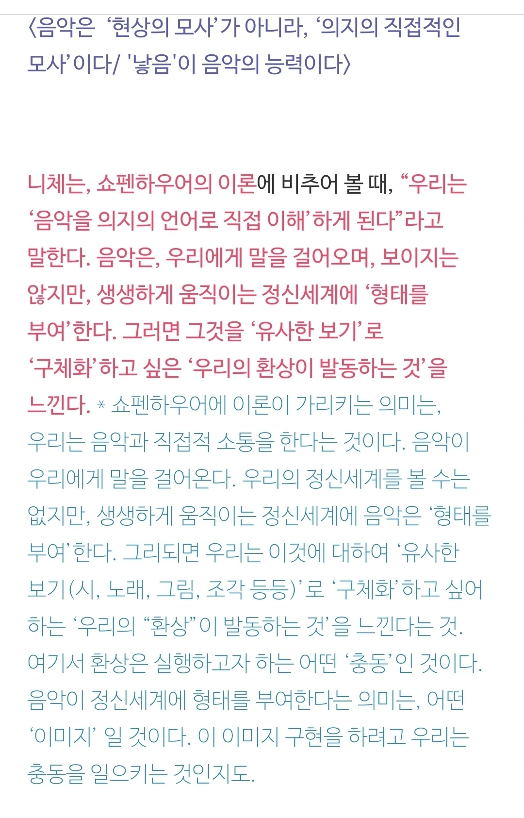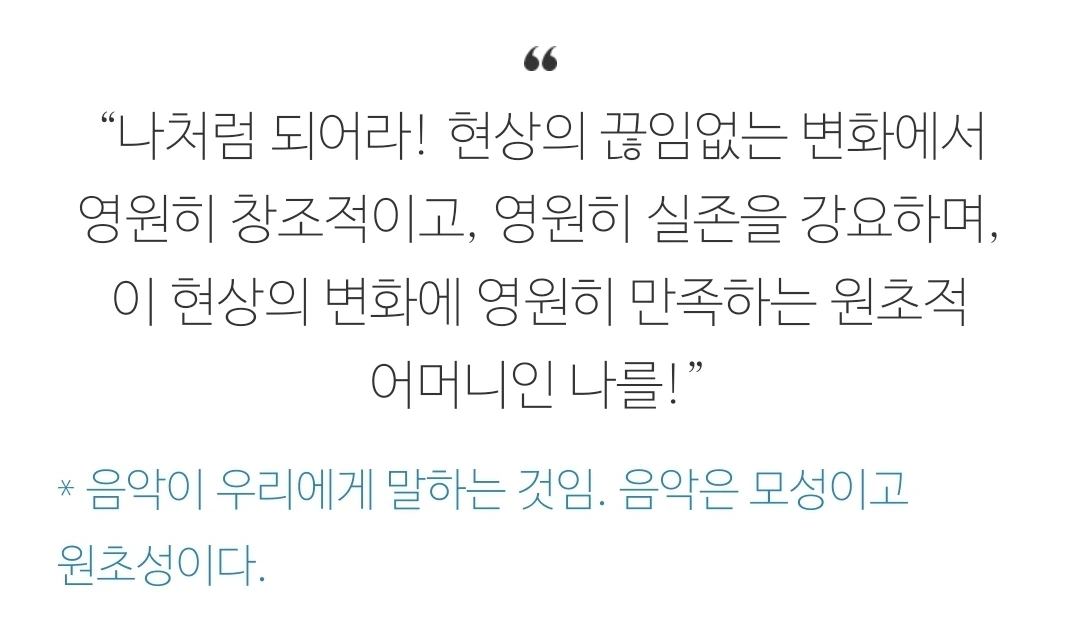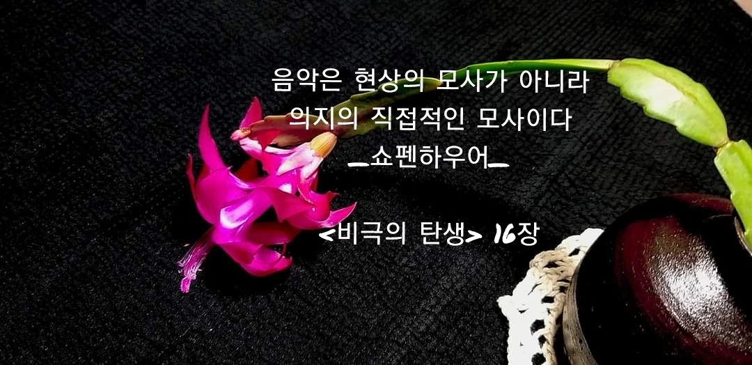 이 관조가 바로 내가 본 송출된 영상의 한 모습이다. 니체는 관조에 디오니소적 충동이 결합되었을 때 음악이 드러난다고 본 것일 것이다. 관조가 어떤 환영상태의 영상(그림)이라면, 음악은 더 깊은 곳에서 올라오는 소리이다. 그 음악은 니체의 <비극의 탄생> 방식으로 말하자면, 근원적인 일자의 목소리일 것이다. 근원적인 일자는 개별화의 고통을 앓고 있다. 그리고 음악은 그 일자의 고통에 대한 비유적 표현이다.