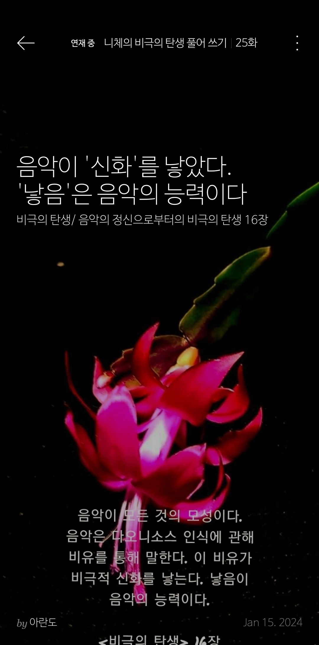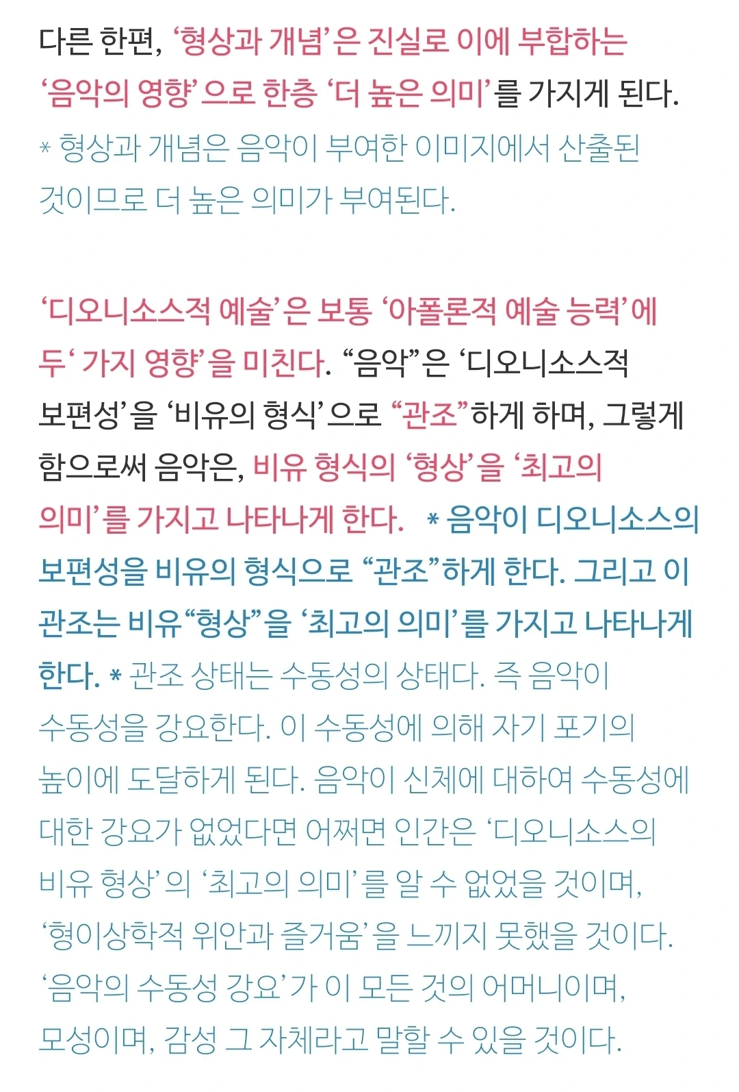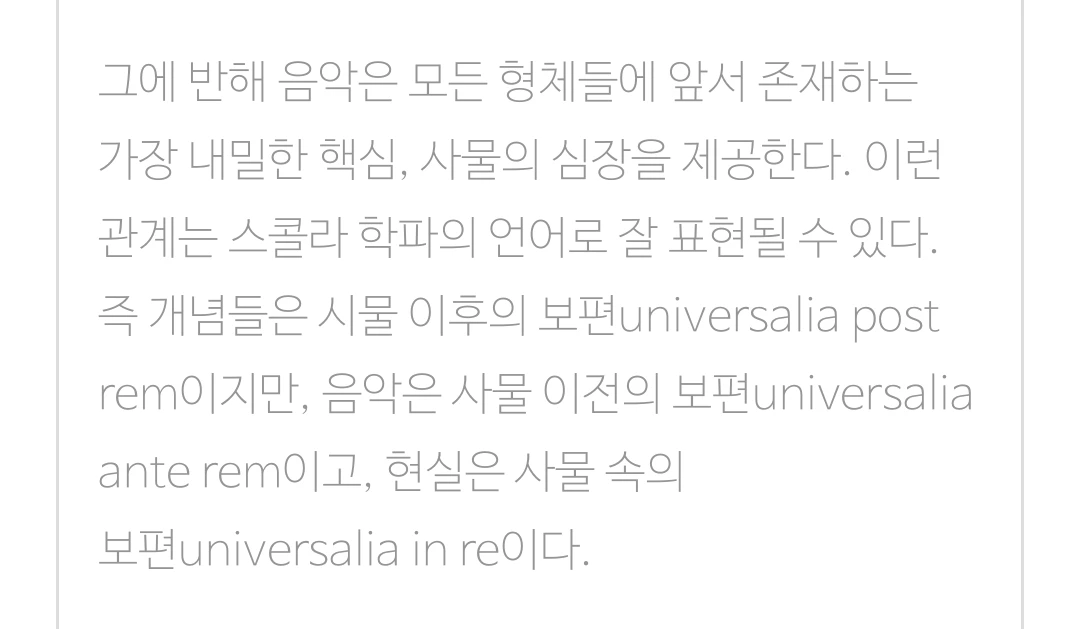 이 관조가 바로 내가 본 송출된 영상의 한 모습이다. 니체는 관조에 디오니소적 충동이 결합되었을 때 음악이 드러난다고 본 것일 것이다. 관조가 어떤 환영상태의 영상(그림)이라면, 음악은 더 깊은 곳에서 올라오는 소리이다. 그 음악은 니체의 <비극의 탄생> 방식으로 말하자면, 근원적인 일자의 목소리일 것이다. 근원적인 일자는 개별화의 고통을 앓고 있다. 그리고 음악은 그 일자의 고통에 대한 비유적 표현이다.