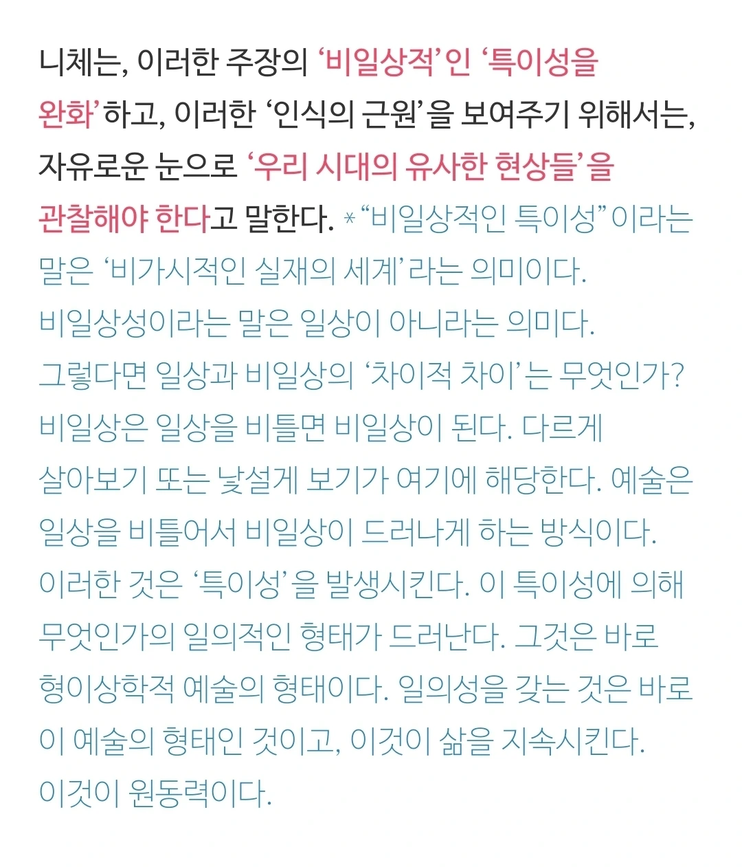 사람은 누구나 같은 신체 작동 기능을 보유하고 있다. 신체가 돌아가는 메커니즘은 같다. 다만 주의를 얼마나 두느냐의 문제이고, 철학의 문제는 모두 인간 감정의 근원인 무의식을 탐구하는 것인데, 타인이 그것에 대해 주의를 두지 않거나 예민하지 않아서 똑같이 보유한 기능에 대해 알아차린 것을 설명하는 데 용감하지 못한다는 것은, 반드시 그것을 알아야 하거나 또는 강요가 될 소지를 미리 염두에 두기 때문일 것이다.