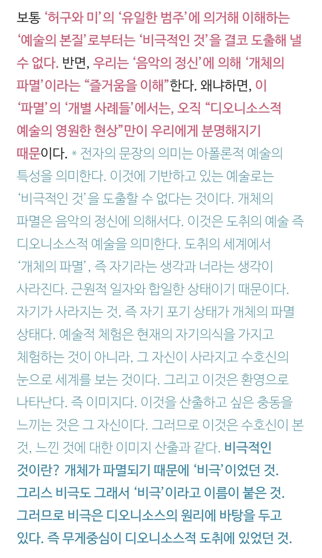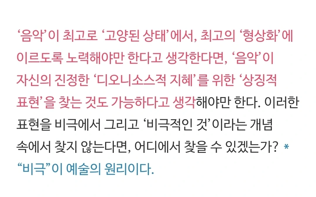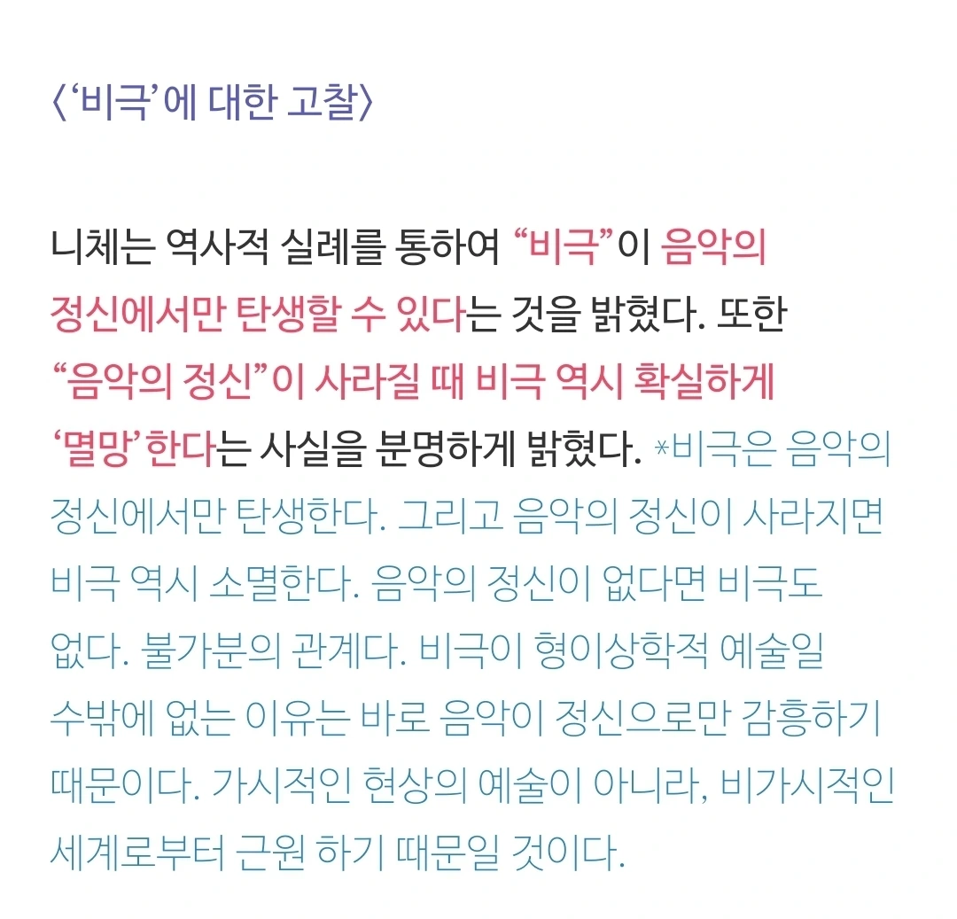 니체는 인간의 이러한 메커니즘을 그리스 예술과 신화에 비추어서, 그 자신이 아폴론적 예술과 디오니소스적 예술이라 이름을 지어 명명하였고, 이 두 예술을 결합하여, '예술의 두 원리'가 작동하는 방식에 대하여 탐구한 것일 것이다. 그러니까 이것은 인간이 어떻게 미를 지각하고 영감을 얻고 또한 예술적 행위와 예술 작품을 생산해 내는지에 대한 메커니즘이라고 볼 수 있을 것이다. 그리스 예술, 비극은 '원형'이다. 원형은 어떤 것을 추적하는 단서를 간직하고 있다. 이 단서를 통하여 원리를 발견한 것일 것이다. 인간 안에서의 예술 작동 원리에 대한 책이 바로 <비극의 탄생>이라고 보아야 하지 않을까.