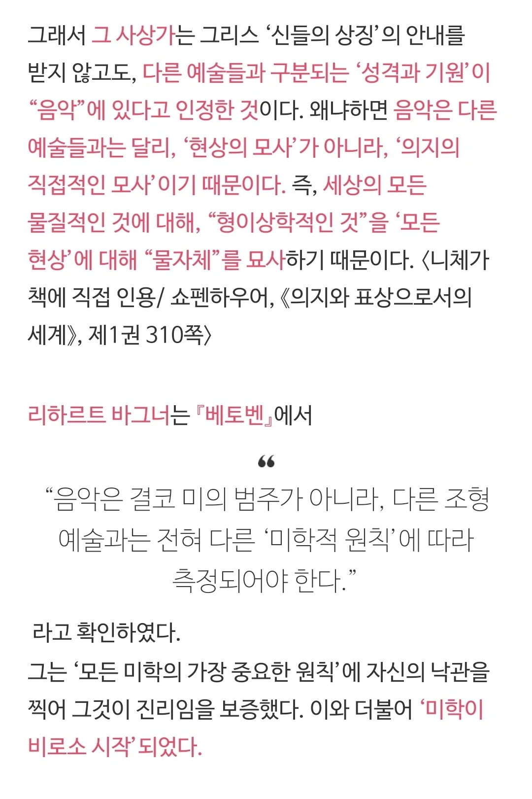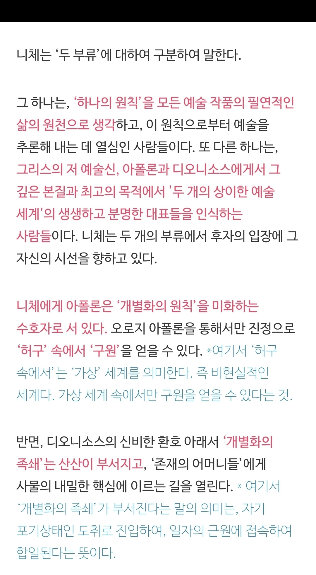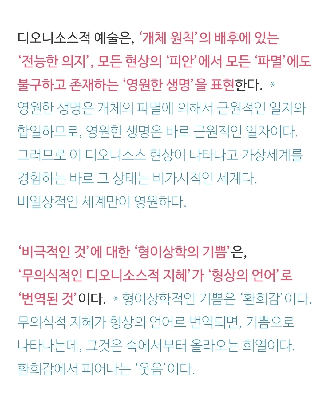 니체는 인간의 이러한 메커니즘을 그리스 예술과 신화에 비추어서, 그 자신이 아폴론적 예술과 디오니소스적 예술이라 이름을 지어 명명하였고, 이 두 예술을 결합하여, '예술의 두 원리'가 작동하는 방식에 대하여 탐구한 것일 것이다. 그러니까 이것은 인간이 어떻게 미를 지각하고 영감을 얻고 또한 예술적 행위와 예술 작품을 생산해 내는지에 대한 메커니즘이라고 볼 수 있을 것이다. 그리스 예술, 비극은 '원형'이다. 원형은 어떤 것을 추적하는 단서를 간직하고 있다. 이 단서를 통하여 원리를 발견한 것일 것이다. 인간 안에서의 예술 작동 원리에 대한 책이 바로 <비극의 탄생>이라고 보아야 하지 않을까.