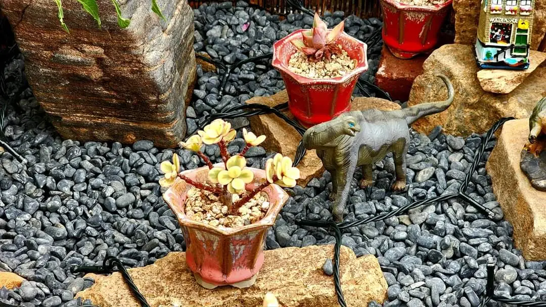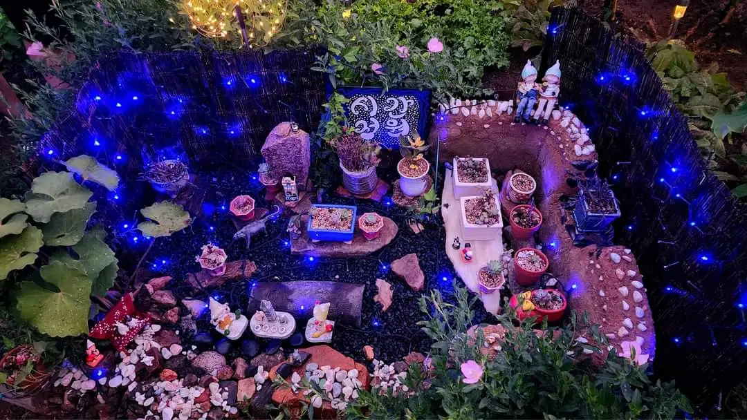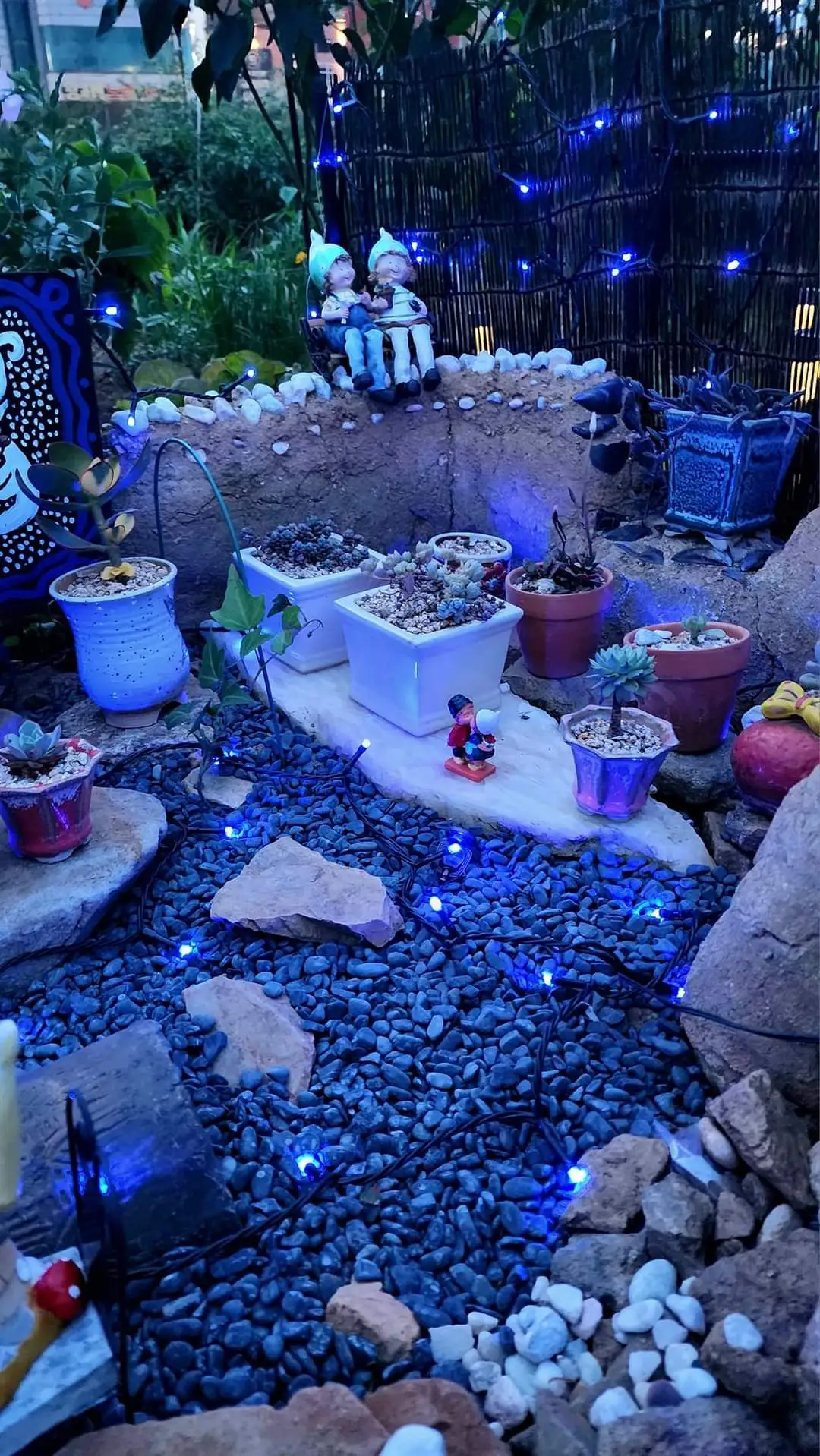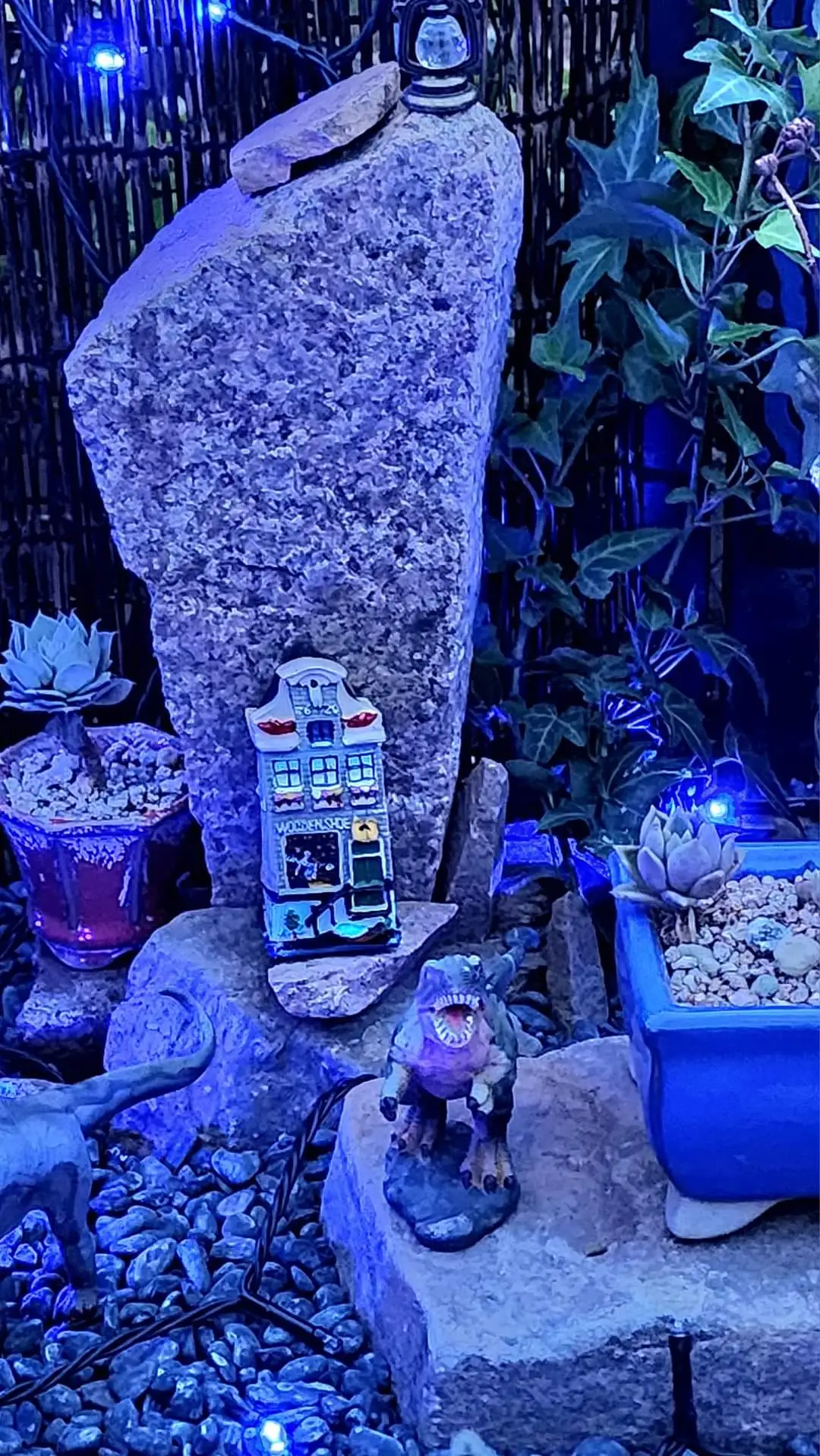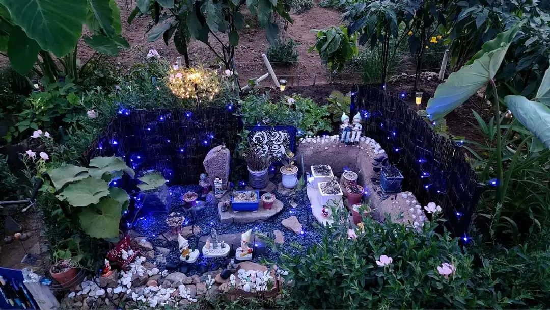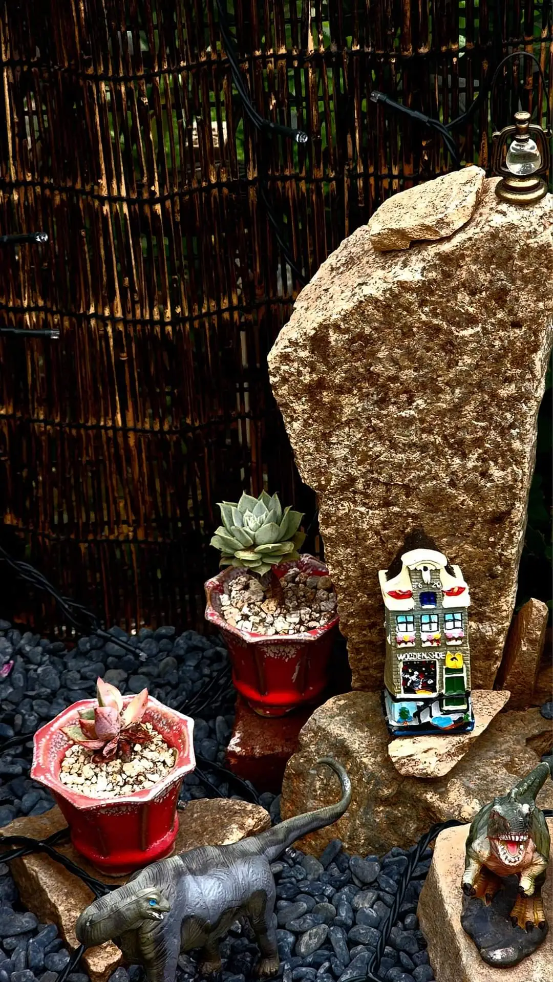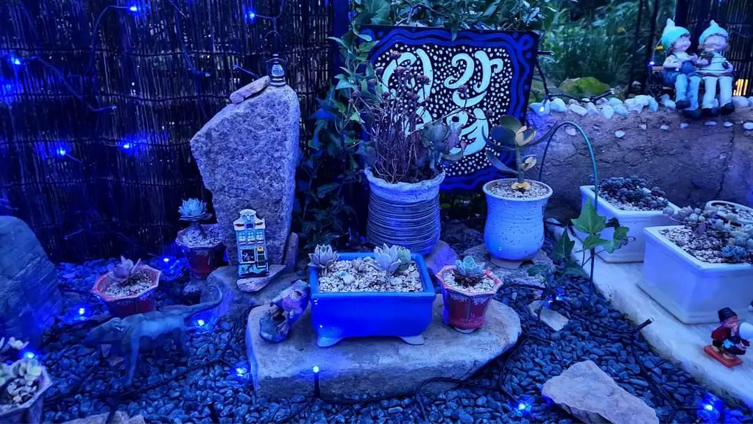 다육들을 돌 받침 위에 배열하였다. 미니어처들을 하나씩 자리를 잡아 주었다. 아이들이 가져다 놓은 미니어처 몇 개도 설치했다. 박농민은 별빛 조명을 설치했다.