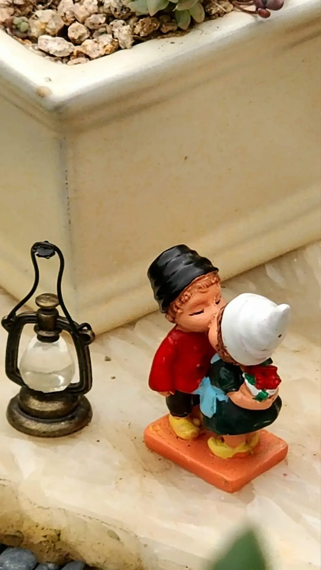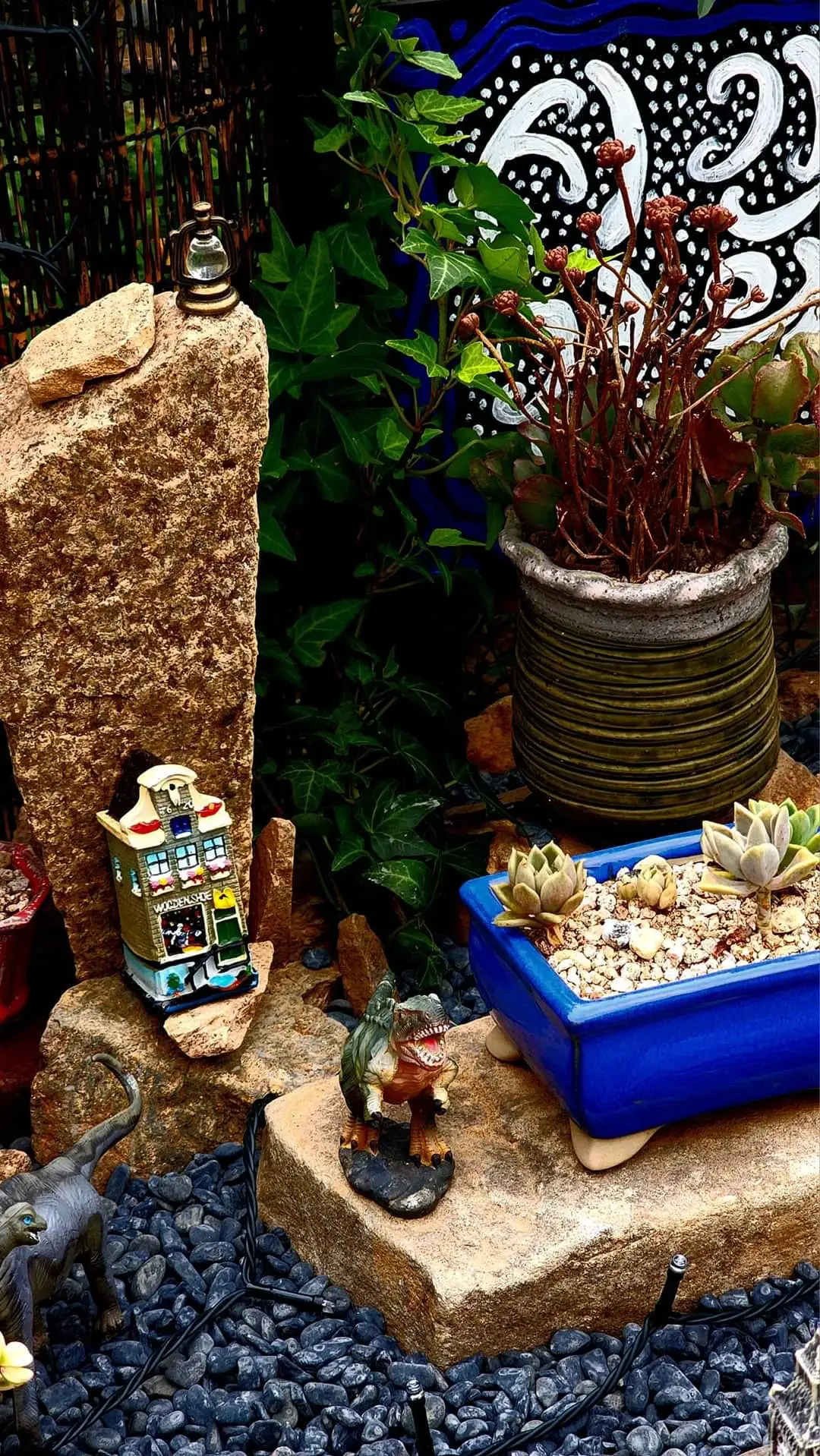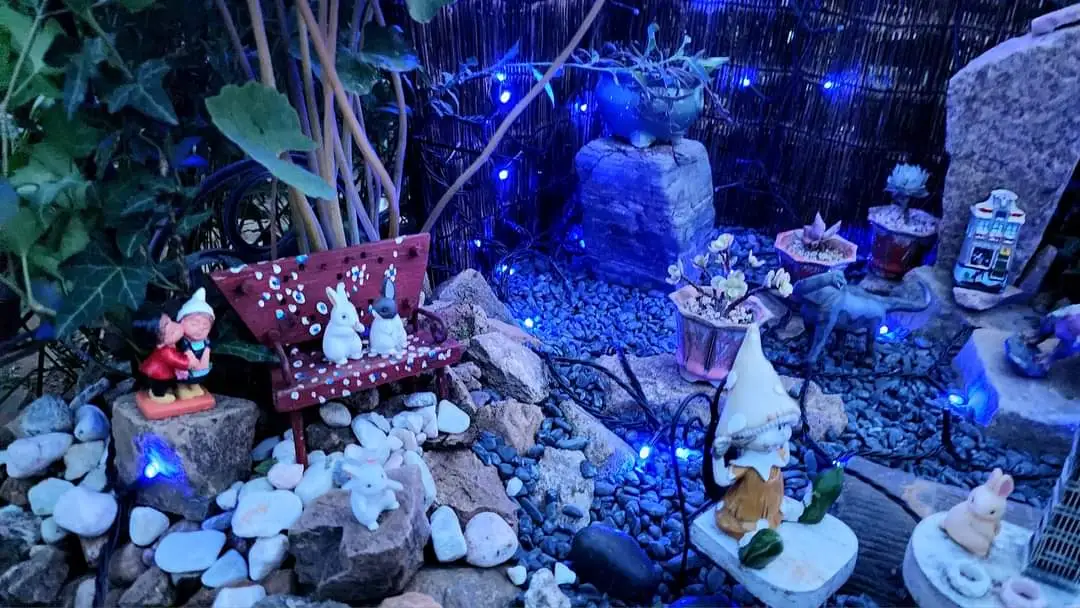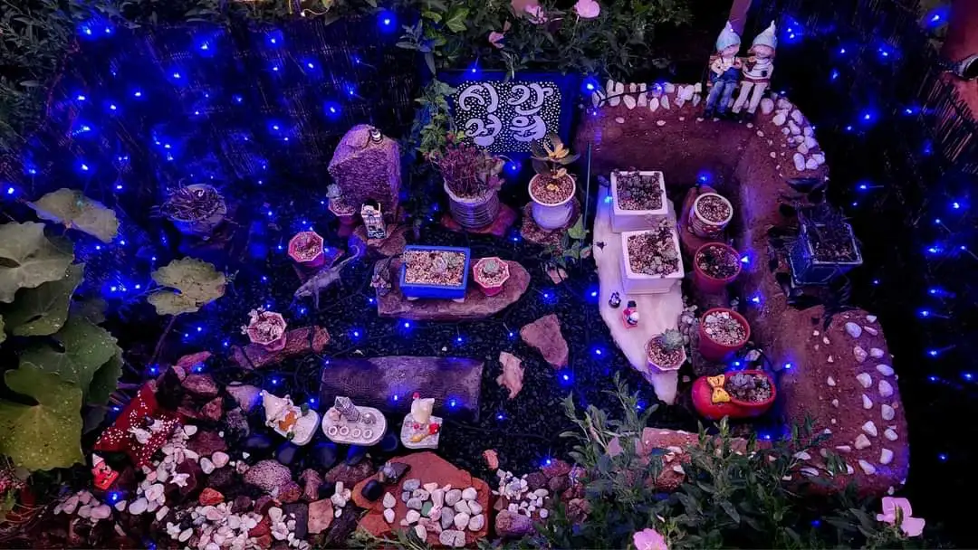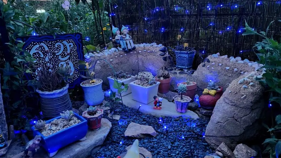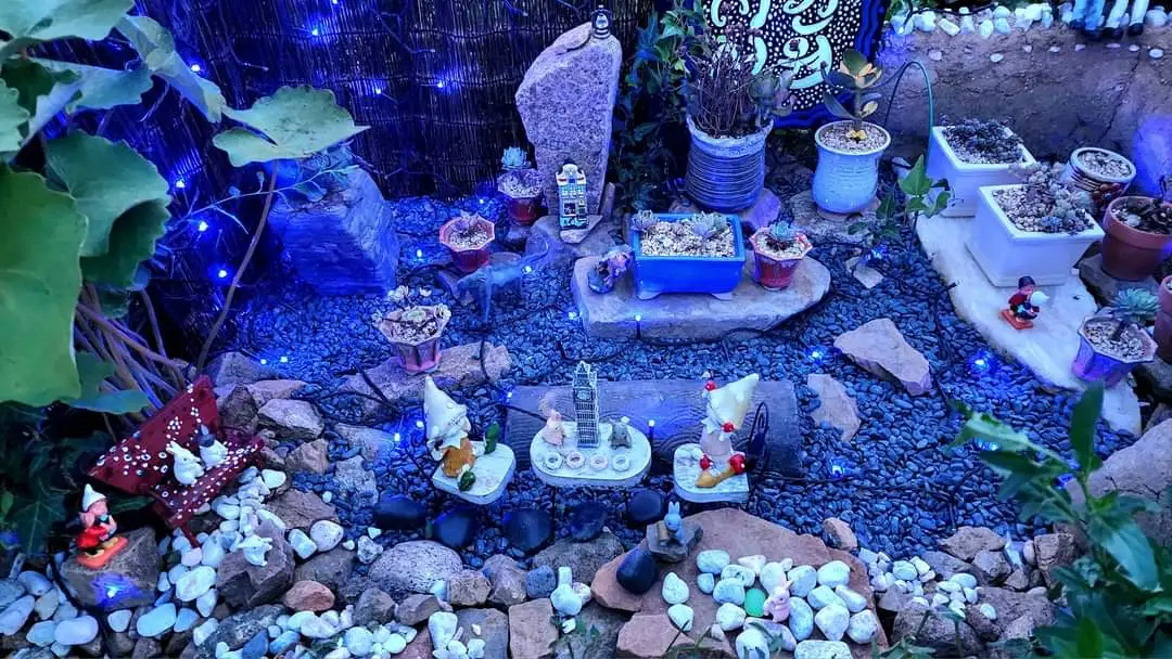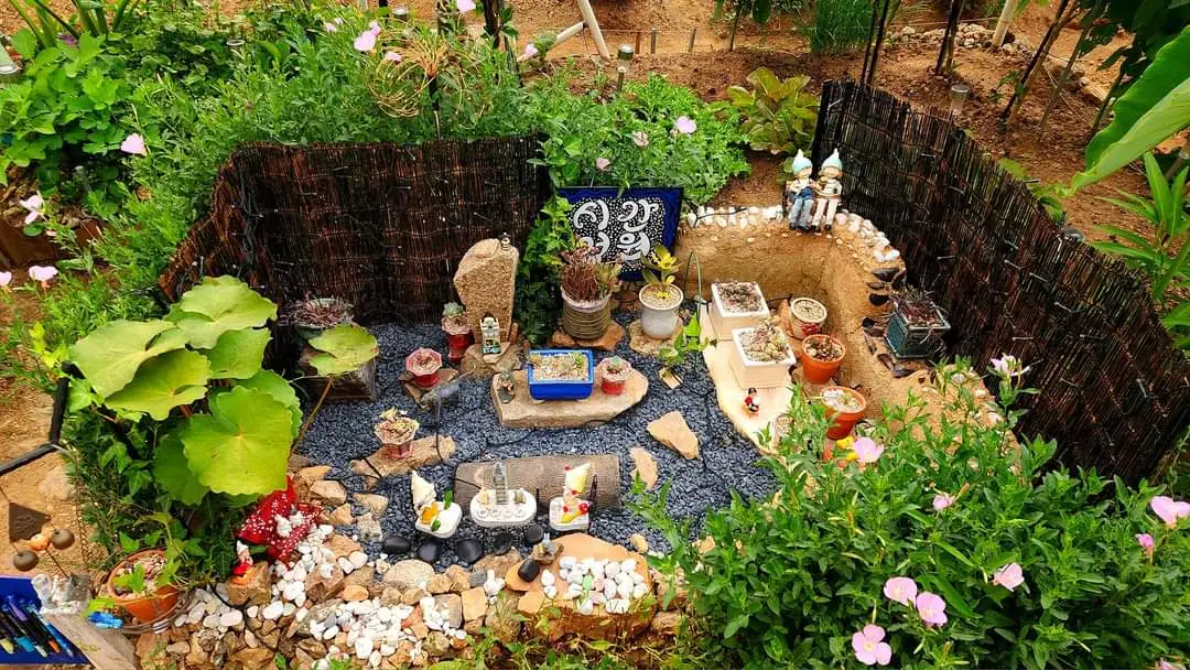 다육들을 돌 받침 위에 배열하였다. 미니어처들을 하나씩 자리를 잡아 주었다. 아이들이 가져다 놓은 미니어처 몇 개도 설치했다. 박농민은 별빛 조명을 설치했다.