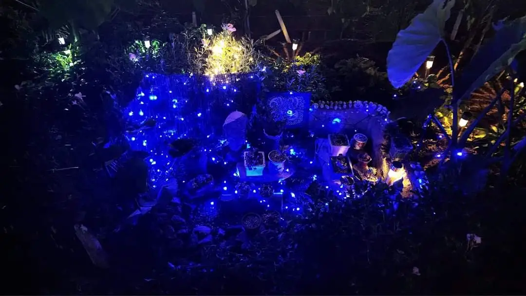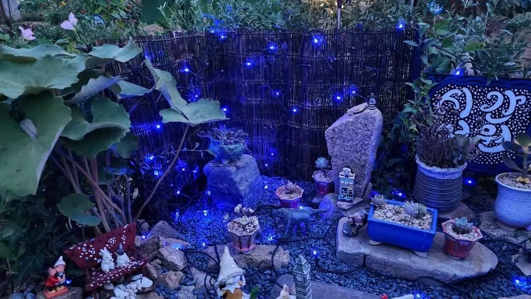반짝반짝 파란 불빛이 저녁 무렵을 밝혔다. 가만히 들여다보고 있으면 그곳이 바로 세계이고 또 하나의 우주 공간이 되었다. 한참 들여다보고 있으면 편안해진다. 박농민은 식물이 스트레스 받을 거라고 말한다. 나는 인간도 동물도 그 정도의 스트레스는 받는다고 생각한다. 식물은 어떨까! 나는 인공적인 행위에도 작위적이지 않다는 것에 어떤 안도감이 있었다. 텃밭정원 가꾸기에서 그러한 것을 경험한다.