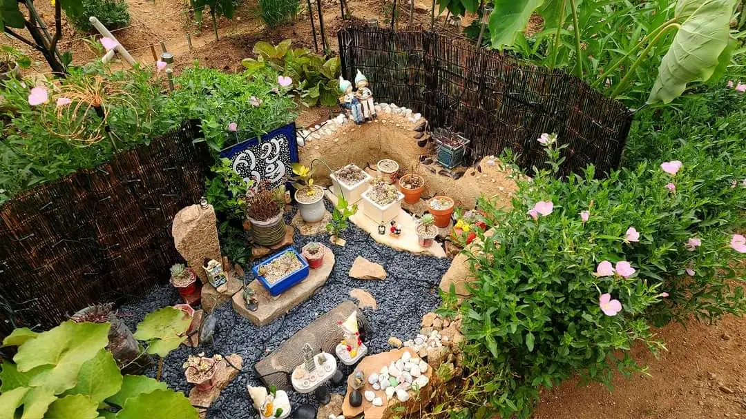 시간정원 안의 (시간랜드)에 씌워 놓은 비막이를 걷어 내었다. 무성한 토란도 뽑아내었다. 연잎 양귀비가 점령한 앞 쪽도 캐냈다(이건 집 화분에 몇 포기 심었다). 미니어처설치물과 다육들을 밖으로 꺼냈다. 그 아래 깔았던 돌들도 모두 꺼냈다. 그리고 낮달맞이 꽃나무들이 계속 올라오고 있는 땅을 파서 모두 캐냈다. 그리고 그 위에 비닐을 깔았다. 돌들을 그 위에 배치하였다. 갈대발을 주변에 고정시켰다. 비날 위에 검은 자갈을 깔았다.