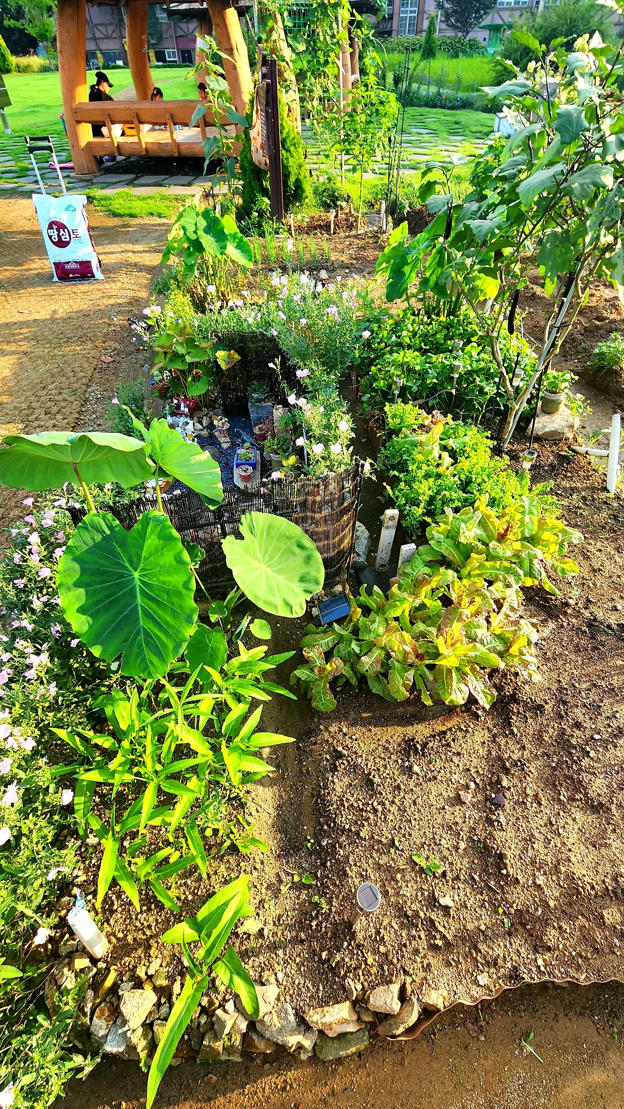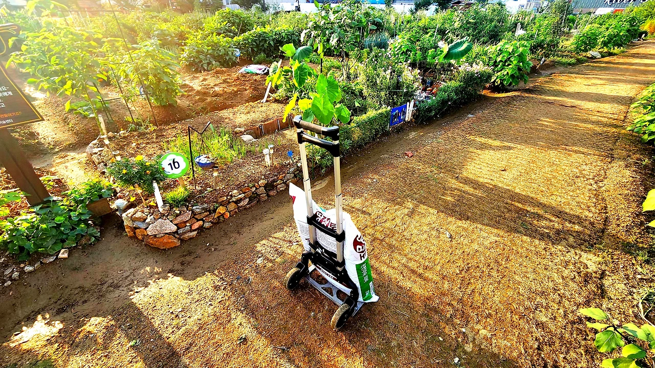 캐리어를 끌고 가서 거름과 석회를 관리소에서 받아왔다. 캐리어에 실린 거름 한 포대는 텃밭농장에서 나누어 준 거름이다. 거름과 석회와 배추모종을 텃밭농장에서 일괄로 모든 텃밭에 배분해 준다. 배추모종은 일주일 뒤에 나누어 준다.