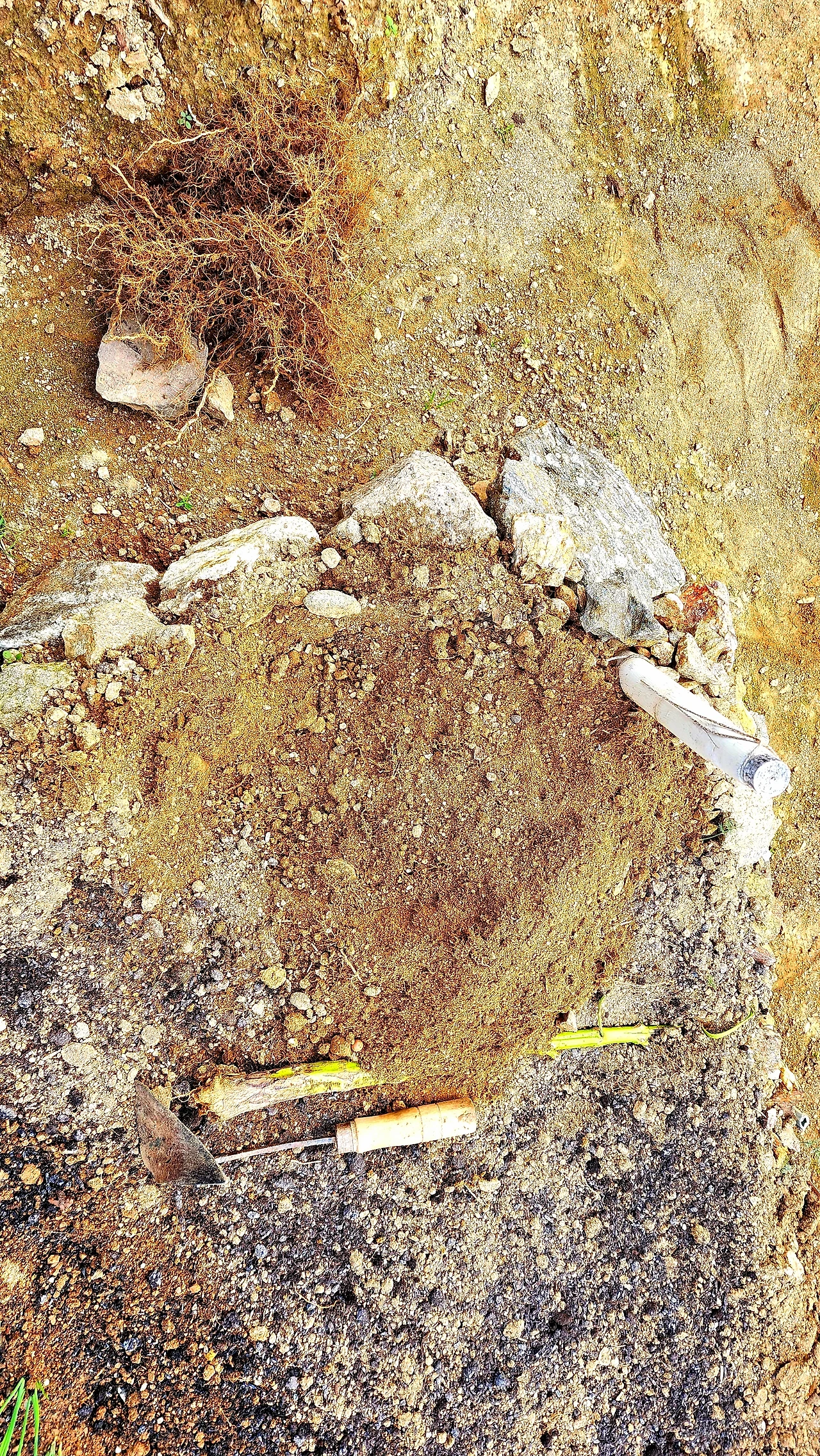 내가 땅을 뒤집은 깊이가 있었기 때문에 남은 곳도 그만큼의 깊이로 파여 뒤집어져야 한다. 여름 농작물들의 뿌리가 그 깊이에 아직 남아 있기 때문이다. 그 잔뿌리들을 모두 걸러내야 한다. 썩어서 영양분이 될 거라고들 생각하지만 이 잔뿌리들은 죽지 않고 그대로 있어서 오히려 흙을 싱그럽지 못하게 하는 거 같다. 여기에 땅벌레들이 번식하게 되는 거 같다.