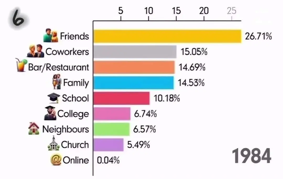 그리고 외식과 여가로부터 비롯된 변화가 증폭한 시기는 1970~1980년대이다. 이를 기반으로 1980년대부터는 이웃 공동체보다는 친구와 동료들이 중요해졌다. 마을을 벗어난 세대가 많아졌다는 의미일 것이다. 실리콘밸리 신화가 일어날 수 있었던 배경이다. 이때는 1940년 대의 증폭이라고 할 수 있을 것이다. 대학과 도시산업 단지로의 이동에서는 친구와 동료가 우선순위일 수밖에 없다. 협업할 대상이 친구와 동료밖에 없기 때문이다. 시대가 만들어 낸 가장 큰 특징일 것이다. 여기에서 이웃은 너무 먼 존재일들일 수밖에 없다. 냉전시대였으나 1980년대는 경제는 호황이었고 문화적으로 성장한 시기다. 우리나라는 민주화 운동 시대였다.