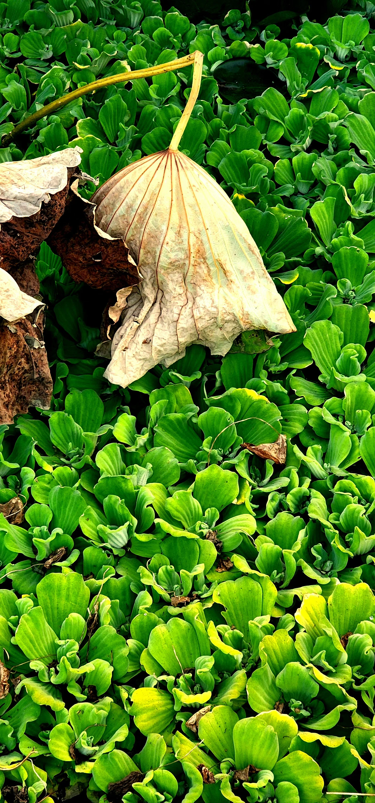 꺾여 사그라든 연잎은 초록 물배추와 대비다. 연잎은 사그라들 때 뚝 고개가 꺾인다. 그래야 죽는다. 그런데 연대가 시들고, 커다란 잎이 이미 수분을 잃어 가벼워졌어도 그 부피는 어느 정도 남아 있다. 연대가 그걸 이기지 못하고 푹 떨궈지는 것이다. 수면에 닿아도 그렇게 떠 있다가 수면 아래로 점점 잠기며 수면에서 자취를 감추는 것이다. 온 곳으로 되돌아갔다.