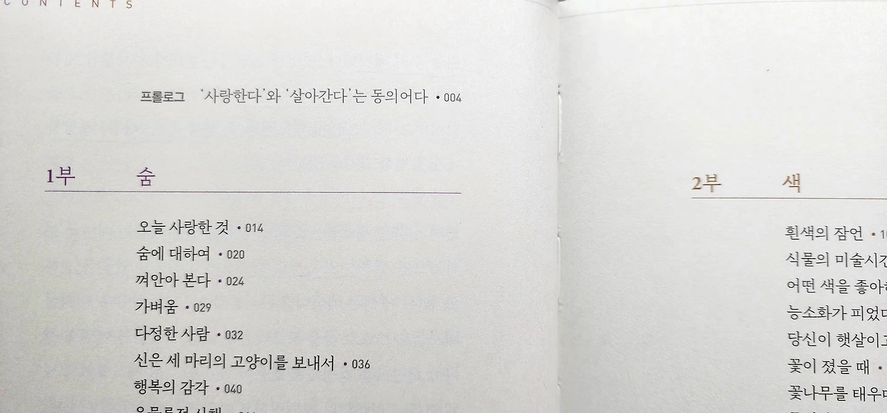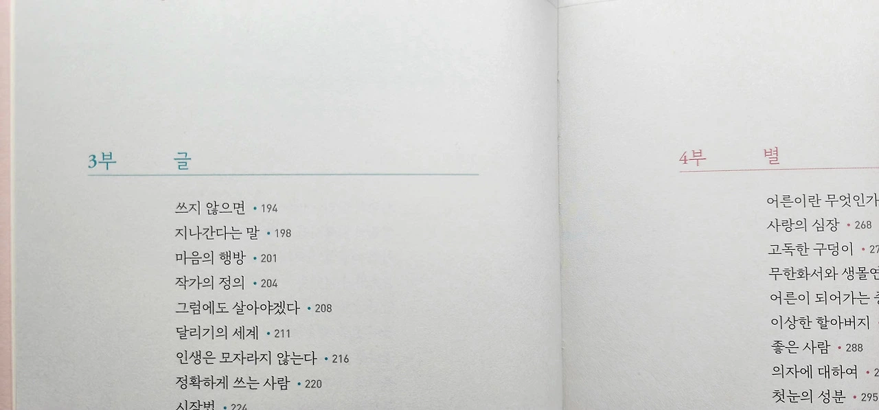 1부 숨, 2부 색, 3부 글, 4부 별로 구성된 챕터는 작가의 말에 의하면 이것은 모두 '사랑'의 다른 이름들이라고 한다.