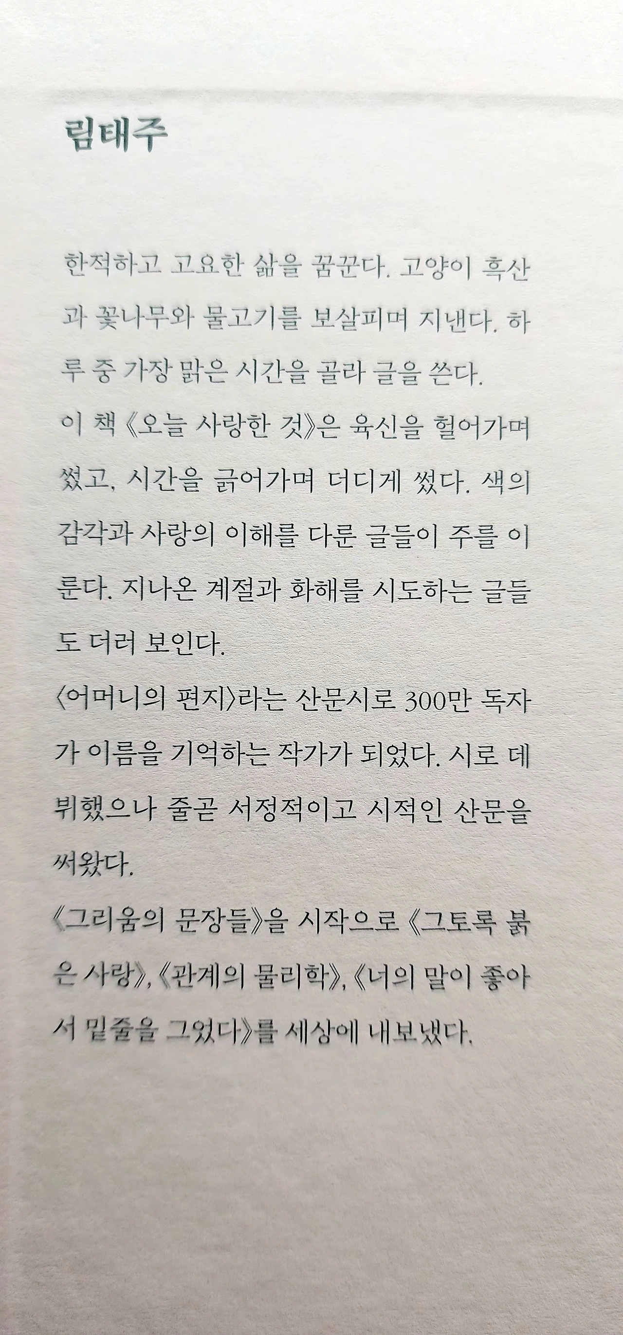 요즘 시대를 대체로 천민자본주의 시대로 말한다. 그런데 사람들은 오히려 더 자기만족을 추구한다. 이왕이면 다홍치마가 좋은 것이다. 이러니 또 <오늘 사랑한 것> 책표지의 연분홍이 생각난다(이 분홍의 색감을 나는 ‘인디 핑크’라고 생각한다). 이쁜 책이 나는 더 좋다고 생각한다. 책이 이쁘다고 내용까지 좋으란 법은 없다는 말에 책임지려고 림태주 작가는 이쁜 에세이 집에 그토록 담백하면서도 깊은 이야기들을 새겼나 보다.