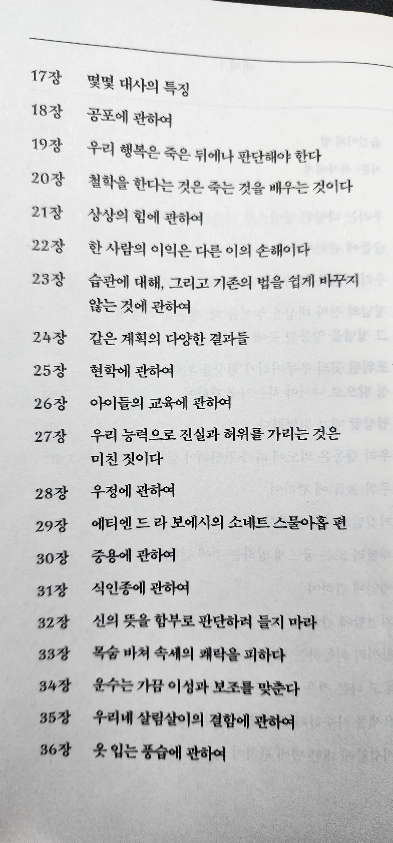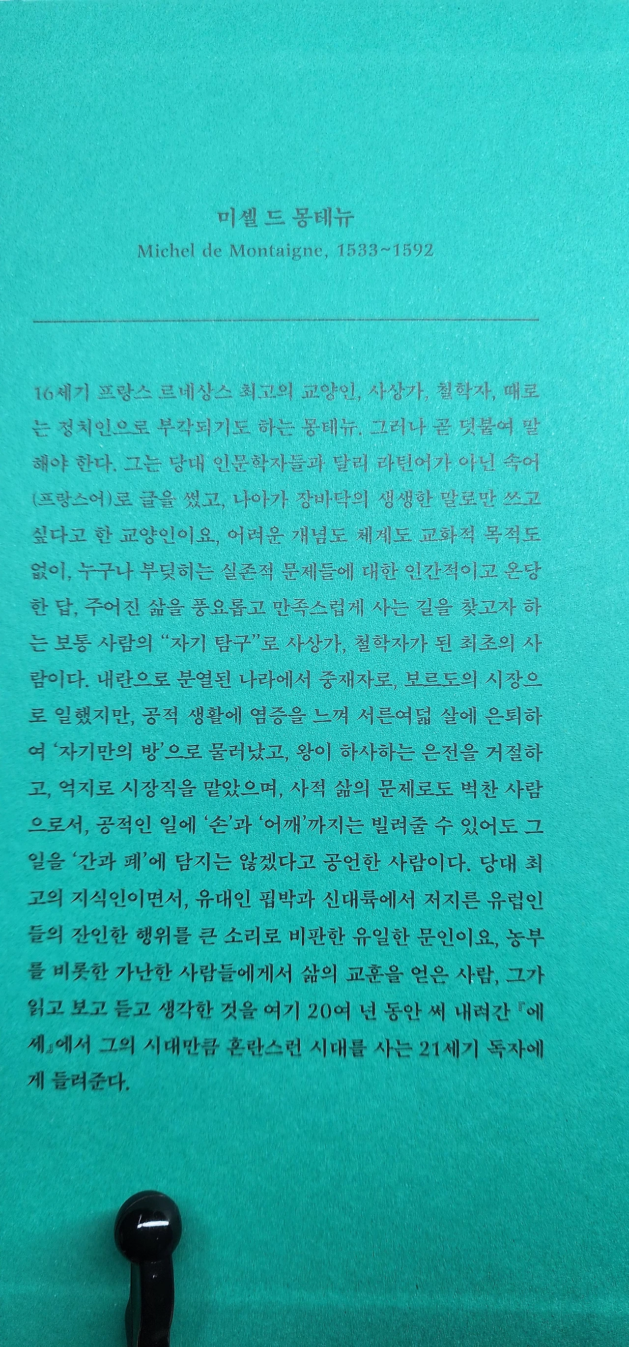 이런 해방감의 몽테뉴의 <에세>가 좋아진다. 그 사람처럼 생각해야 그 사람을 이해할 수 있다. 이번엔 몽테뉴가 되어 몽테뉴처럼 <에세>로 들어가 보기로 한다. 하지만 이 작업이 쉬운 일은 아니다. 그 자신 안에 타자를 수용하여 함께 거주한다는 것은 내면에 송곳 하나를 안고 산다는 말과 같으니까. 하지만 그렇게 하지 않고서는 대상을 이해할 수 없다. 사물에 대한 것도 마찬가지다.