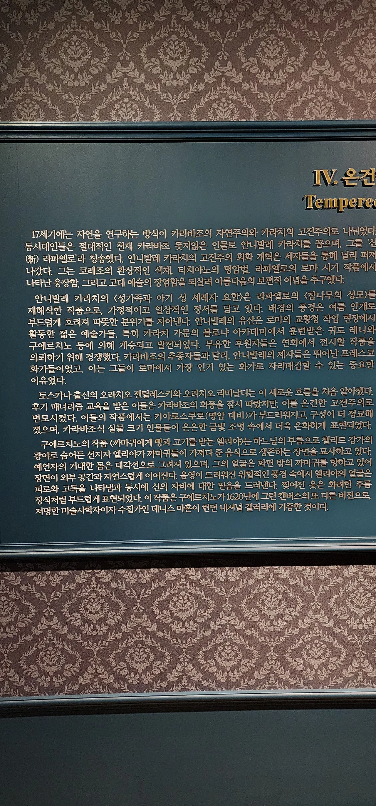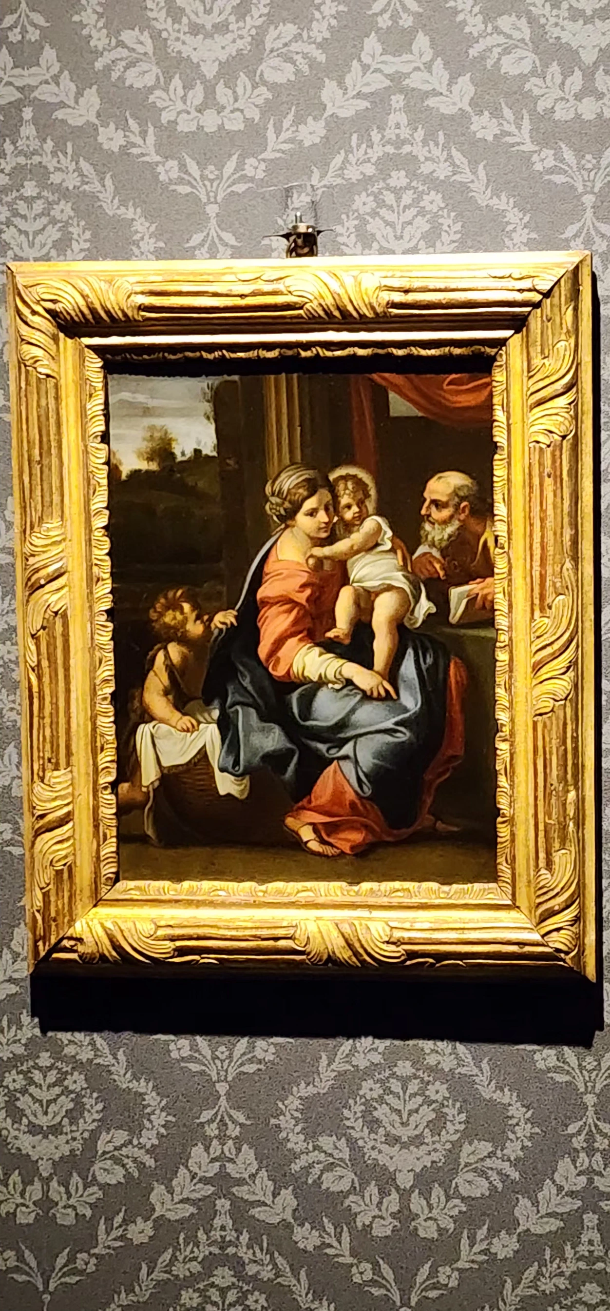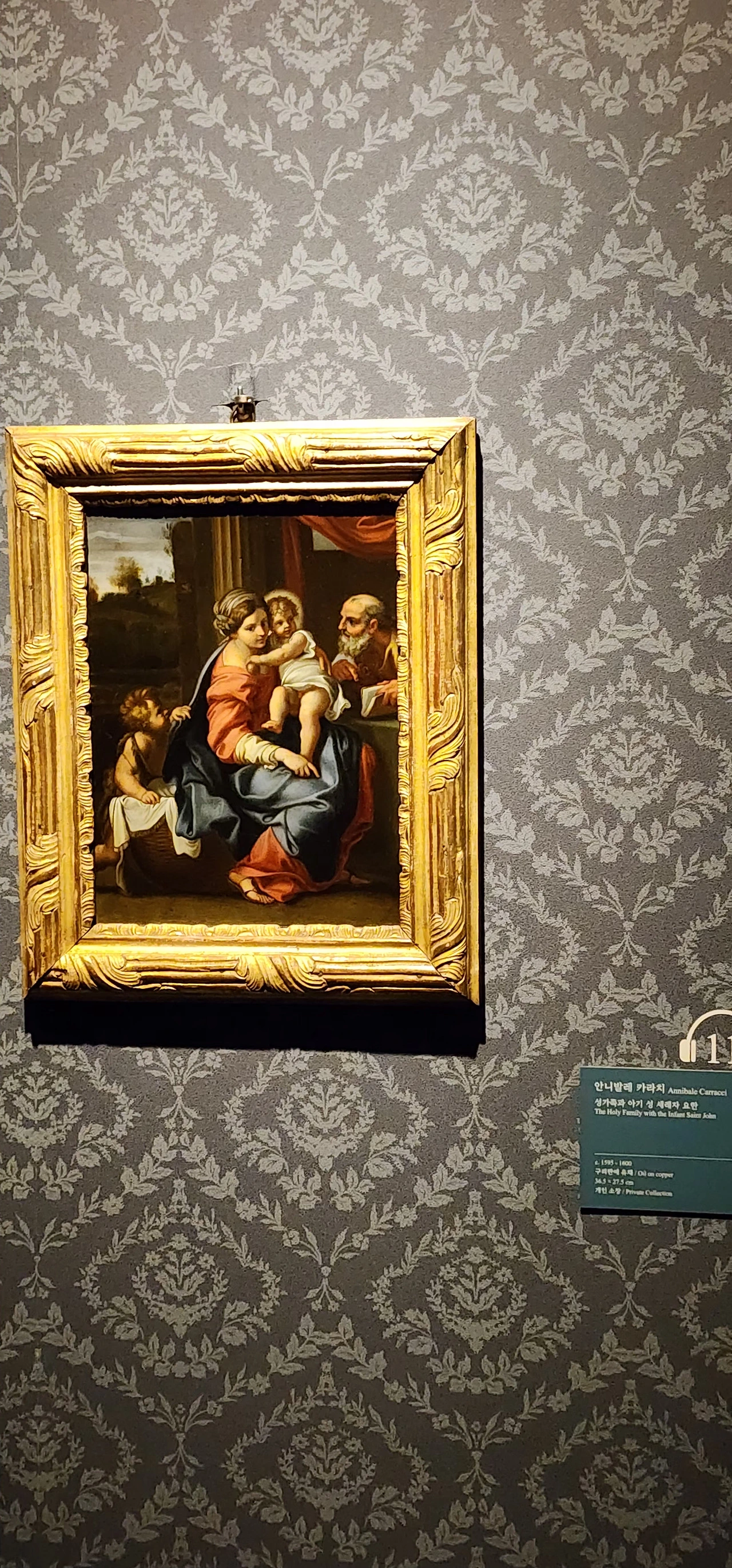 안니발레 카라츠의 <성가족과 아기 성 세례자 요한>은 라파엘로의 <참나무의 성모>를 재해석한 작품으로, 가정적이고 일상적인 정서를 담고 있다. 배경의 풍경은 여름 안개로 부드럽게 흐려져 따뜻한 분위기를 자아낸다. 안니발레의 유산은 로마의 교황청 작업 현장에서 활동한 젊은 예술가들, 특히 카라치 가문의 볼로냐 아카데미에서 훈련받은 귀도 레니와 구에르치노 등에 의해 계승되고 발전되었다. 부유한 후원자들은 연회에서 전시할 작품을 의뢰하기 위해 경쟁했다.