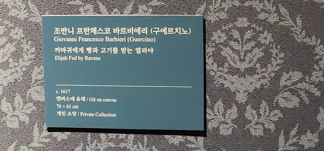 구에르치노의 작품 <까마귀에게 빵과 고기를 받는 엘리야>는 하느님의 부름으로 첼리트 강가의 광야로 숨어든 선지자 엘리야가 까마귀들이 가져다 준 음식으로 생존하는 장면을 묘사하고 있다. 예언자의 거대한 몸은 대각선으로 그려져 있으며, 그의 얼굴은 화면 밖의 까마귀를 향하고 있어 장면이 외부 공간과 자연스럽게 이어진다. 음영이 드리워진 위협적인 풍경 속에서 엘리야의 얼굴은 피로와 고독을 나타냄과 동시에 신의 자비에 대한 믿음을 드러낸다. 찢어진 옷은 화려한 주름 장식처럼 부드럽게 표현되었다.