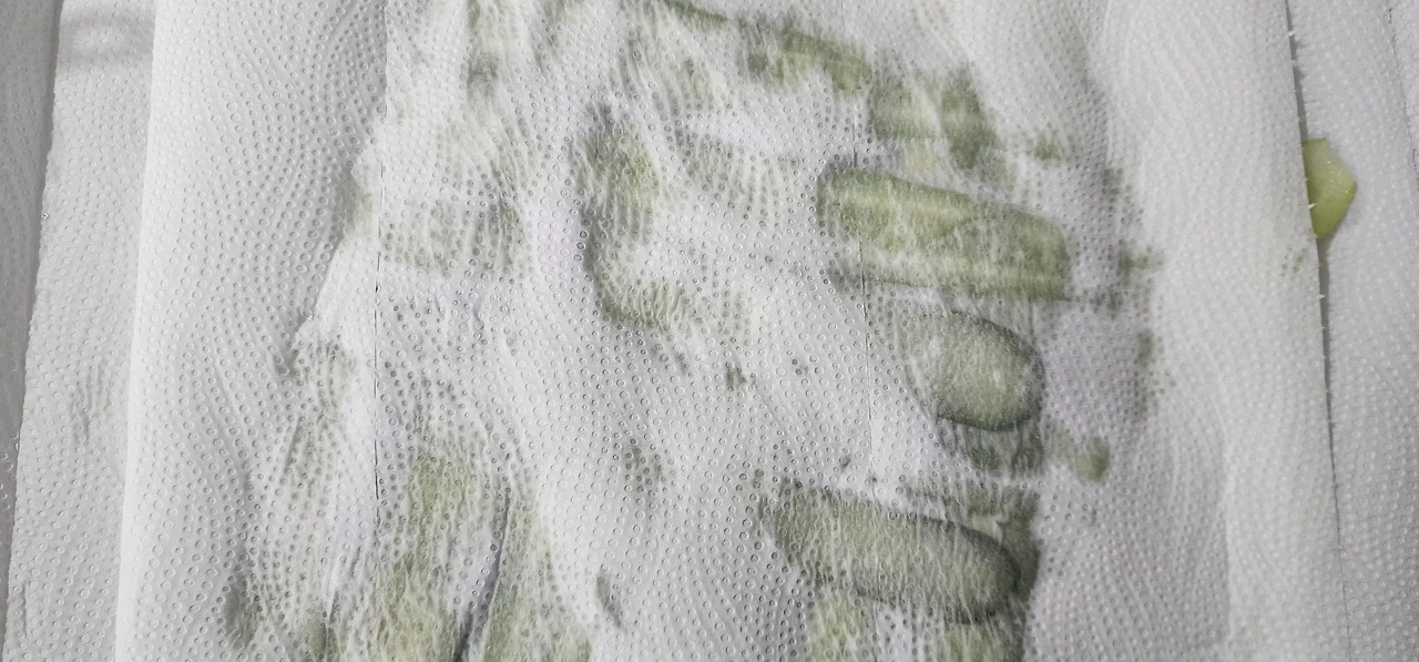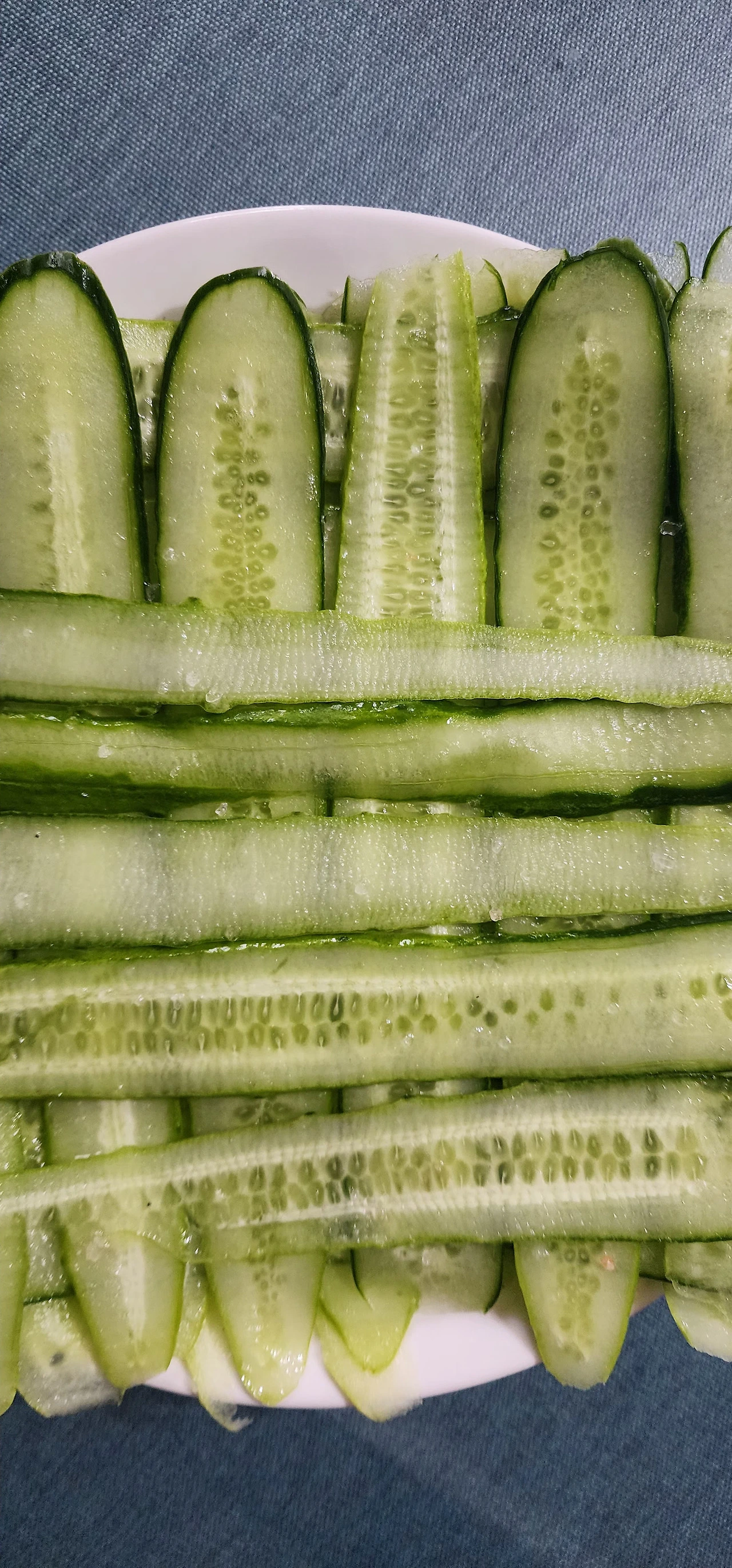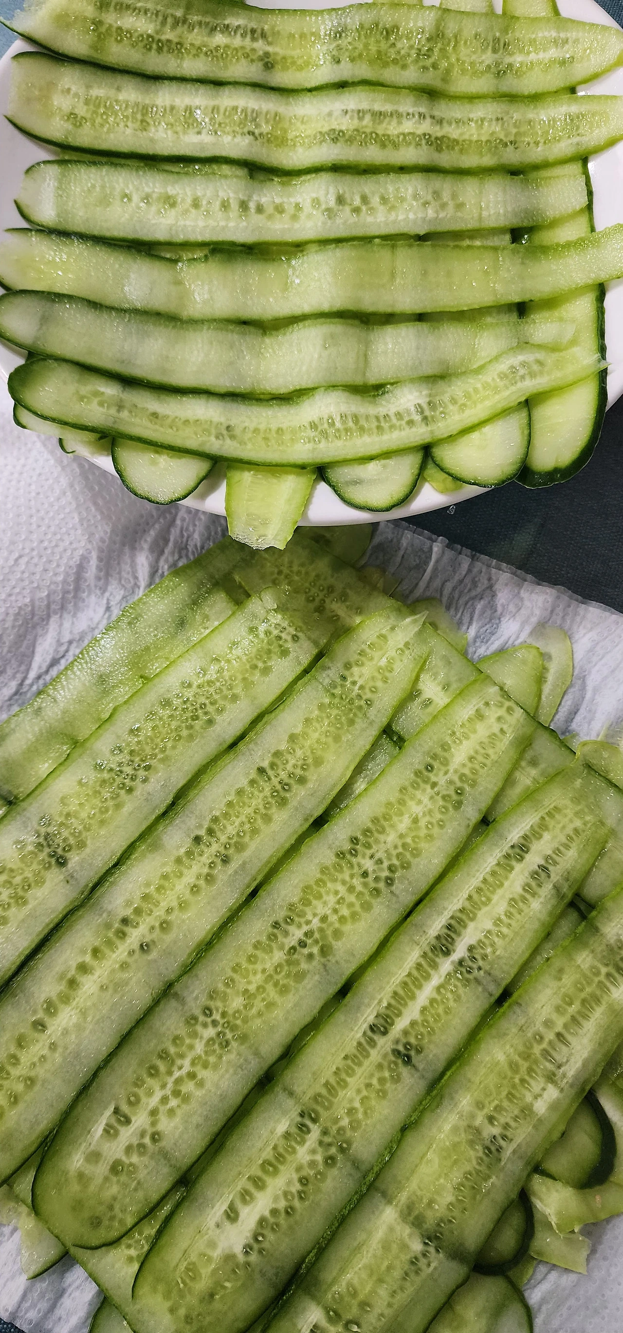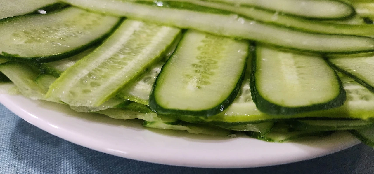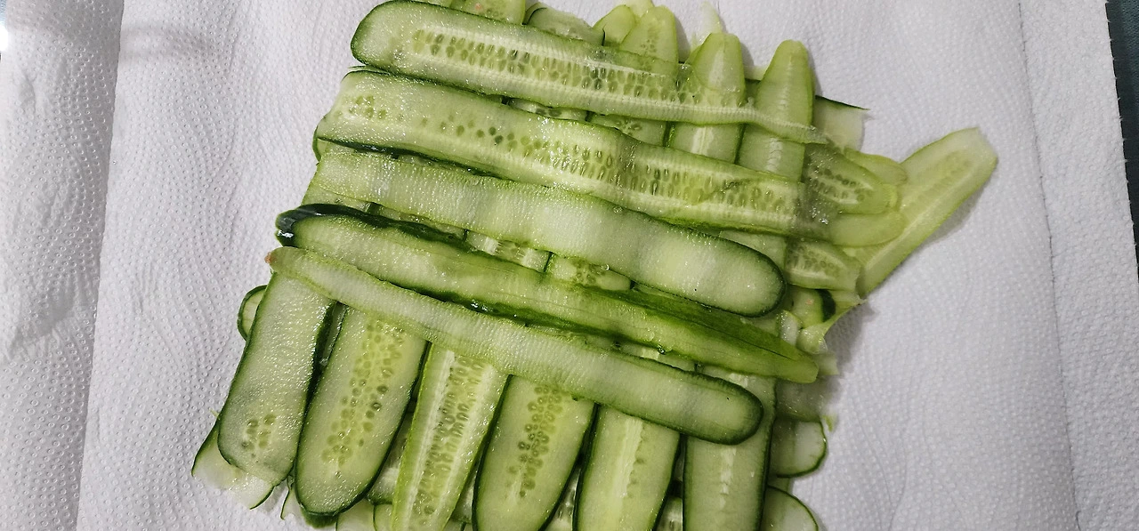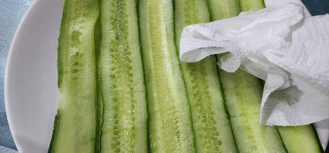 오이를 감자칼로 슬라이스 하여, 소금을 살짝 뿌려 십여 분간 잰다. 그리고 키친타월로 수분제거한다(슬라이스 된 오이 앞뒤 골고루 수분 제거).
