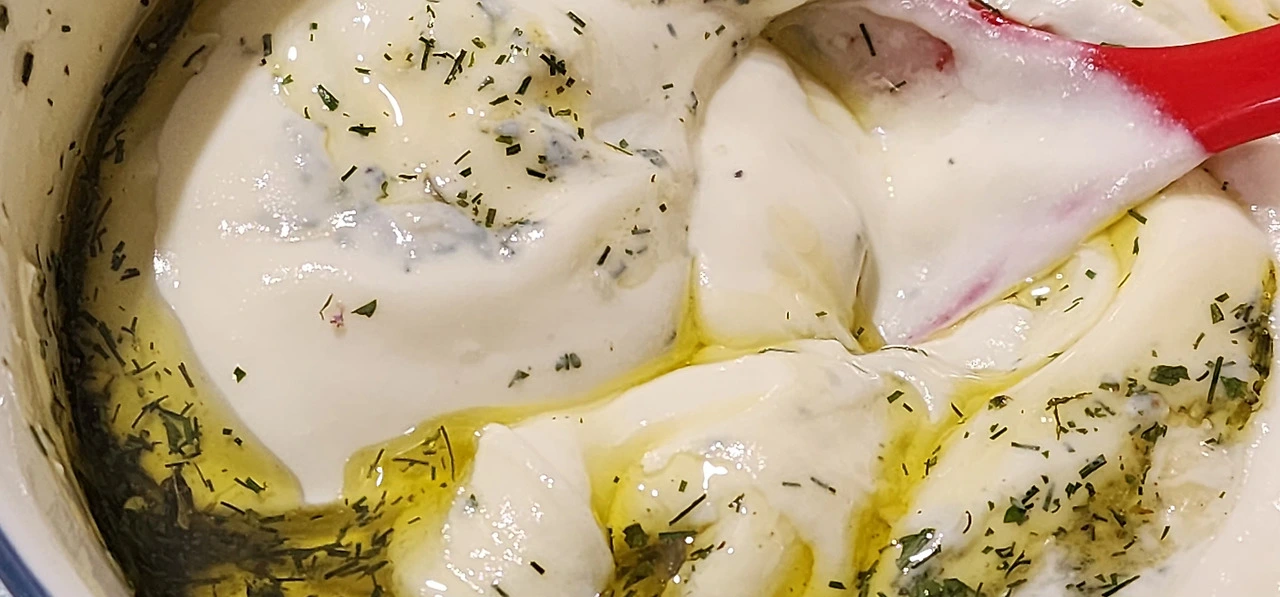 소스 재료를 다 넣었으면 잘 섞어준 후, 그릭 요거트를 넣고 또 잘 섞어준다. 슬라이스 오이를 넣고 잘 섞어서 냉장고에서 한두 시간 숙성 후 빵에 올려 먹거나 샐러드에 첨가하여 같이 먹는다. 감자와 달가슴살과도 잘 어울린다고. 생선튀김에도 잘 어울릴 것 같다.