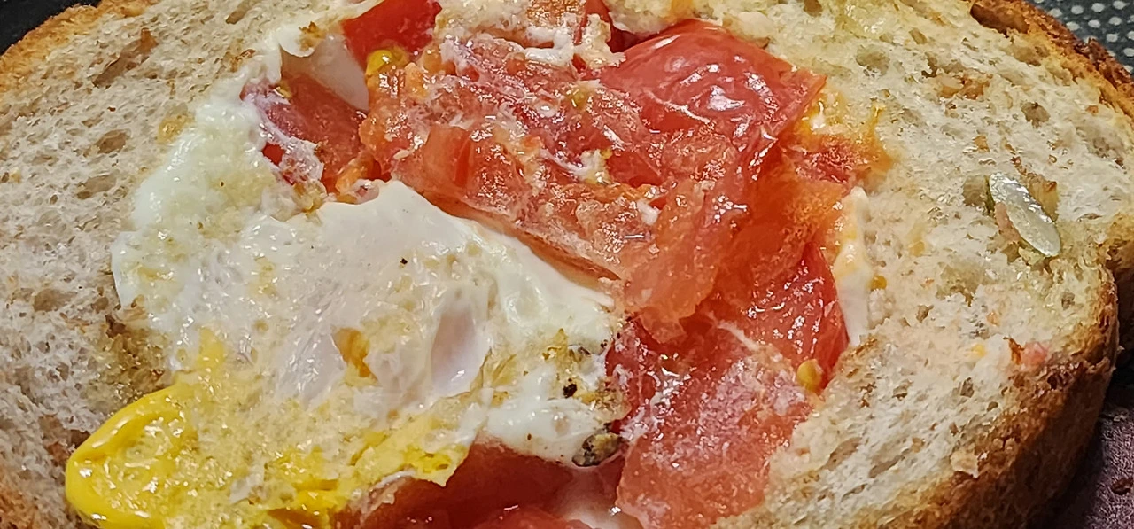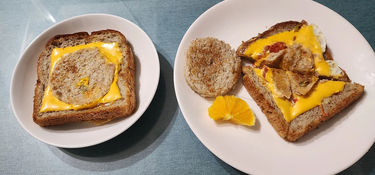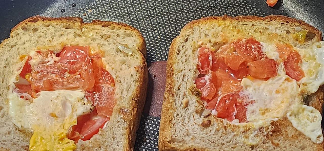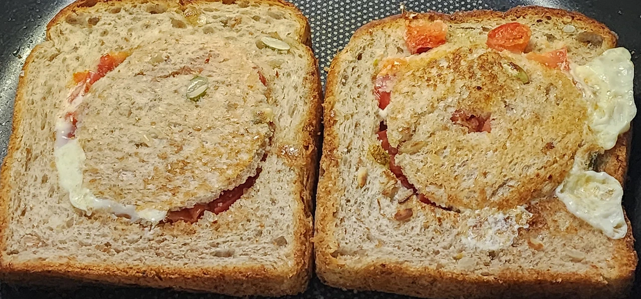 다시 또 식빵을 뒤집어서 식빵 뚜껑을 벗겨내고, 내용물이 쏟아지지 않게 뒤집어 익힌다. 노른자가 겉만 익을 정도로 익힌 후, 다시 뒤집는다.