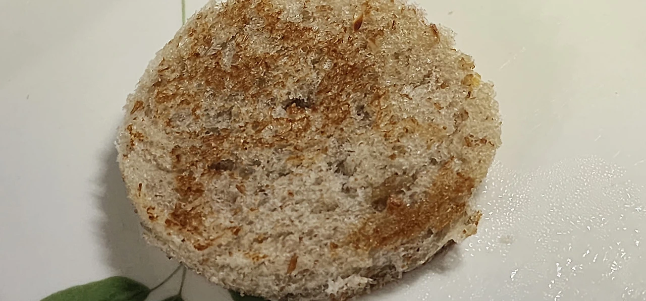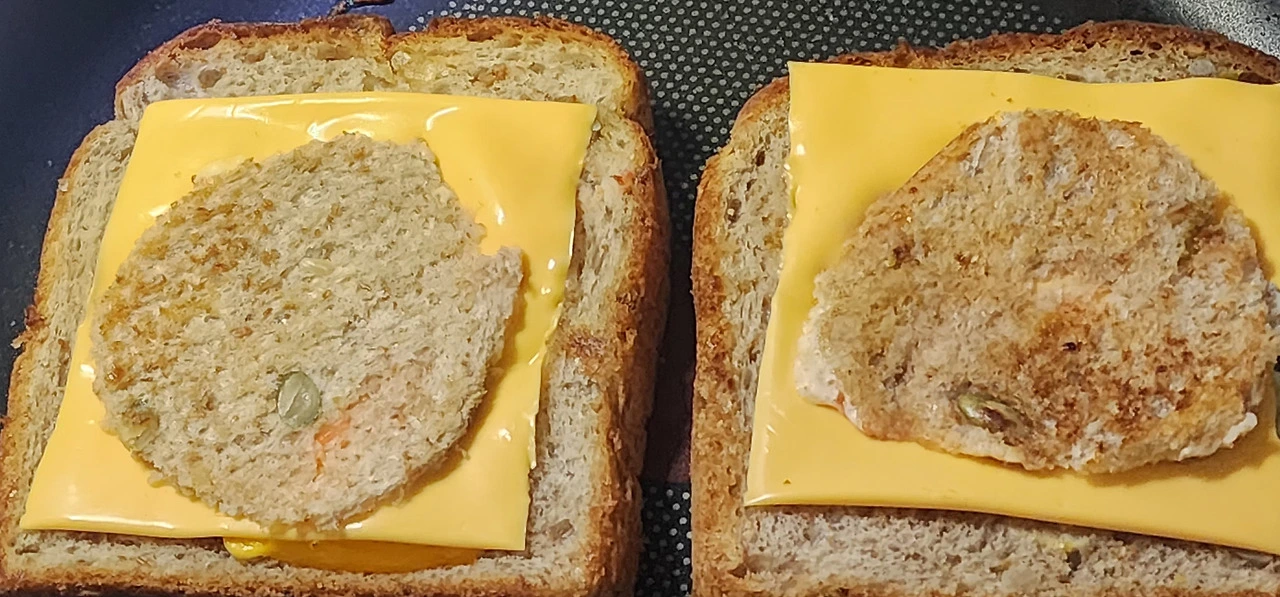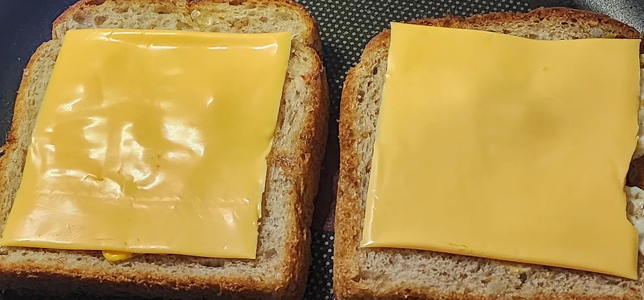 슬라이스 치즈로 덮어준다. 치즈가 살짝 흐물 해지면, 벗겨낸 빵 뚜껑을 다시 치즈 위에 올려준다. 살짝 눌러준다. 다시 식빵을 뒤집은 후(5초 ~10초) 이내에 다시 식빵을 원위치시킨다. 완성이다.