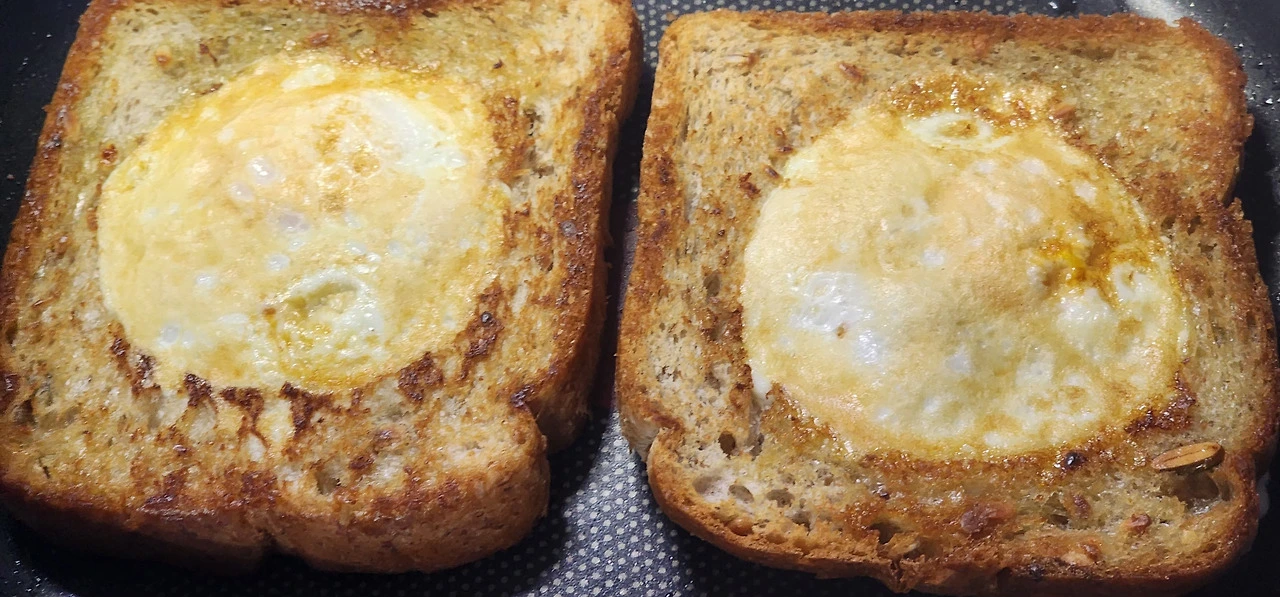 식빵을 팬에 올리고 굽는다. 뒤집은 후 달걀을 깨뜨려 하나씩 식빵 구멍에 채운다. 불은 약불로 한다.