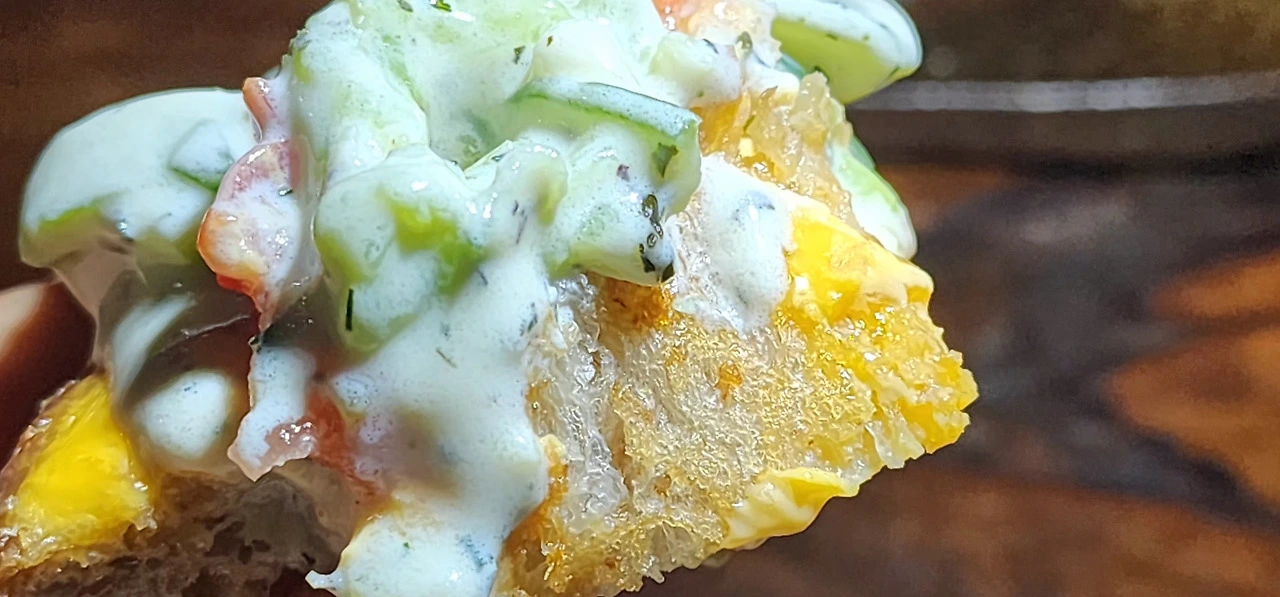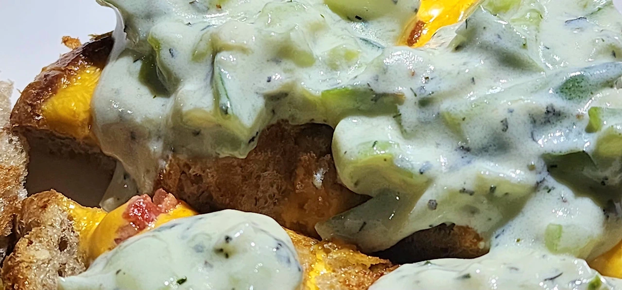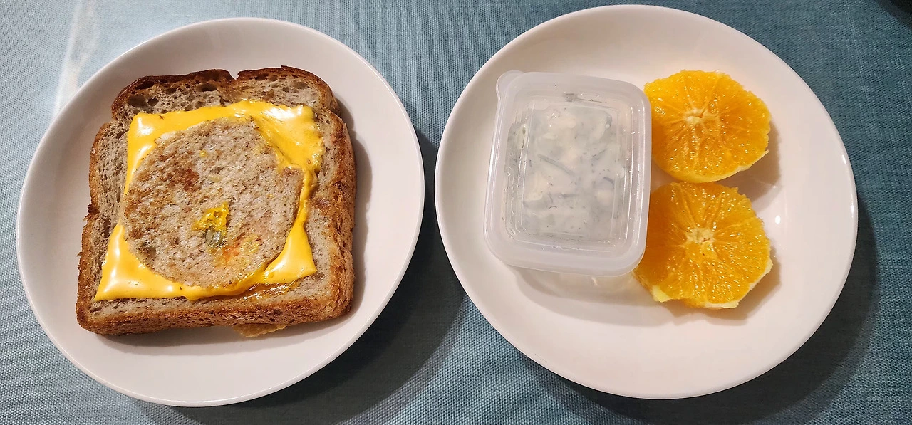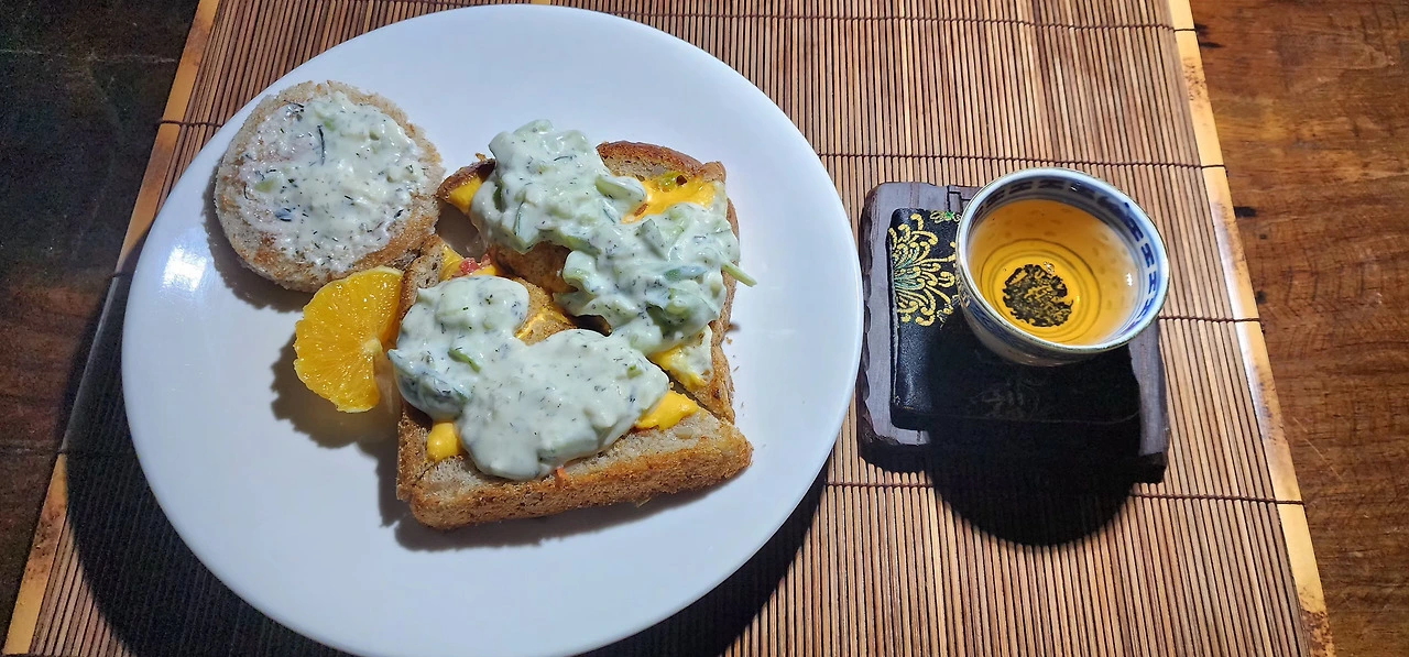 완성된 토스트에 차지키 소스를 올려서 먹는다. 나는 좀 전에 먹었다. 야식인 셈이다. 남은 동그란 빵 조각에도 차지키 소스를 발라 먹었다. 달걀, 토마토, 치즈가 들어간 토스트에 차지키 소스를 올려 먹은 맛이 풍부하게 다가와서 입맛을 돋웠고, 그냥 구운 식빵에 올려 먹은 차지키 소스는 차지키 소스 맛이 더 강하게 느껴졌지만 맛은 담백했다.