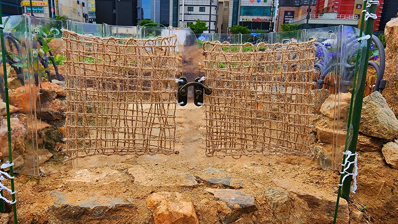 투명 음식 포장 용기를 잘라서 삼베 끈으로 만든 줄로 격자를 만들었다. 그리고 투명 플라스틱에 끼워 고정시켰다. 문의 얼개가 완성되자 텃밭으로 향했다. 기둥에 고정시켜야 하는데, 재료가 마땅치 않아서 다이소에서 재료를 사 왔다.