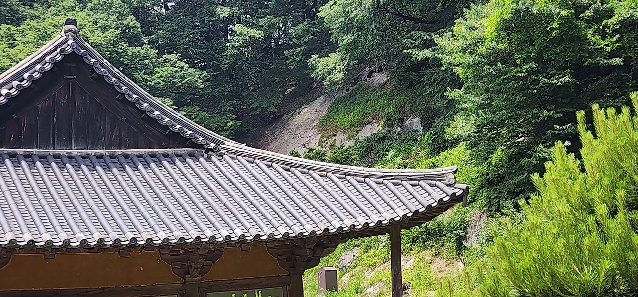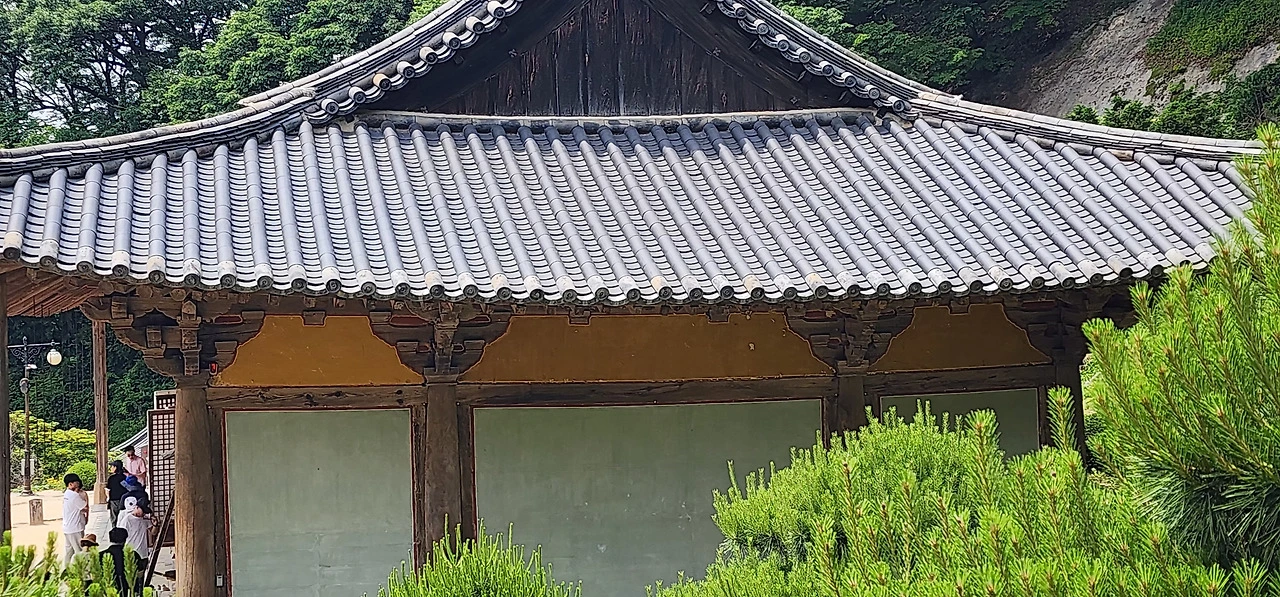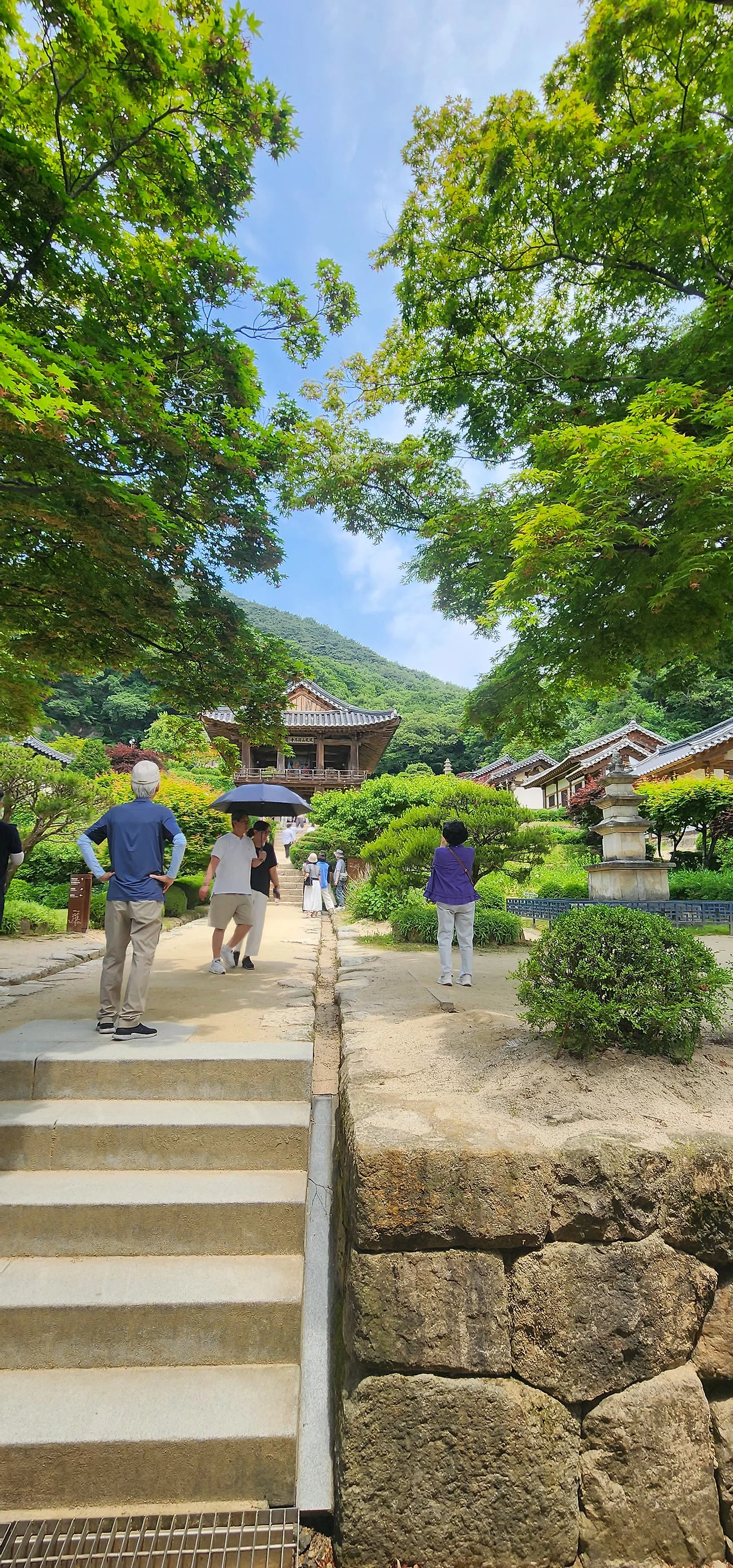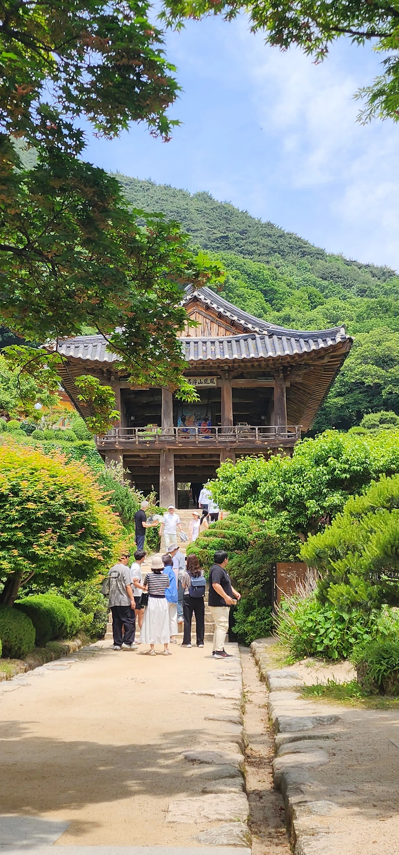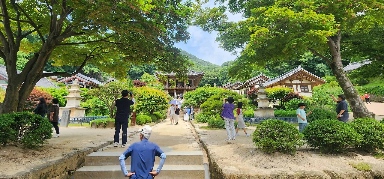 걷기 아름다운 작은 길, 관음전 가는 길의 갈림길에서 멈춰 섰다. 포토타임이다. 푸른 숲과 어우러진 돌길과 낮은 기와 담장이 만드는 풍경 그늘이 시원했다. 바람이 살랑이는 풍경은 무량수전 앞마당에서 바라본 풍경과는 대조적이었다.