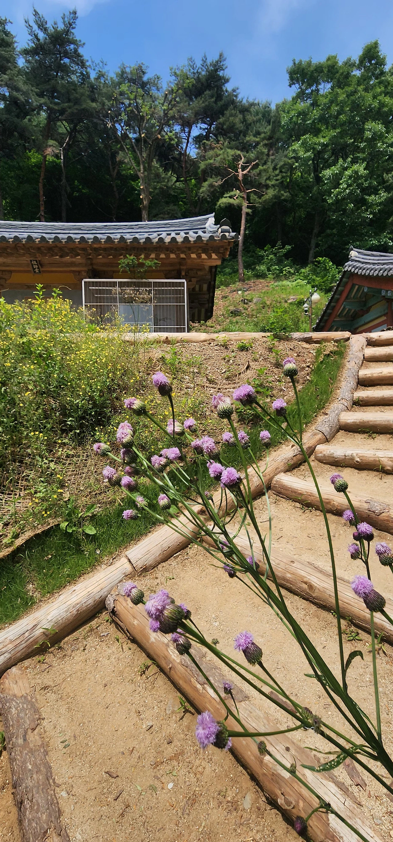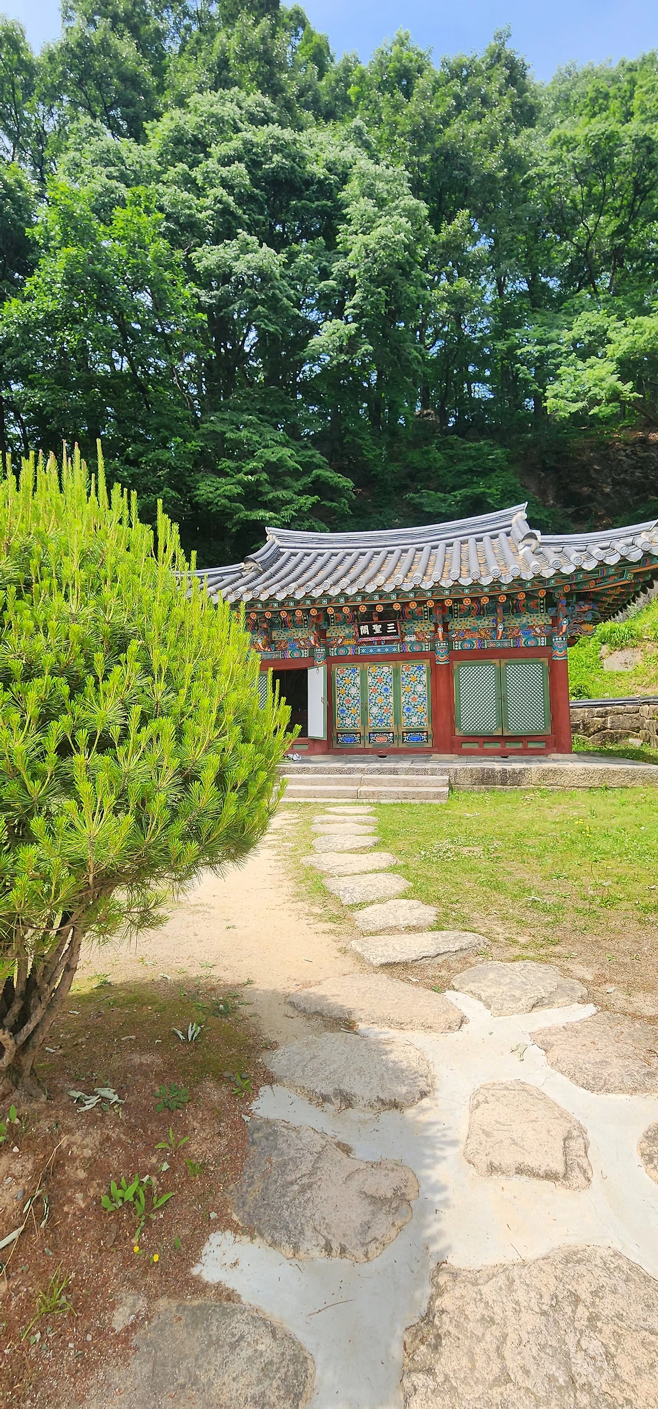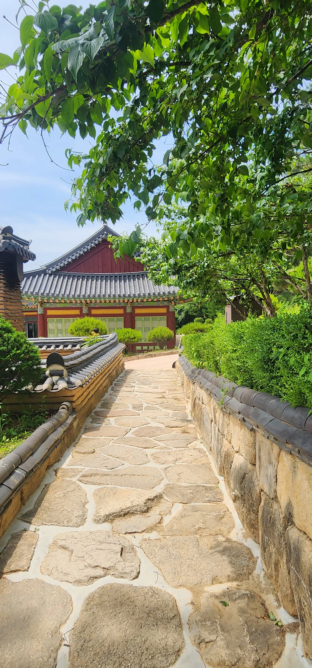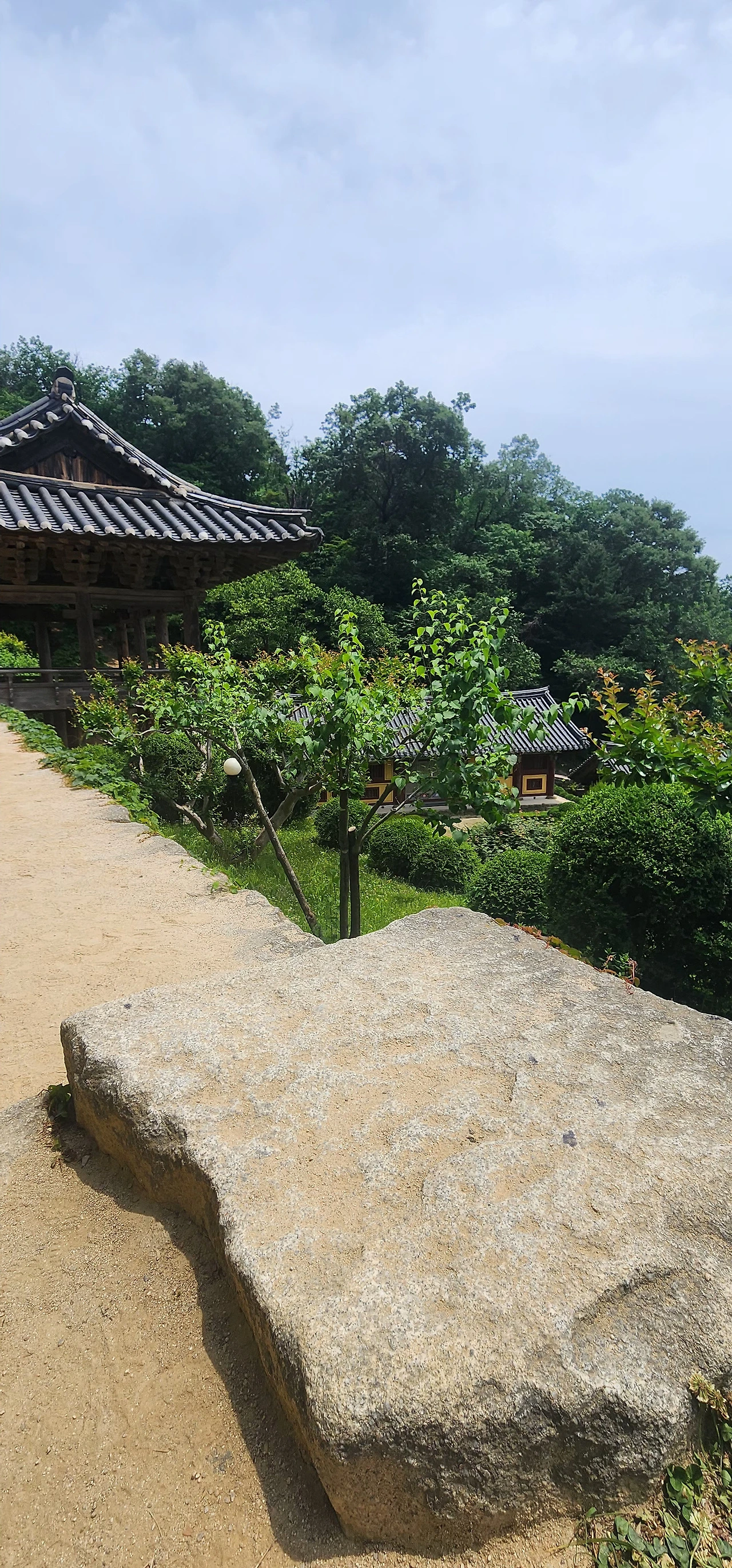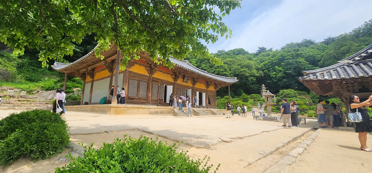 걷기 아름다운 작은 길, 관음전 가는 길의 갈림길에서 멈춰 섰다. 포토타임이다. 푸른 숲과 어우러진 돌길과 낮은 기와 담장이 만드는 풍경 그늘이 시원했다. 바람이 살랑이는 풍경은 무량수전 앞마당에서 바라본 풍경과는 대조적이었다.