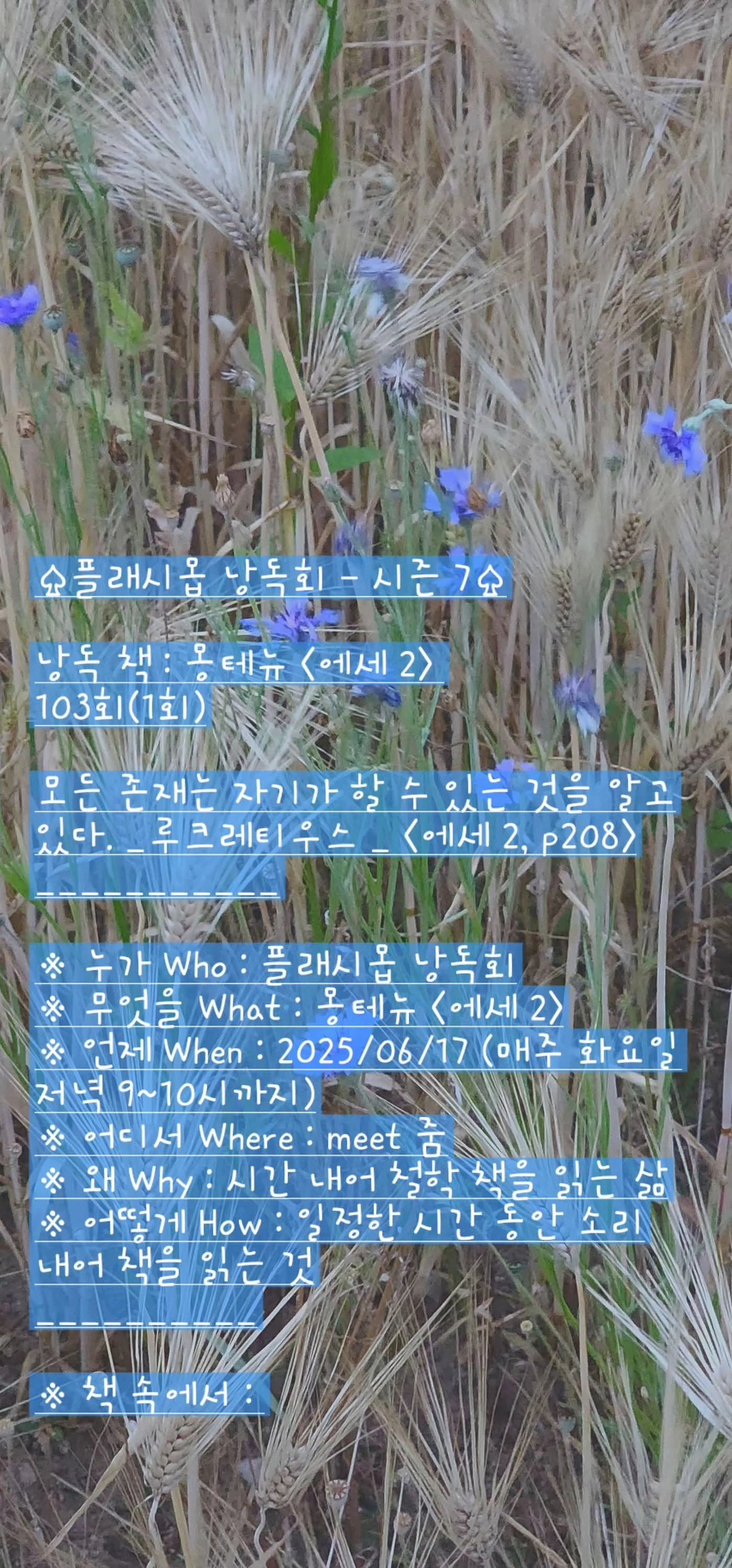 낭독 '시즌 7'로 여름의 한복판으로 들어간다. 선거가 끝나고 그다음 주 플래시몹 낭독회도 방학에서 벗어났다. <에세 2>로 낭독을 이어가기로 했다. 요일과 시간을 조정하였다. 매주 수요일에서 매주 화요일로 변경하였고, 낭독 소요 시간은 30분 앞 당겼고, 2시간에서 한 시간으로 줄였다. 대신 칼입장하고 칼퇴장하기로 하였다. 입장과 동시에 한 시간 동안 세 사람이 20분씩 낭독으로 돌아가며 책을 읽고, 끝나면 바로 "안녕"하며 줌 화면을 끄는 것으로. 남은 세 사람은 그다음 주에 낭독으로 읽는 것으로 하였다. 총 6명이니까 매주 세 사람만 읽는 것이다. 일단은 이렇게 해보기로 하였다. 낭독 시간이 줄어든 만큼 한 시간 읽기 낭독에 더 집중하고 듣기에 몰입하는 것이다. 세이브된 늦은 저녁 시간은 아껴서 각자의 삶을 윤택하게 하는 시간으로 되돌아갔다. (여유 시간 또는 밤이니까 푹 자기)