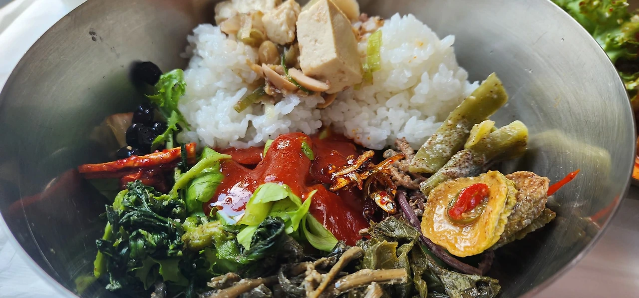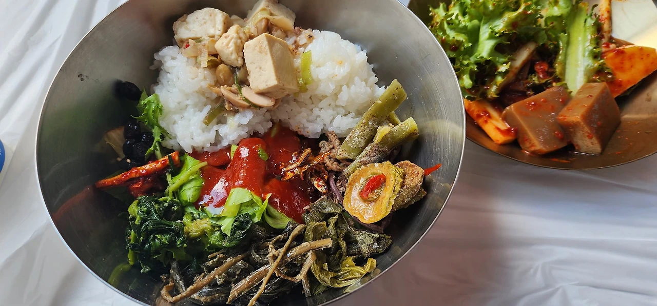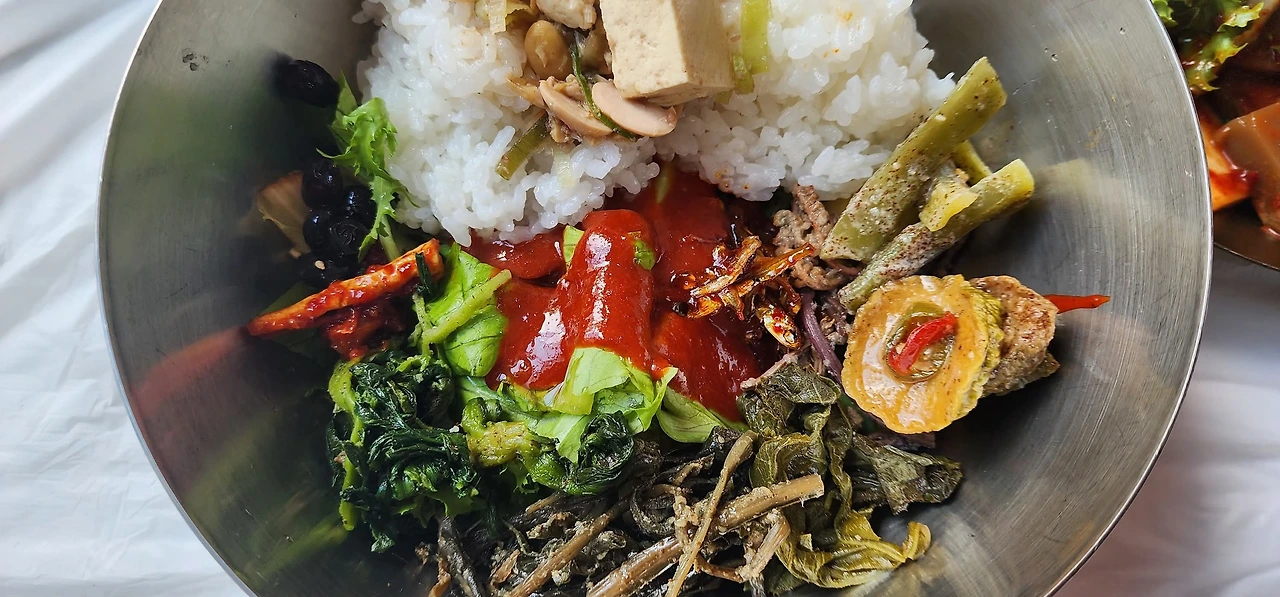 배가 고파서 근처의 음식점으로 들어갔다. 산채비빔밥, 정말 오랜만에 먹어본다. 식당 안은 만석이었다. 잠시 기다리다 우리 차례가 되어 자리에 앉았다. 음식이 나오자 사진을 찍었다. 햐~ 어떤 기시감이 내 안에서 요동을 찐다. 짬뽕된 사찰들의 산채비빔밥이 마구마구 뒤섞여 서로 기억 우위를 차지하려고 하지만, 내가 평정해 버렸다. 다시 먹는 산채비빔밥, 배도 고픈데 맛나게 잘 먹었다. 기억들이 정렬했는지, 고요해졌다.