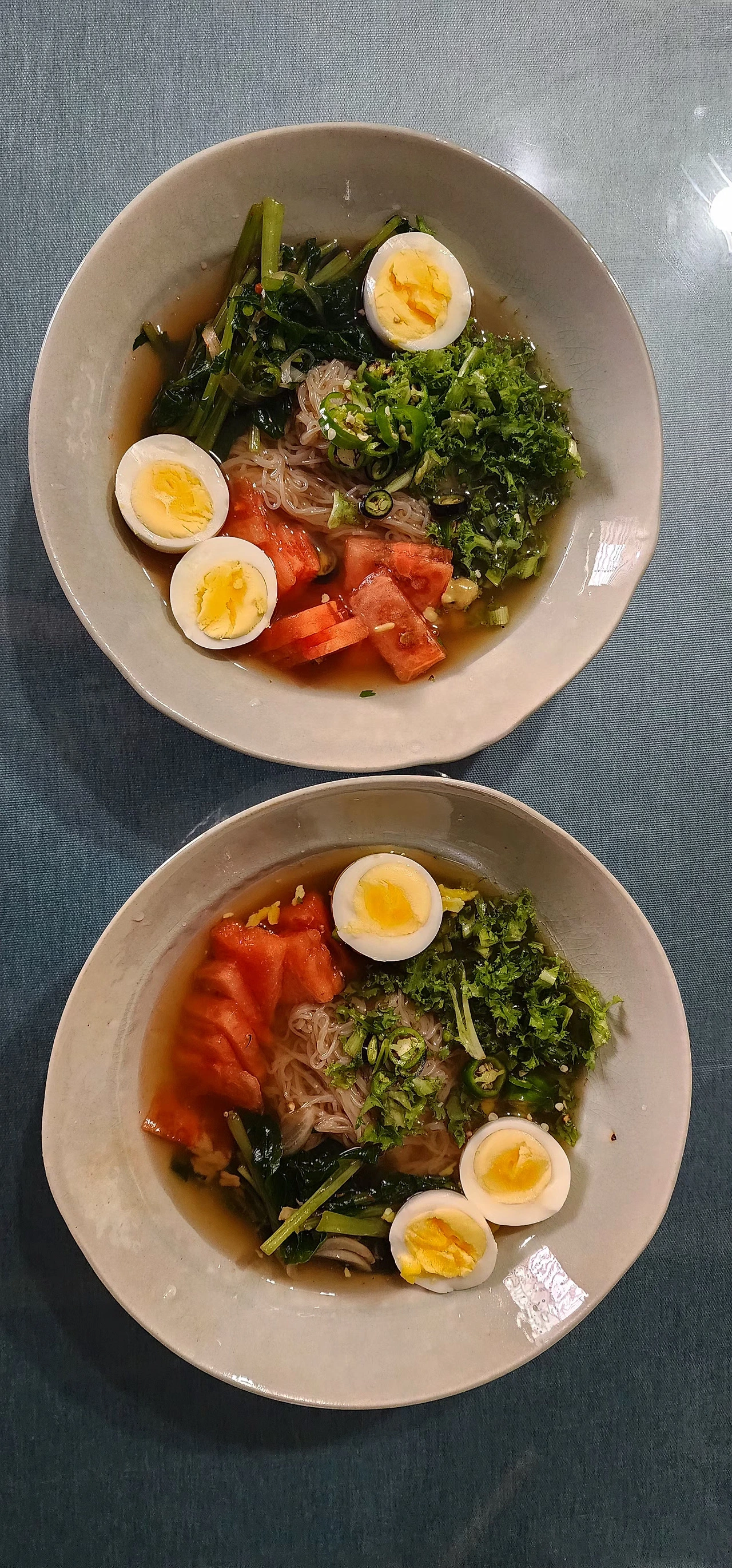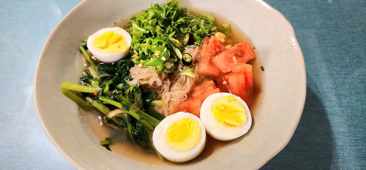 텃밭 소산물로 만든 여름 물냉면이다. 냉면 봉지 안에는 건조면과 육수뿐이다. 연겨자 소스는 어디로 갔을까...