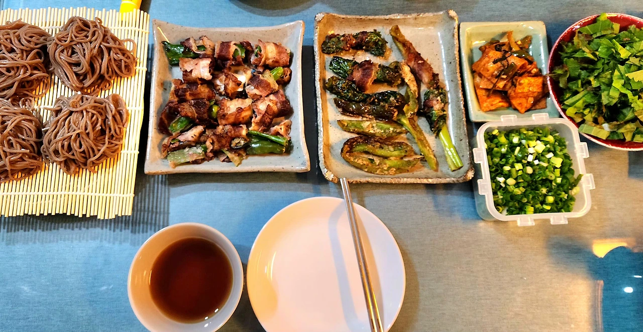 이번에는 소바다. 이미 있는 재료 그대로에 메밀면만 삶으면 되니까.