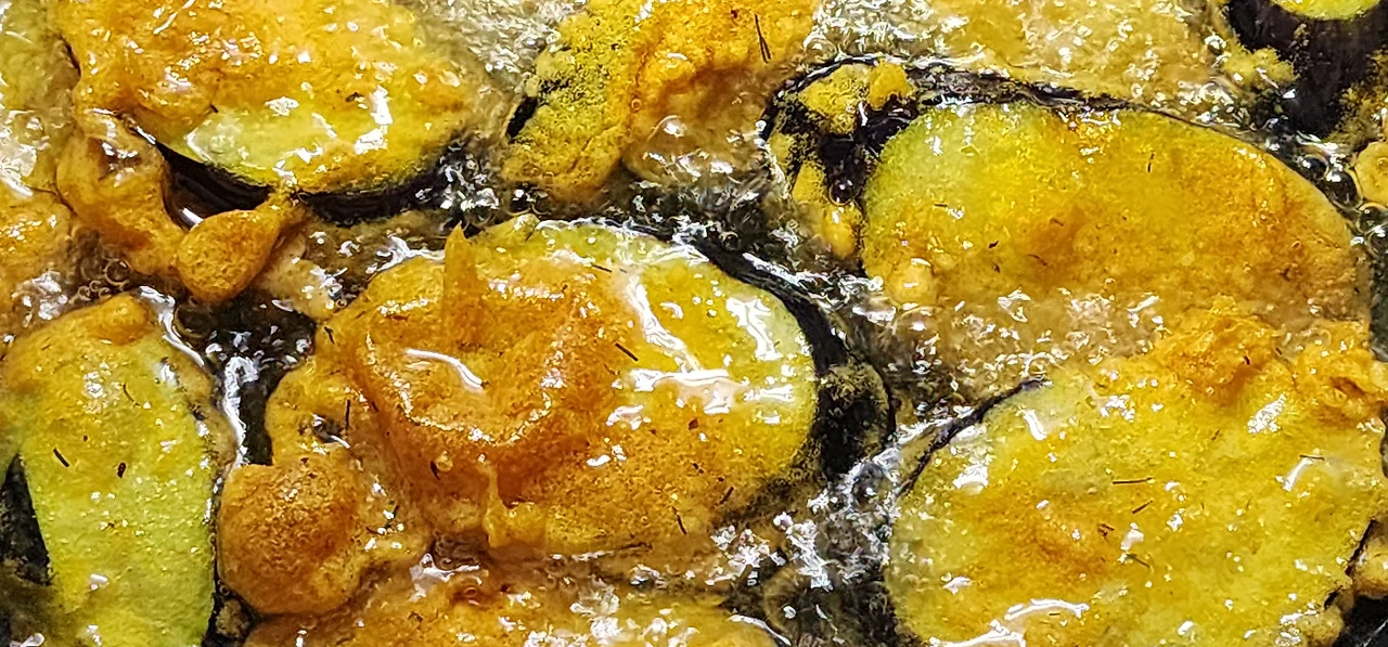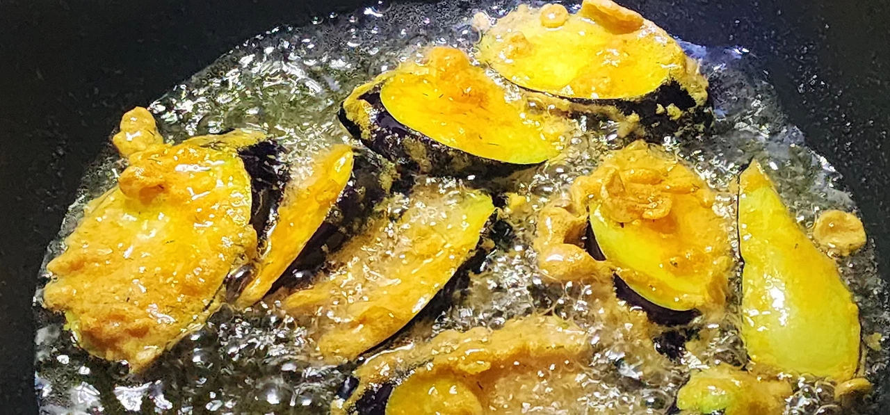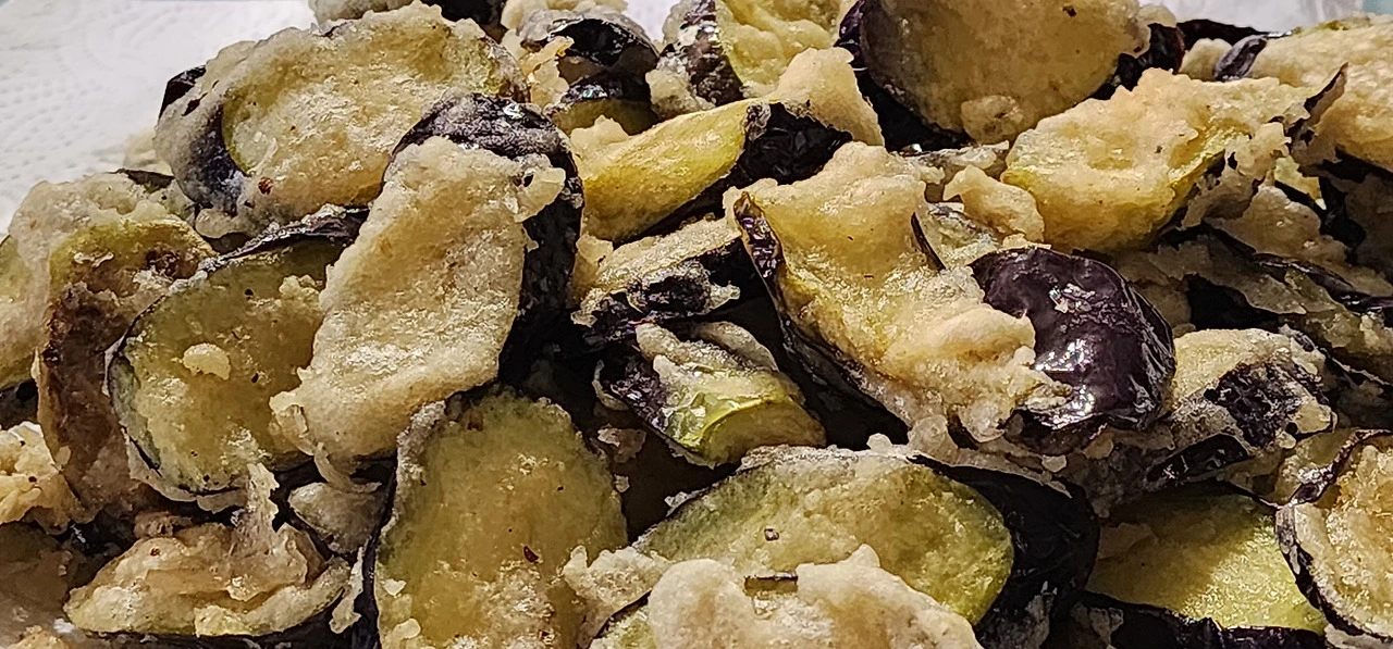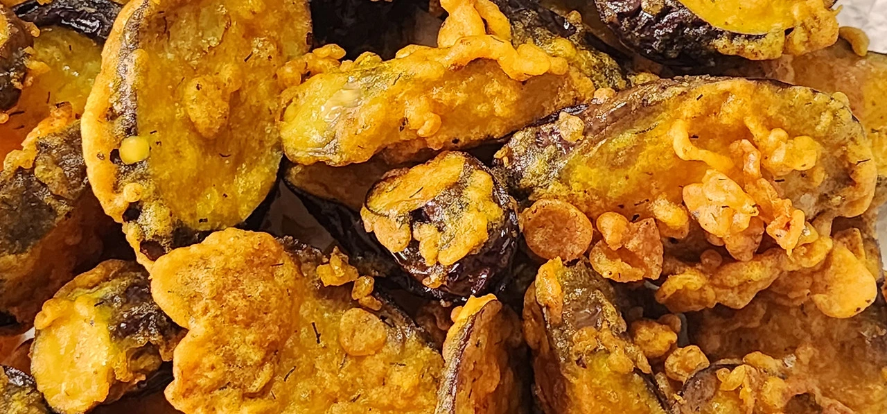 가지에 튀김옷을 입혀서 애벌 튀기기를 했다. 먹기 직전에 다시 되튀기기(재벌 튀김)를 했다.