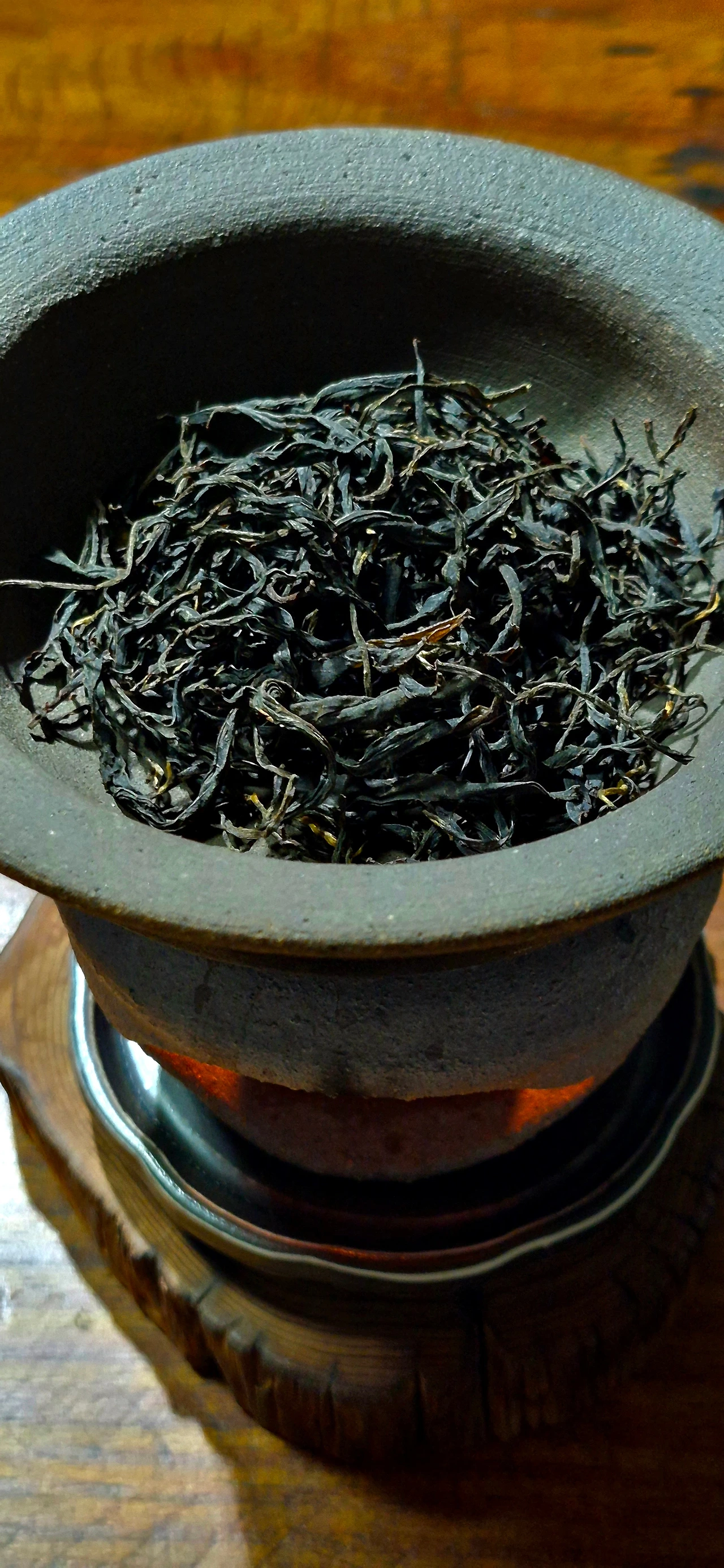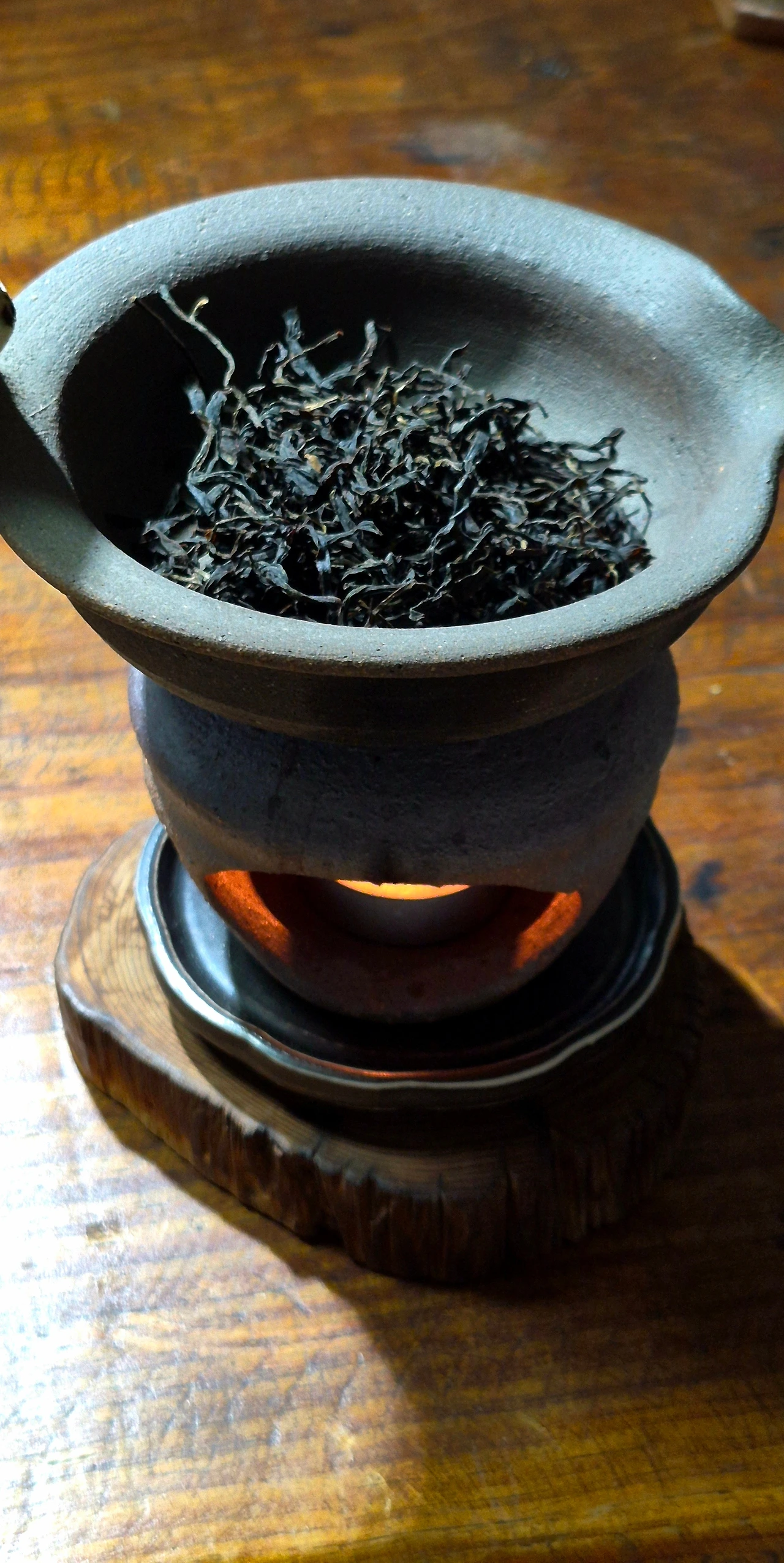 워머에 홍배기를 올리고 달군다. 차를 홍배기에 투입한다. 캔들은 화력 조정이 안 되니까, 간간이 발효차를 대나무집게로 잘 흩트려주어야 한다. 차에서 향이 올라오면 뚜껑을 덮어줘야 열기가 안으로 모아진다. 적당한 뚜껑이 없어서 개완 뚜껑으로 대신했다.