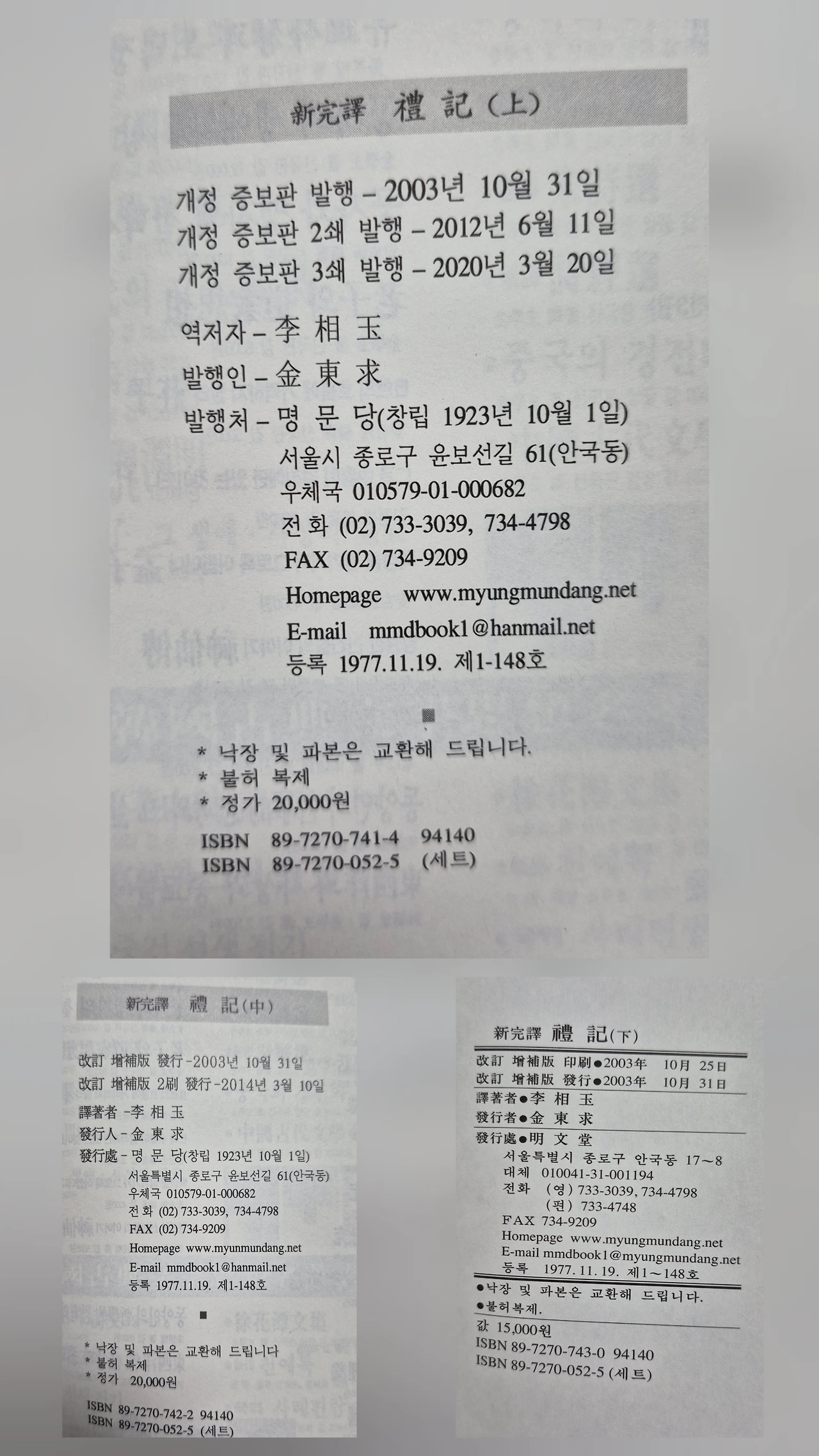 <예기>는 상중하 세 권인데, 각 권마다 다른 인쇄본을 모아서 한 질로 모아 놓은 것이었다. 상권은 2020년 증보판, 중권은 2014년 개정판, 하권은 2003년 초판본이다. 언젠가는 읽어 볼 여유가 함께 하기를 바란다.