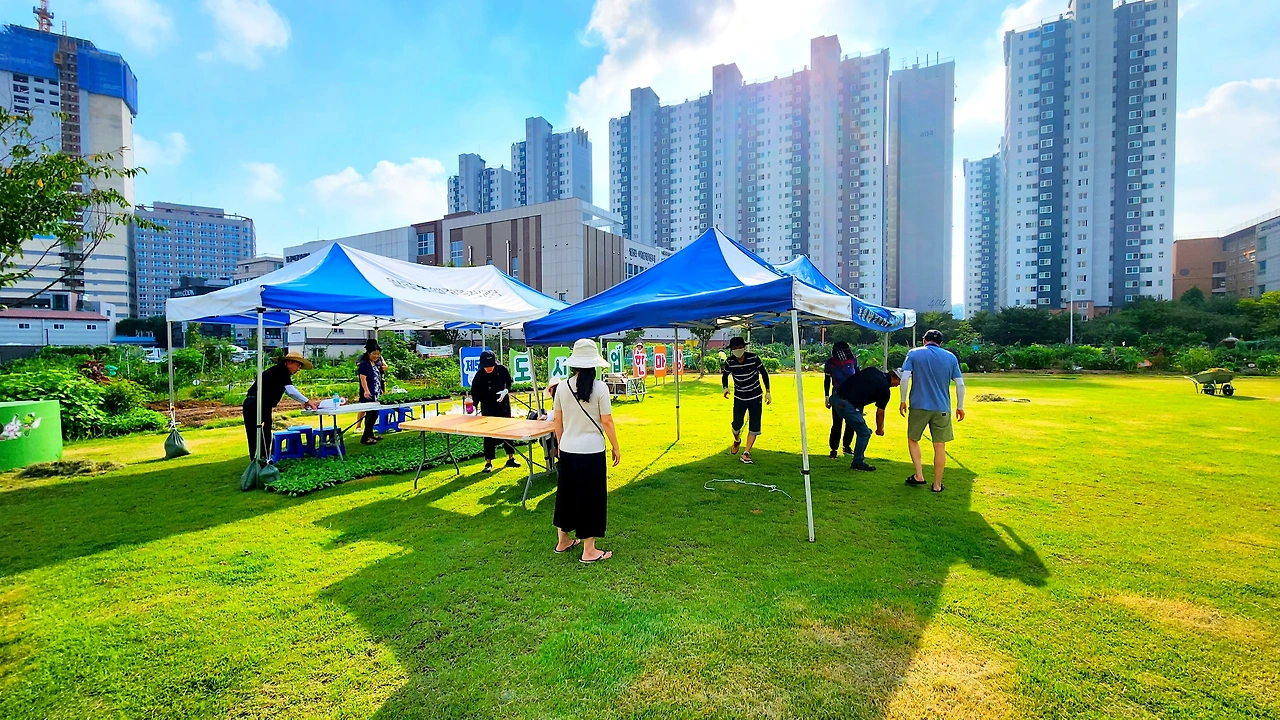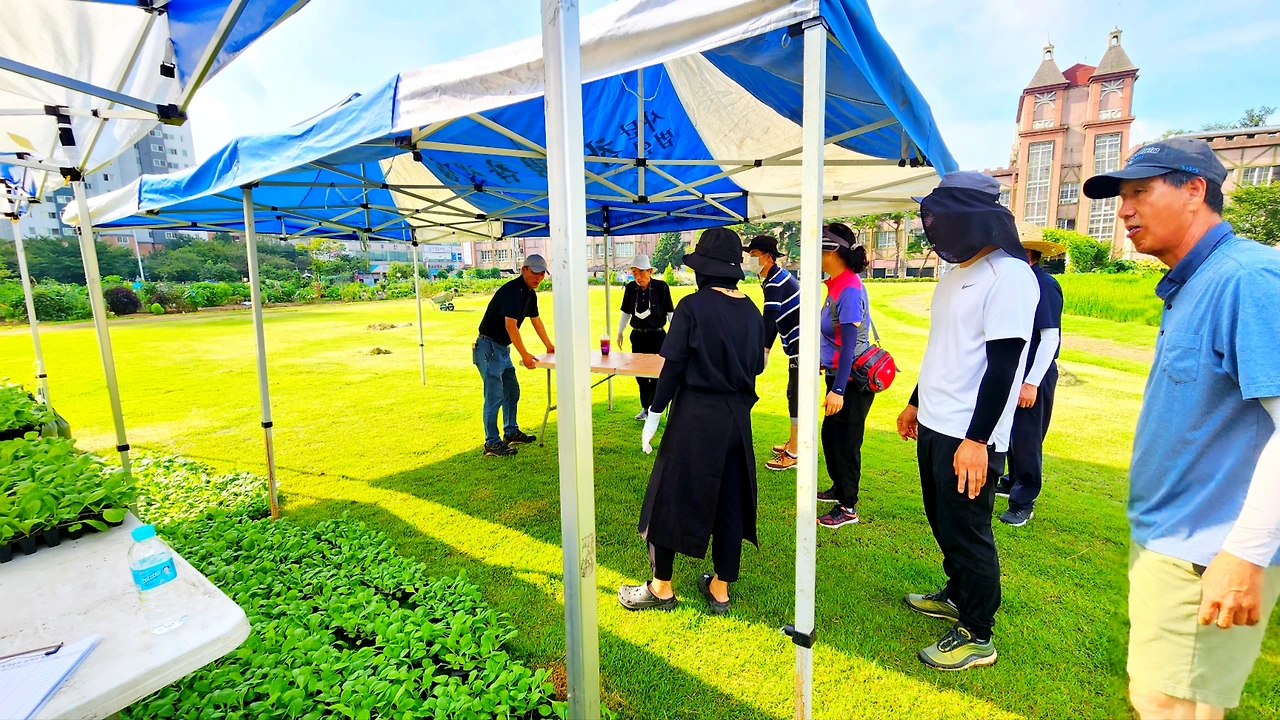 등장인물이 공간에 한 사람씩 등장하듯이 165개의 텃밭 주인들이 드문드문 나타나서 배추 모종과 쪽파 구근을 받아가는 것이다. 이 풍경은 봄날의 상추 모종 나누기와 대비된다. 봄날에는 사람들이 한 번에 몰려 나눔이 다소 정신이 없었다면, 이번에는 드문드문 오는 분들을 일일이 안내하여 질서 정연하게 나눔을 하였다. 두어 시간 동안의 일이었지만, 한낮의 시간대에는 태양 빛이 발산하는 권태로움이 있다. 게다가 사람들 역시 드문드문 온다. 운영위원들은 모두 천막 아래에서 같이 그 시간을 보내고 있다. 그렇다. 이 권태로운 태양 빛의 시간을 같이 보내는 그 자체가 바로 '일'이었다. 그리고 여러 사람이 한데 어울려 같이 있다는 바로 그것이 '에너지'였다. 사람들이 드문드문 와도 아무렇지 않게 지나갈 수 있고, 같이 즐겁게 웃으며 시간을 보낼 수 있는 것 그리고 바로 이것이 텃밭 농장을 이끄는 동력이 된다는 것도. 모여 있는 이들 자체가 즐거우면 되는 것이고, 그 에너지가 빛에 의해 퍼지는 것. 이내 각각의 텃밭에 사람들이 모종을 심었다. 사람들은 드문드문 오지만 어느새 텃밭에는 사람들이 많아졌다는 것.