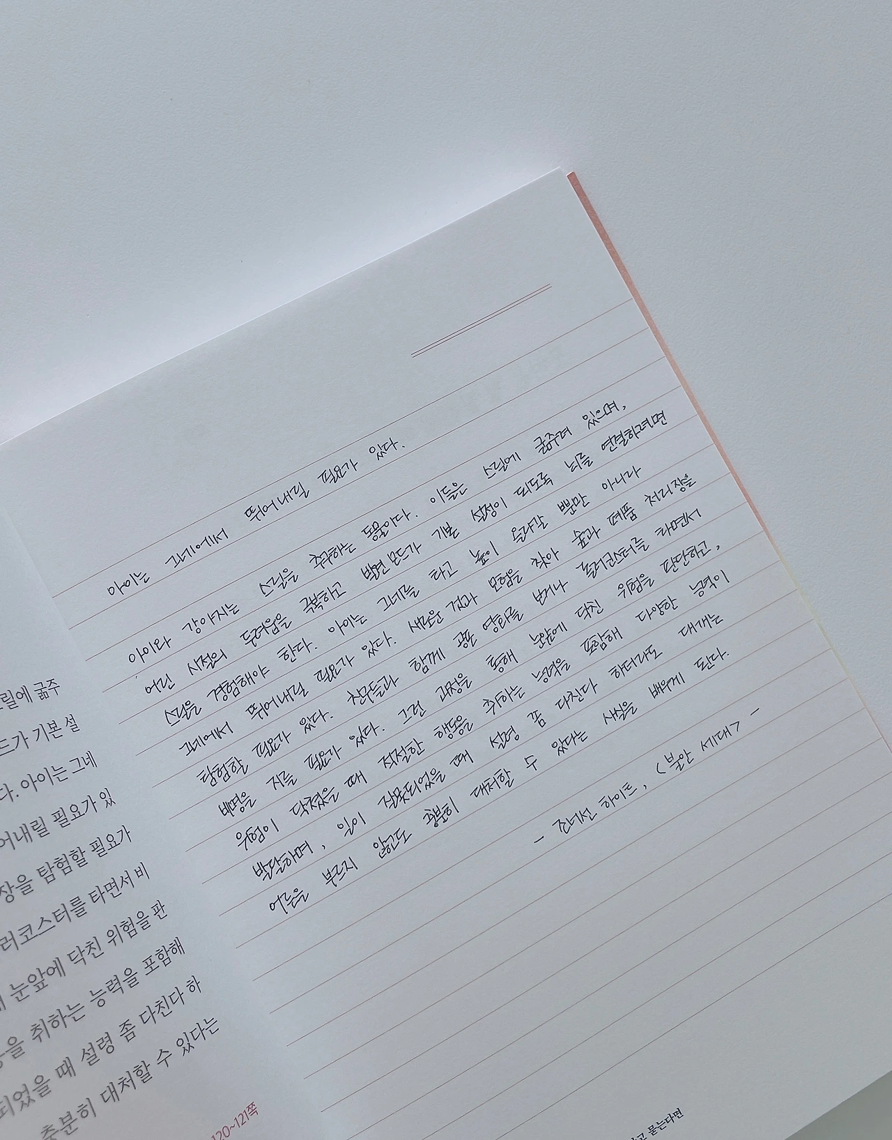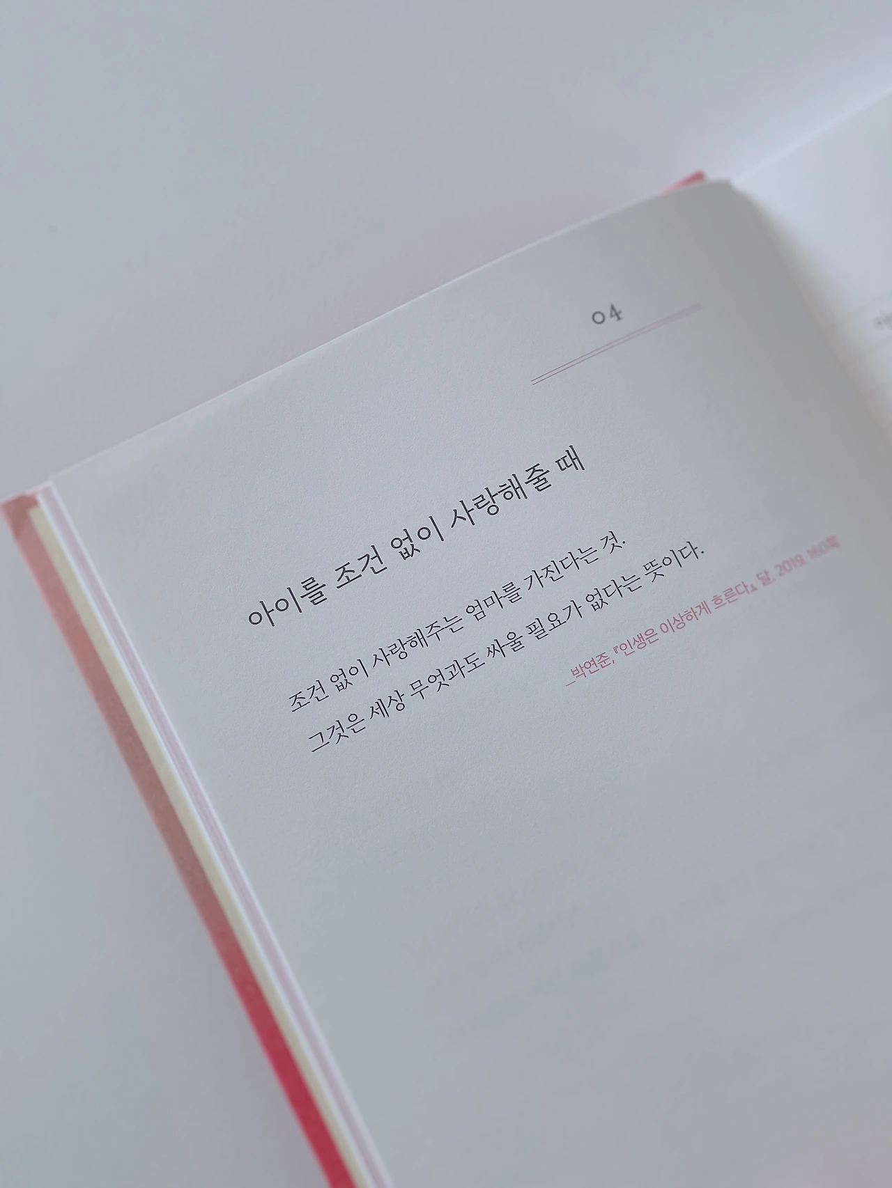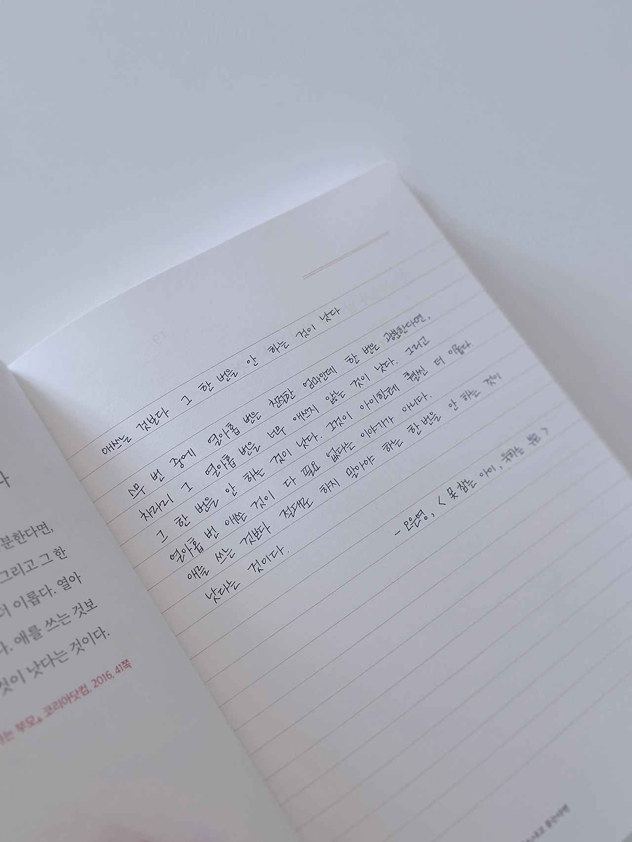 필사하며 사랑하는 아이가 애틋해서, 묵묵히 버텨내는 나 자신이 애틋해서 자꾸만 울컥하게 된다. 아이에게도, 나에게도 다정한 말을 건네며 하루를 채워가는 필사. 엄마인 나를 진심으로 위로하는 책이었다.