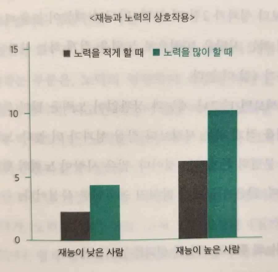 이렇게 노력의 효과가 타고난 재능에 따라 달라지는 것을 '노력-재능 상호작용'효과라고 한다. 다르게 표현하면 타고난 재능이 높은 사람은 노력하면 10점까지 결과를 낼 수 있지만, 타고난 재능이 낮은 사람은 노력해서 4점밖에 결과를 낼 수 없다. 타고난 재능이 낮은 사람에게 노력의 효과가 없는 것은 아니지만, 타고난 재능이 높은 사람과 비교하면 효과의 크기는 50퍼센트밖에 되지 않는다.