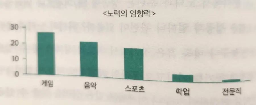 게임 분야에서의 노력은 성공과의 관계성이 26퍼센트에 불과했다. 성공의 원인 중 26퍼센트만이 노력이었고, 74퍼센트는 노력으로 설명되지 않았다. 전문 분야에서 성공한 사람들이 대부분 노력으로 성공의 원인으로 이야기하지만, 실상은 전혀 그렇지 않다. 99퍼센트 이상의 성공이 노력과 아무런 상관이 없다.