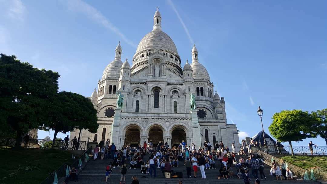 [몽마르트르 언덕 위 아름답게 위치한 샤크레쾨르 성당, 조그만 비행기를 그려 그림에 재미난 포인트를 넣었다.]