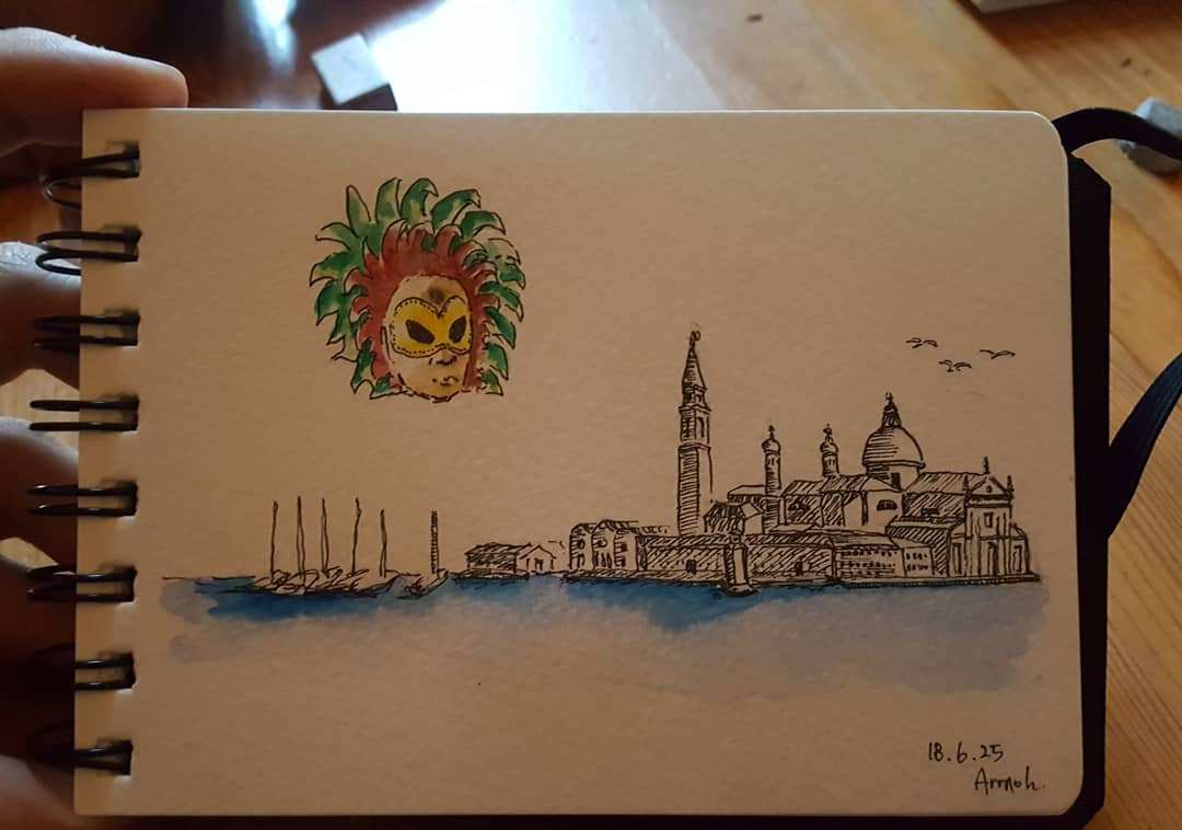 [베네치아 여행 드로잉, 베네치아임을 표현하기 위해 가면 축제 기간이 아닌데도 가면을 상징적으로 넣었다.]