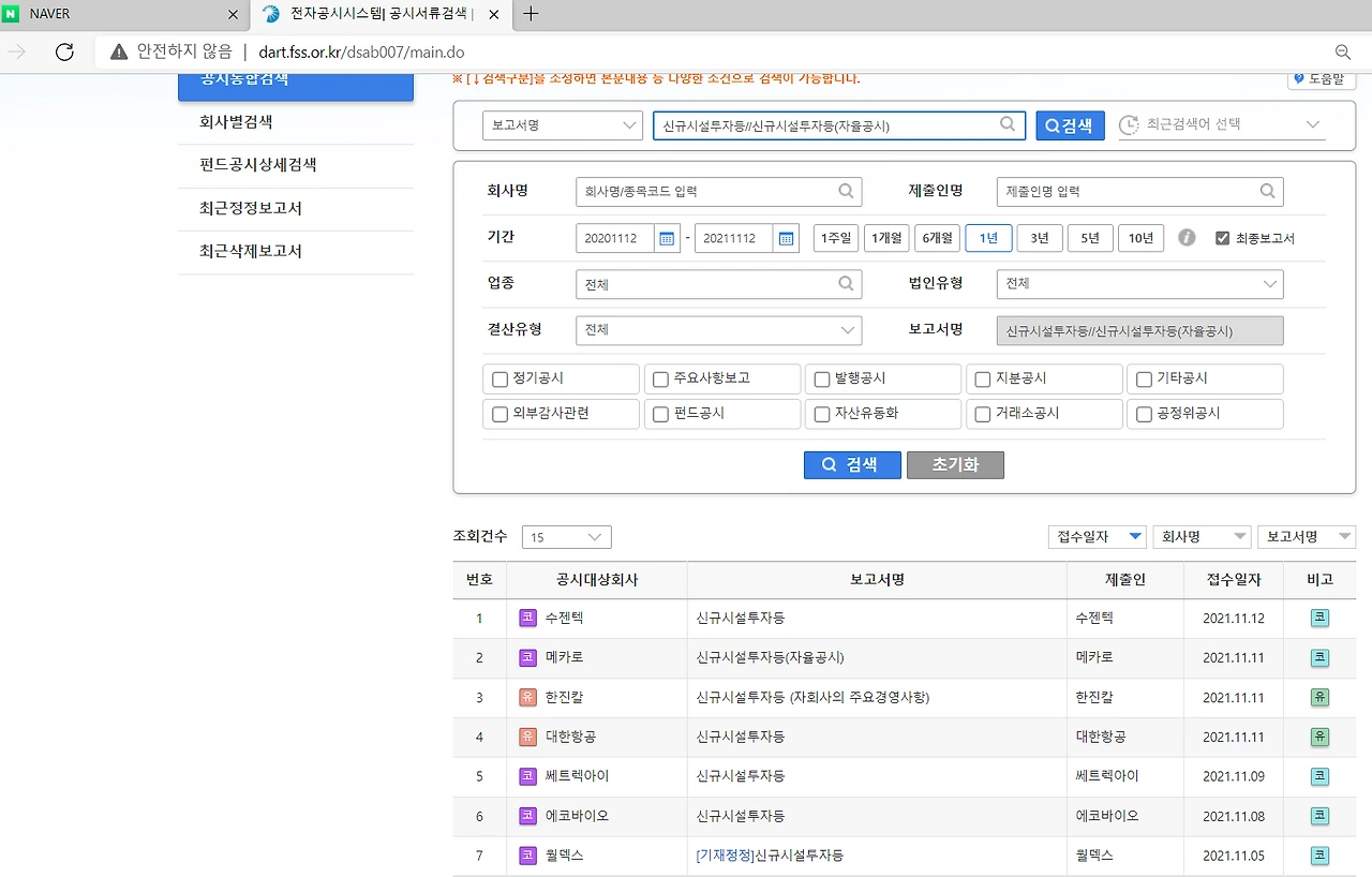 다트에서 보고서 제목으로 "신규 시설 투자"라고 검색해서 최근에 공시 뜬 거를 봤어요.