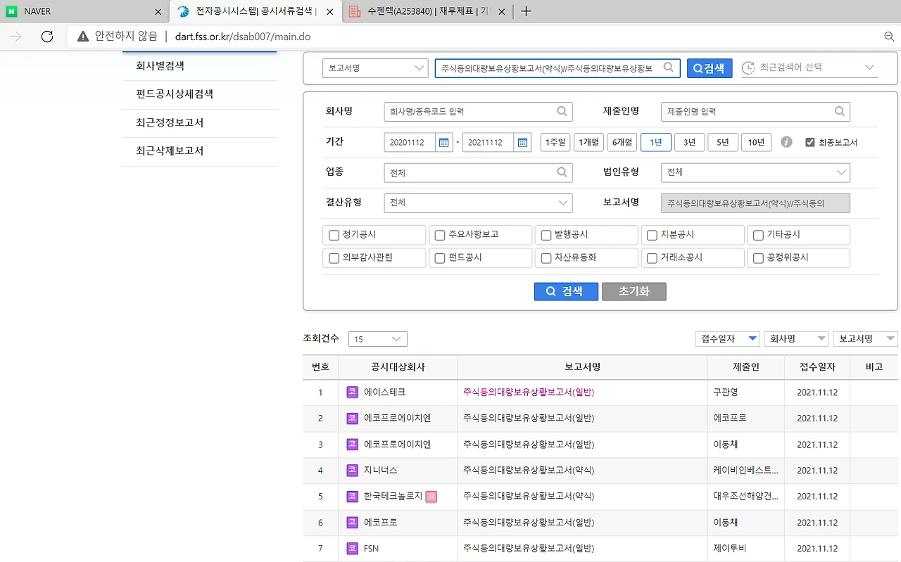 다트에 보고서 제목으로 "주식등의대량보유상황보고서"을 검색하면 나옵니다.