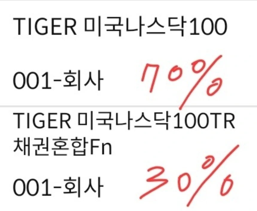 안정형 30%에서 "나스닥 100"을 더 투자하고 싶어 알아보니 "TIGER 미국나스닥 100TR 채권혼합Fn"이 있더라고요.