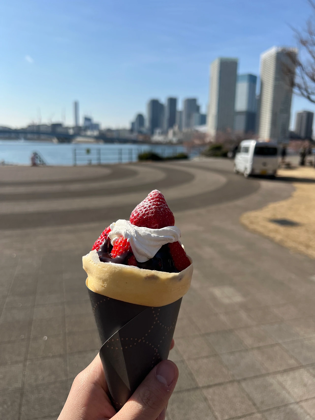 공원 한 켠에 관광객이 모여있던 크레페집에서 사먹은 초코딸기 크레페