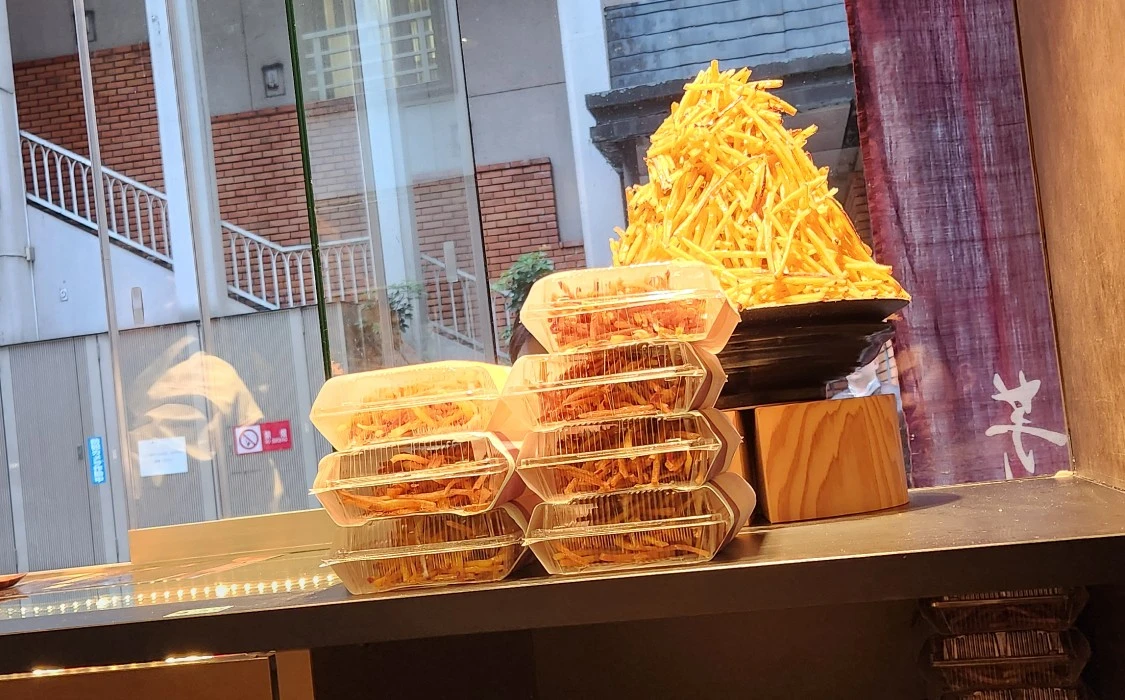 단순한 고구마 튀김을 고급 포장지에 포장해놨어. 맛은 고구마 튀김맛이더라.